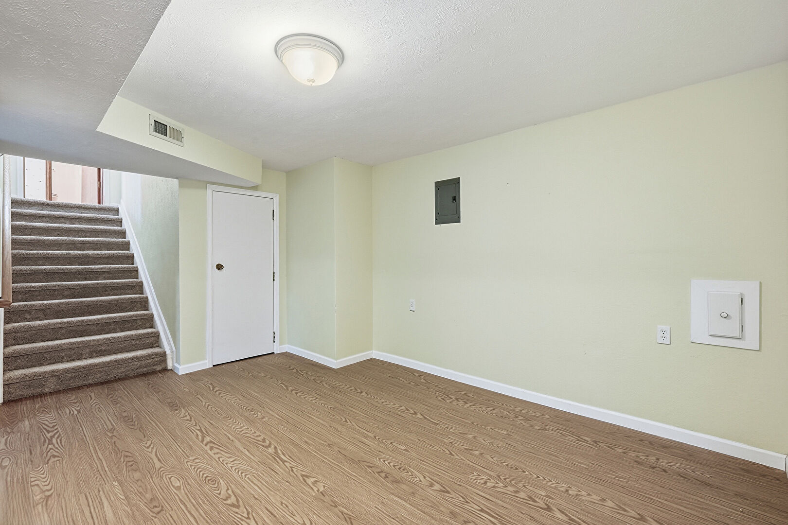 Baseboards Wall, Basement, Drywall, Electric Panel, Stairs, Textured Ceiling, Vent, Wood Finish Floor, Baseboards Wall, Electric Panel