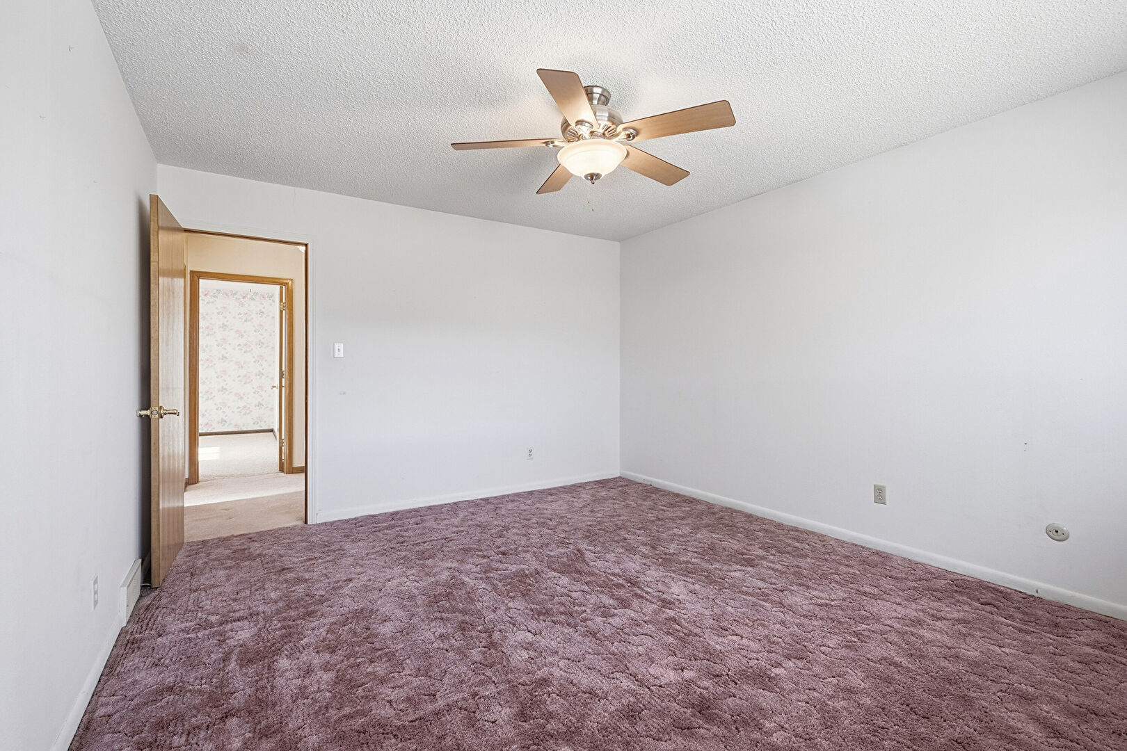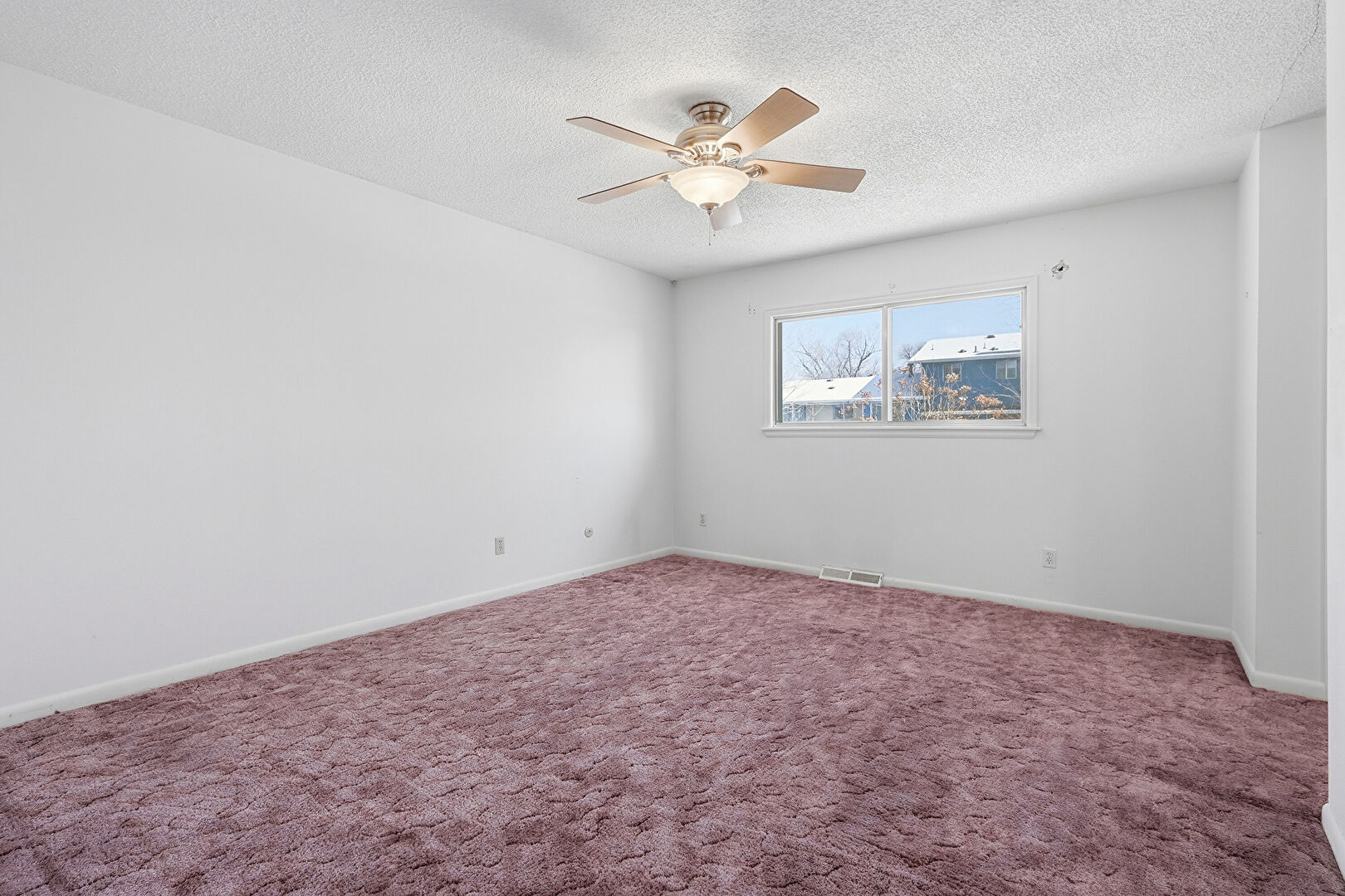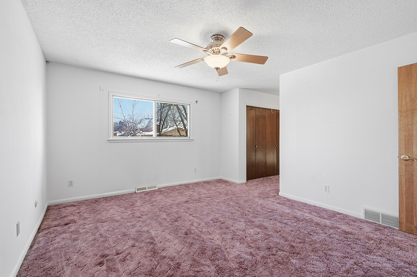 Baseboards Wall, Carpet, Ceiling Fan, Drywall, Natural Light, Textured Ceiling, Vent, Ceiling Fan, Closet, Drywall, Natural Light