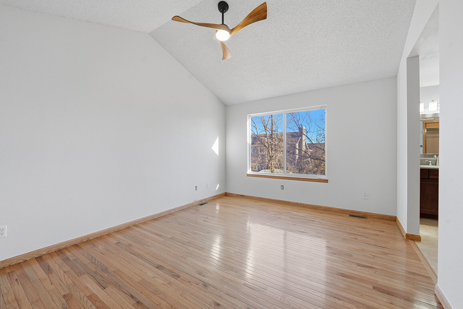 Baseboards Wall, Ceiling Fan, Drywall, Ensuite Bathroom, Natural Light, Textured Ceiling, Vaulted Ceiling, Vent, Wood Finish Floor, Vaulted Ceiling, Vent