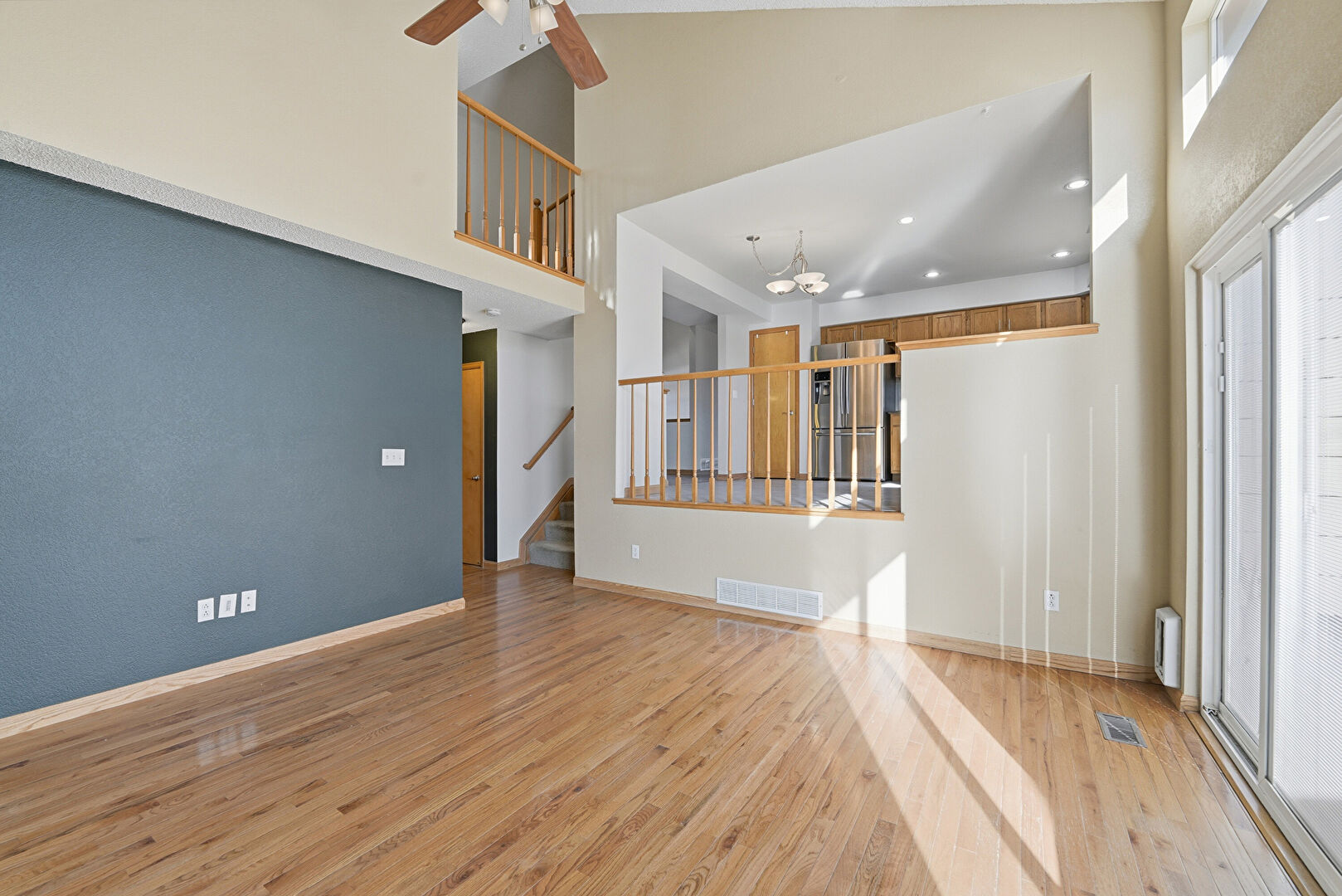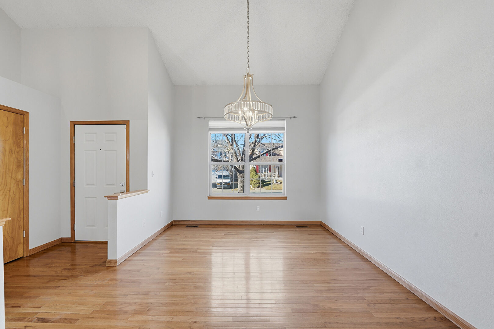 Baseboards Wall, Drywall, High Ceiling, Natural Light, Notable Chandelier, Stairs, Vaulted Ceiling, Vent, Wood Finish Floor, Natural Light, Notable Chandelier