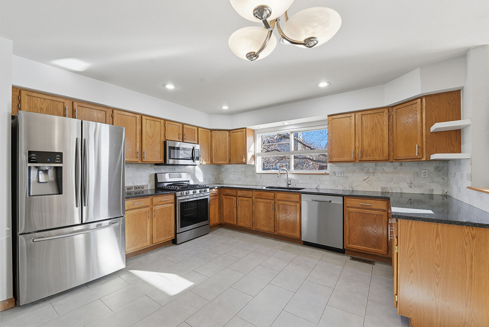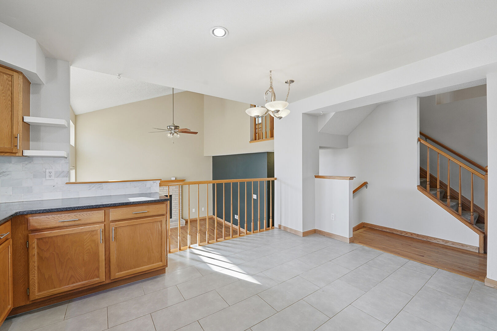 Baseboards Wall, Ceiling Fan, Drywall, Kitchen Peninsula, Medium Brown Cabinets, Natural Light, Notable Chandelier, Open Shelves, Opens To Living Area, Pendant Lighting, Shaker Cabinets, Stone Countertops, Textured Ceiling, Tile Floor, U Shaped Kitchen, Vaulted Ceiling, Vent, Open Shelves, Recessed Lighting