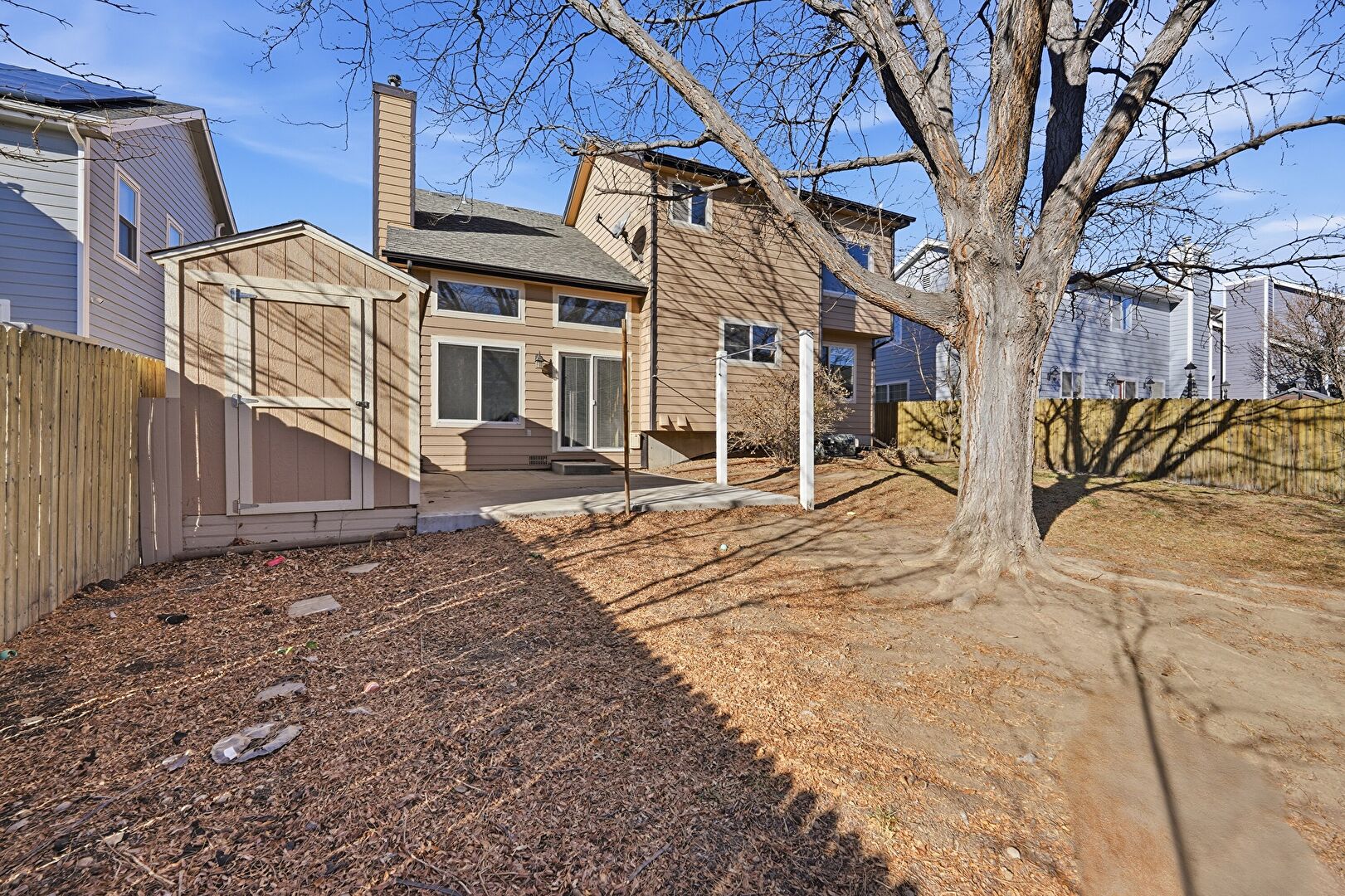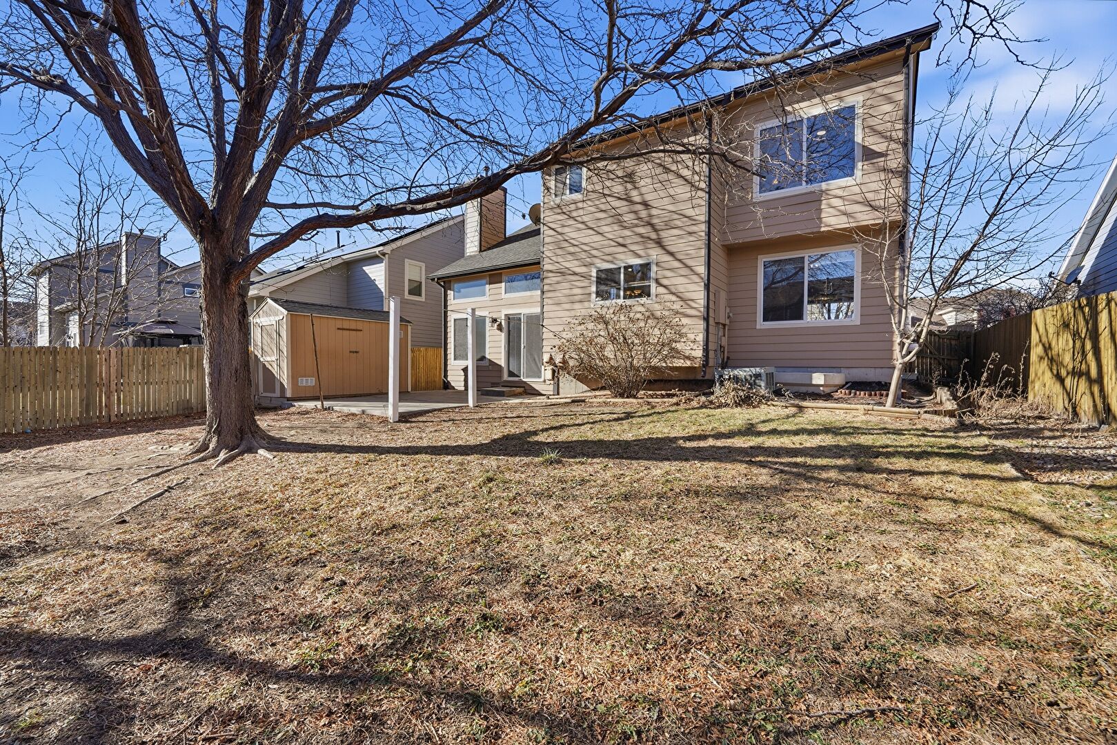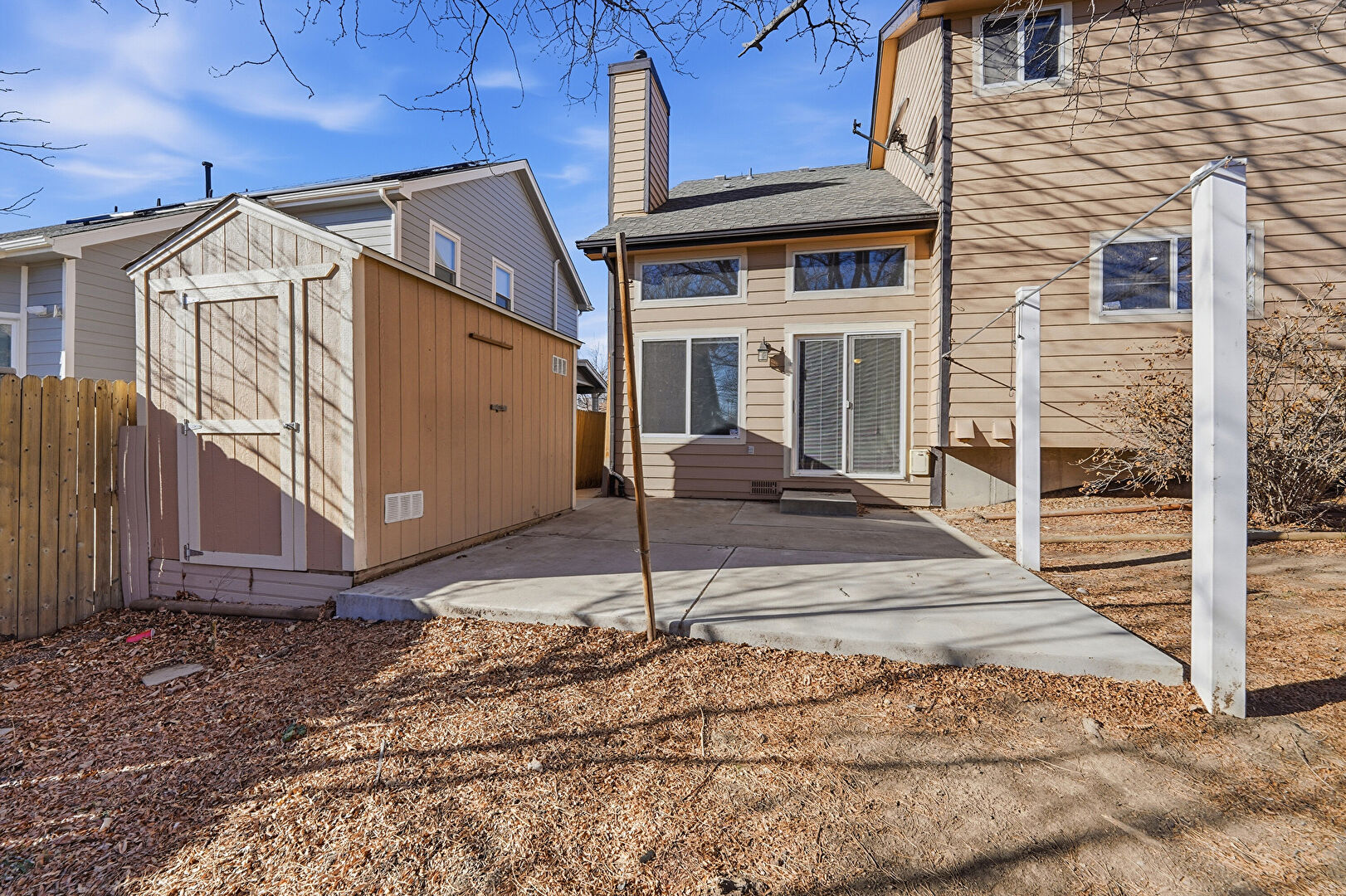 Chimney, Concrete Foundation, Downspout, Entry Steps, Fence, Gutters, Horizontal Siding, Lawn, Outdoor Structure, Patio, Satellite Dish, Shed, Shingle Roof, Downspout, Outdoor Structure, Shingle Roof