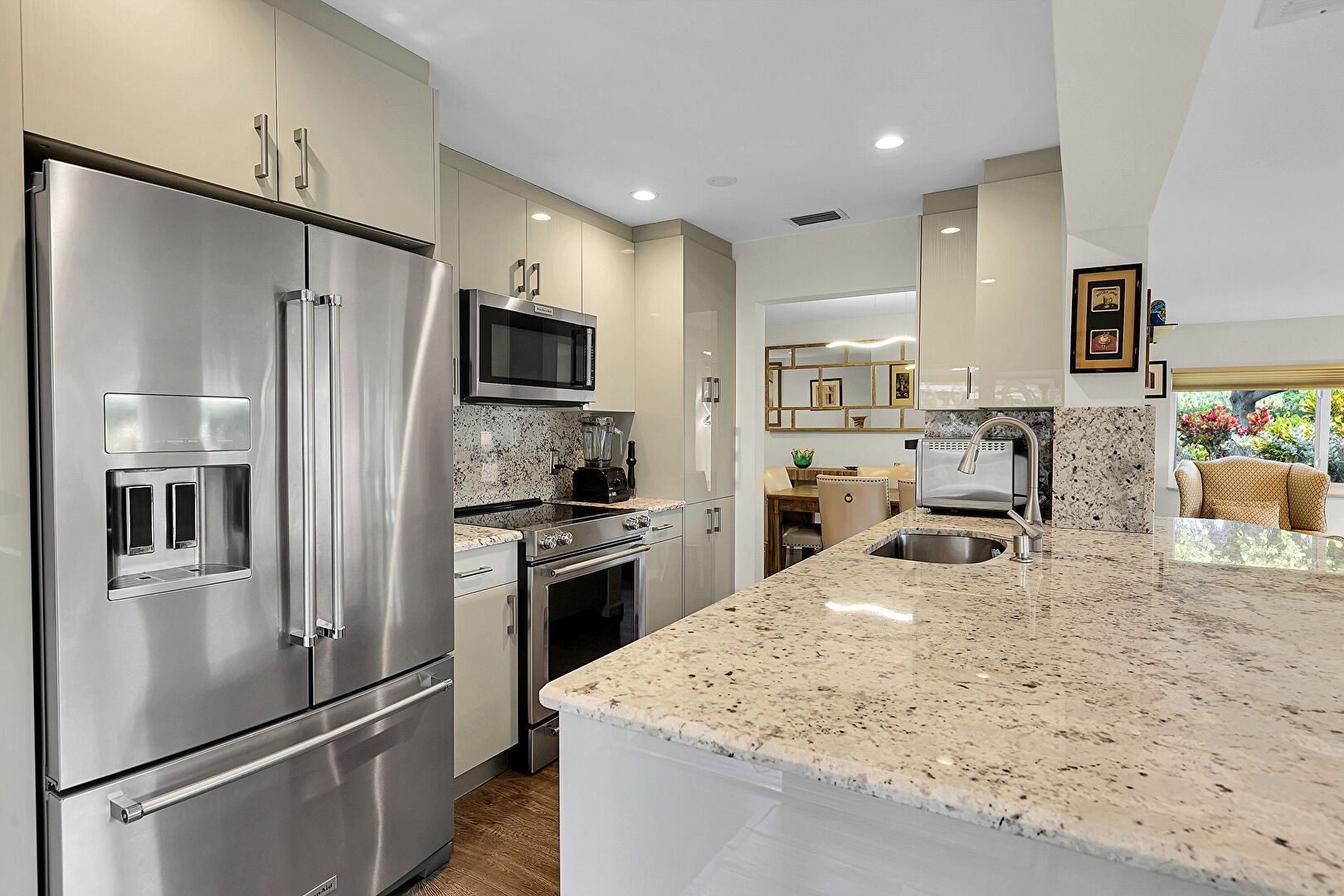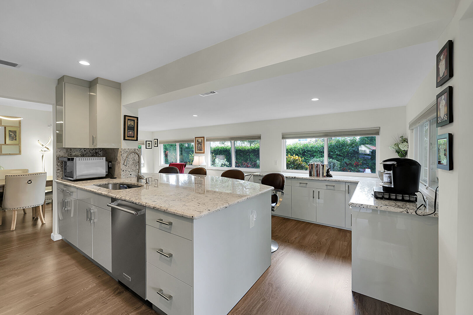 Cream Cabinets, Drywall, Flat Panel Cabinets, Gray Cabinets, Kitchen Bar, Kitchen Island, Kitchen Peninsula, Natural Light, Recessed Lighting, Stone Countertops, U Shaped Kitchen, Vent, Wood Finish Floor, Kitchen Bar, Natural Light, Recessed Lighting