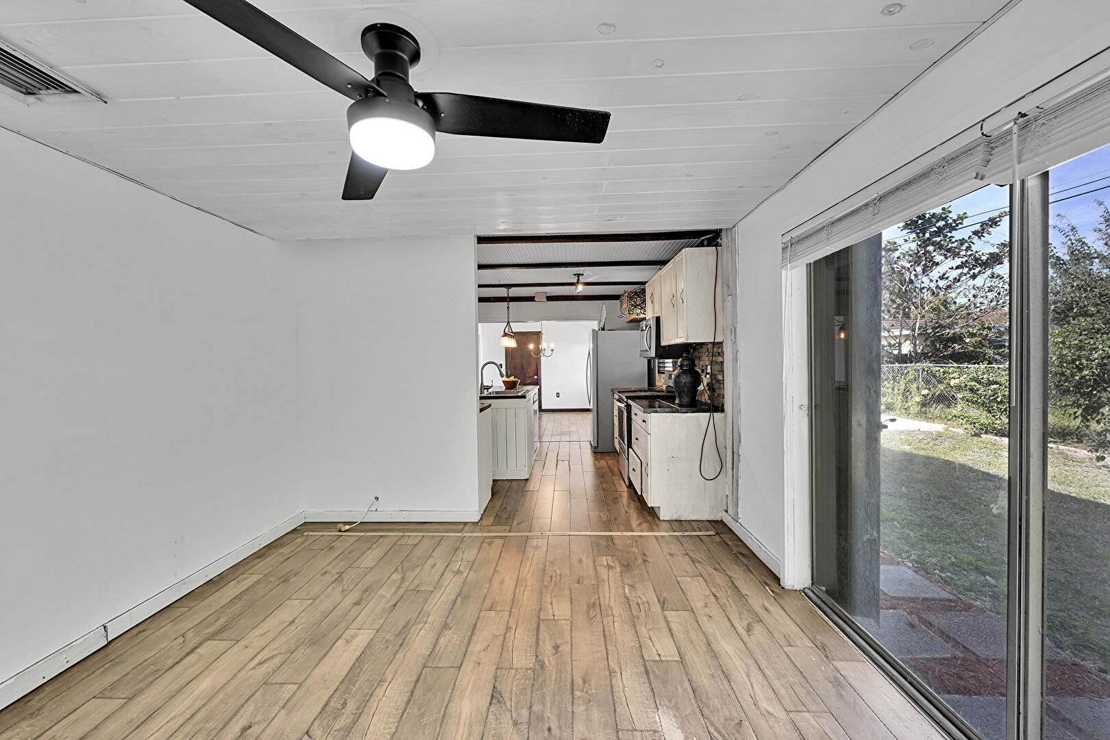Baseboards Wall, Ceiling Fan, Drywall, Galley Kitchen, Natural Light, Vent, Wood Finish Floor, Beamed Ceiling, Wood Ceiling