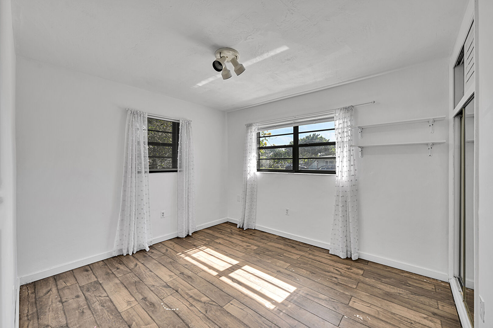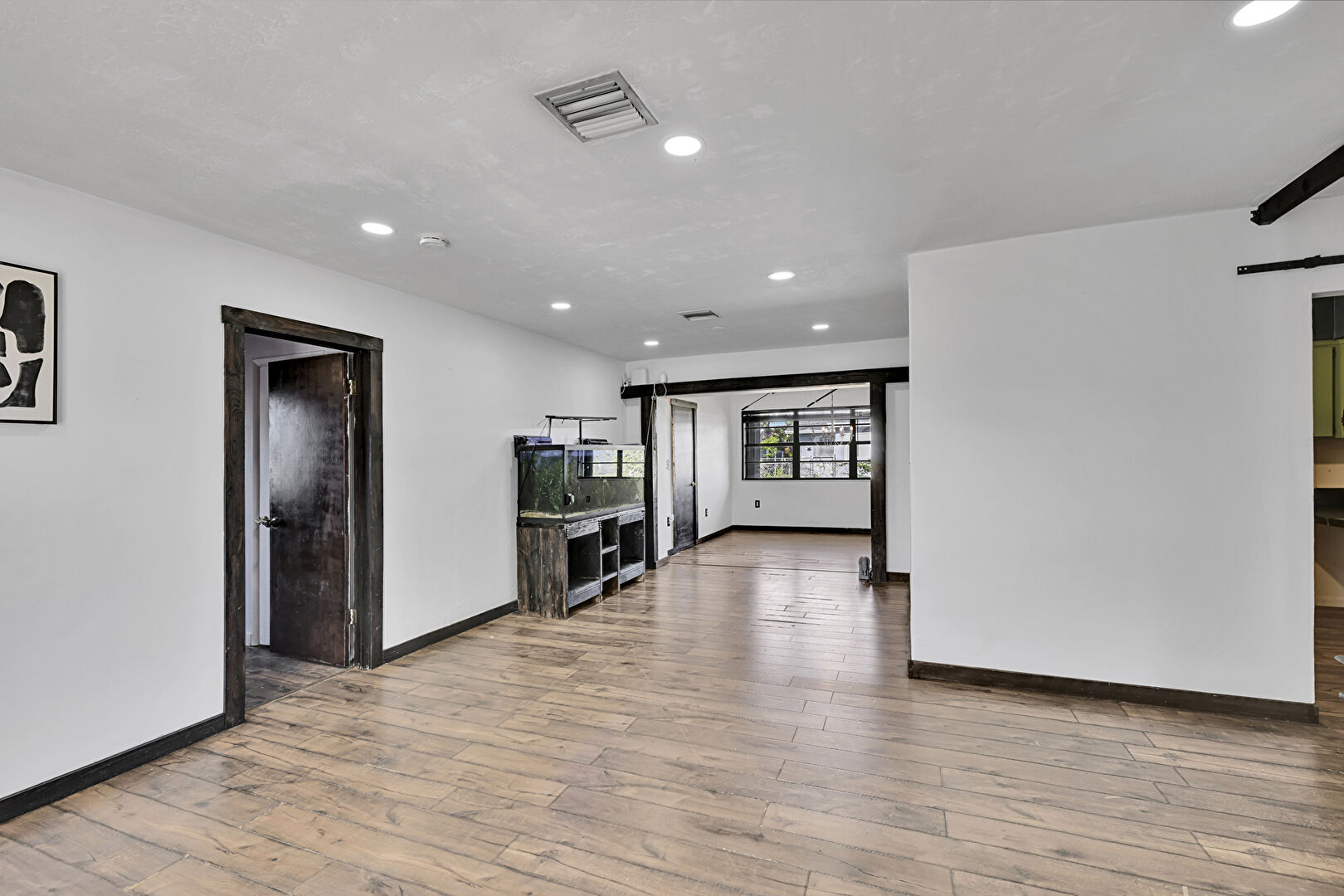 Barn Door, Baseboards Wall, Drywall, Natural Light, Recessed Lighting, Smoke Carbon Monoxide Detector, Textured Ceiling, Vent, Wood Finish Floor, Natural Light, Recessed Lighting, Textured Ceiling