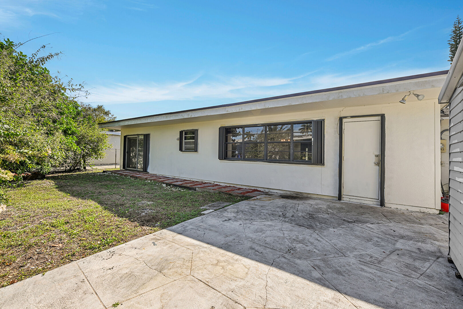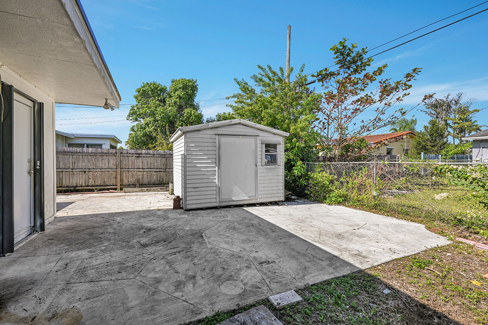 Concrete Foundation, Fence, Lawn, Outdoor Structure, Patio, Shed, Patio, Stucco Siding