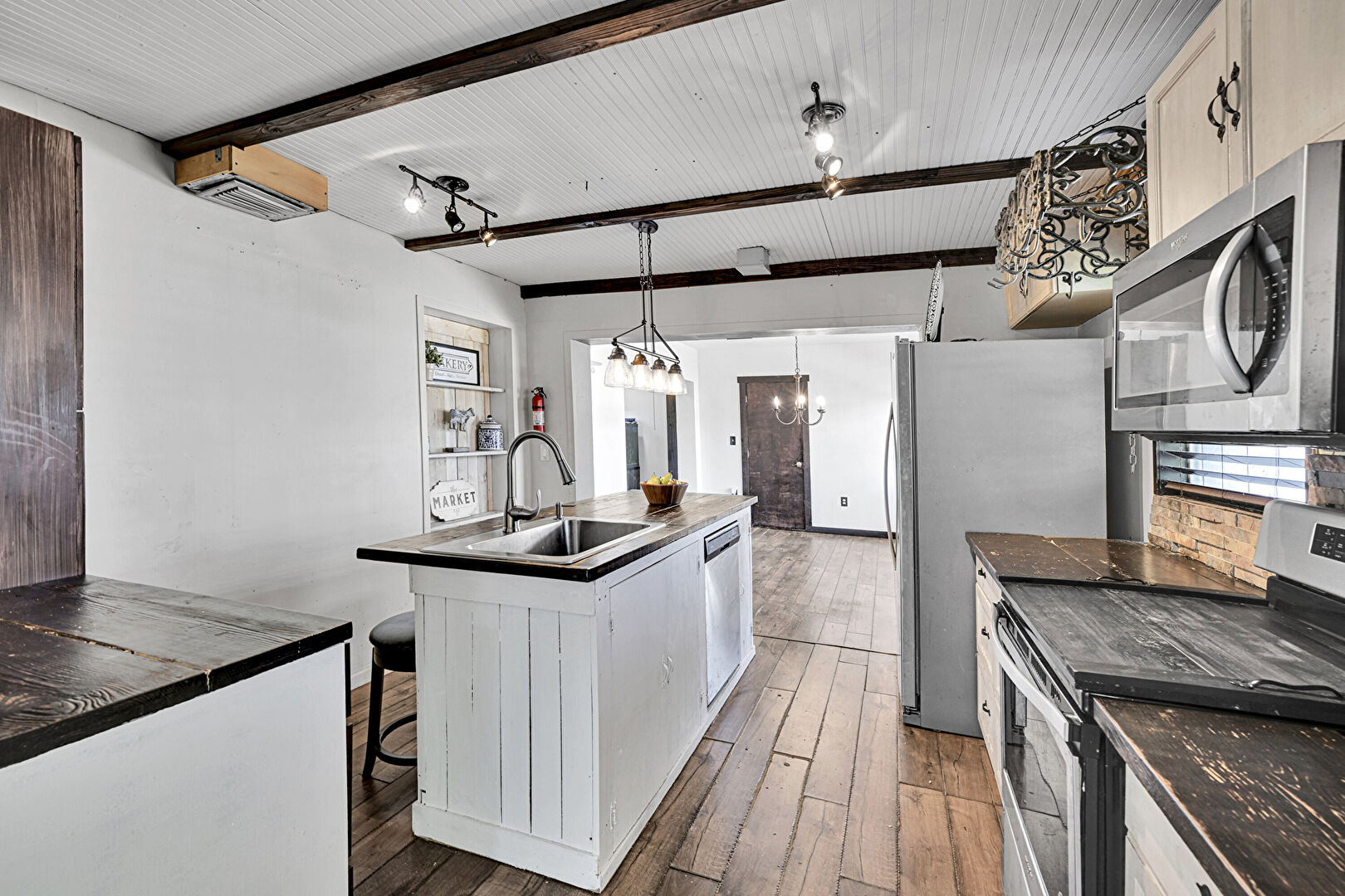 Baseboards Wall, Beamed Ceiling, Butcher Block Countertops, Drywall, Fire Extinguisher, Kitchen Bar, Kitchen Island, Natural Light, Notable Chandelier, One Wall Kitchen, Pendant Lighting, Shaker Cabinets, Visible Hinge Cabinets, Wall Mounted Ac, Wine Cooler, Wood Ceiling, Wood Finish Floor, Kitchen Bar, Natural Light