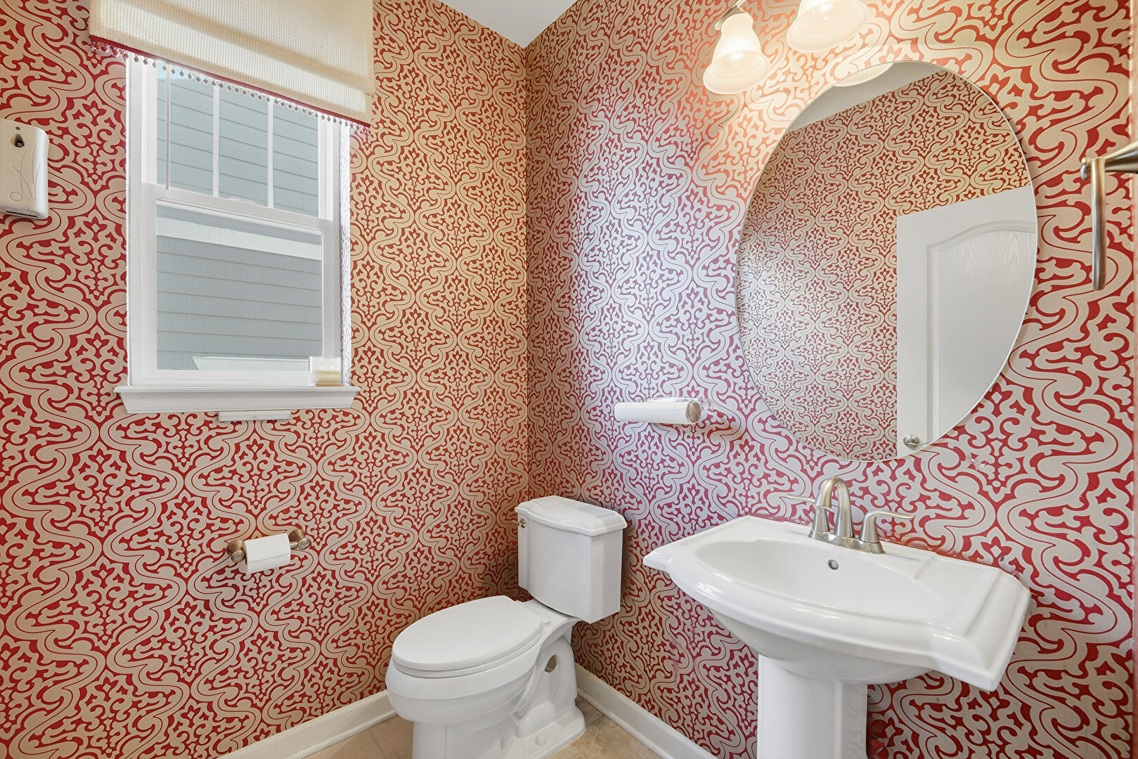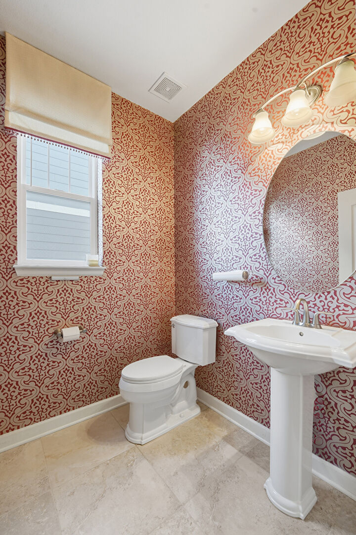 Baseboards Wall, Double Vanity, Full Bathroom, Half Bathroom, Natural Light, Vent, Wallpaper Wall, Baseboards Wall, Half Bathroom, Tile Floor