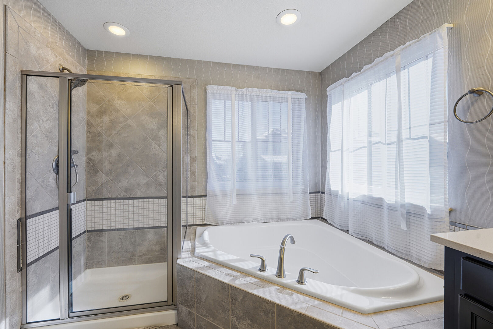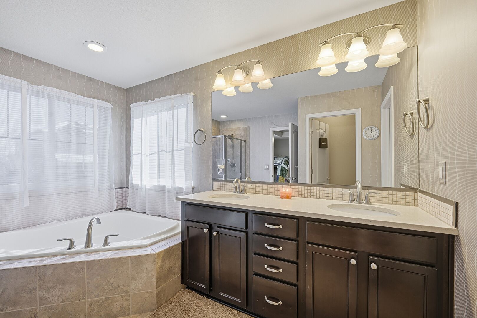 Baseboards Wall, Double Vanity, Full Bathroom, Natural Light, Recessed Lighting, Vanity, Walk In Closet, Wallpaper Wall, Double Vanity, Full Bathroom, Natural Light