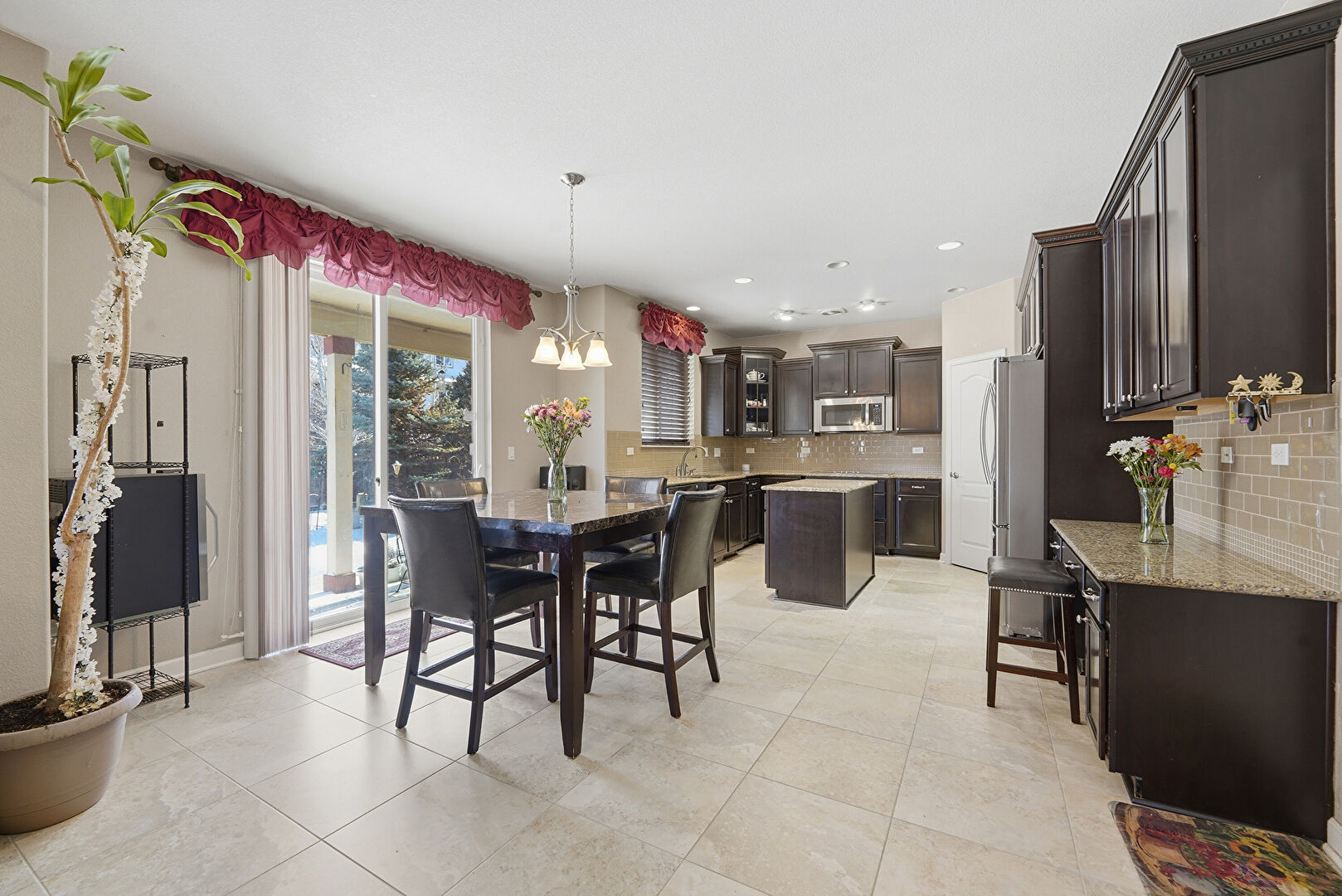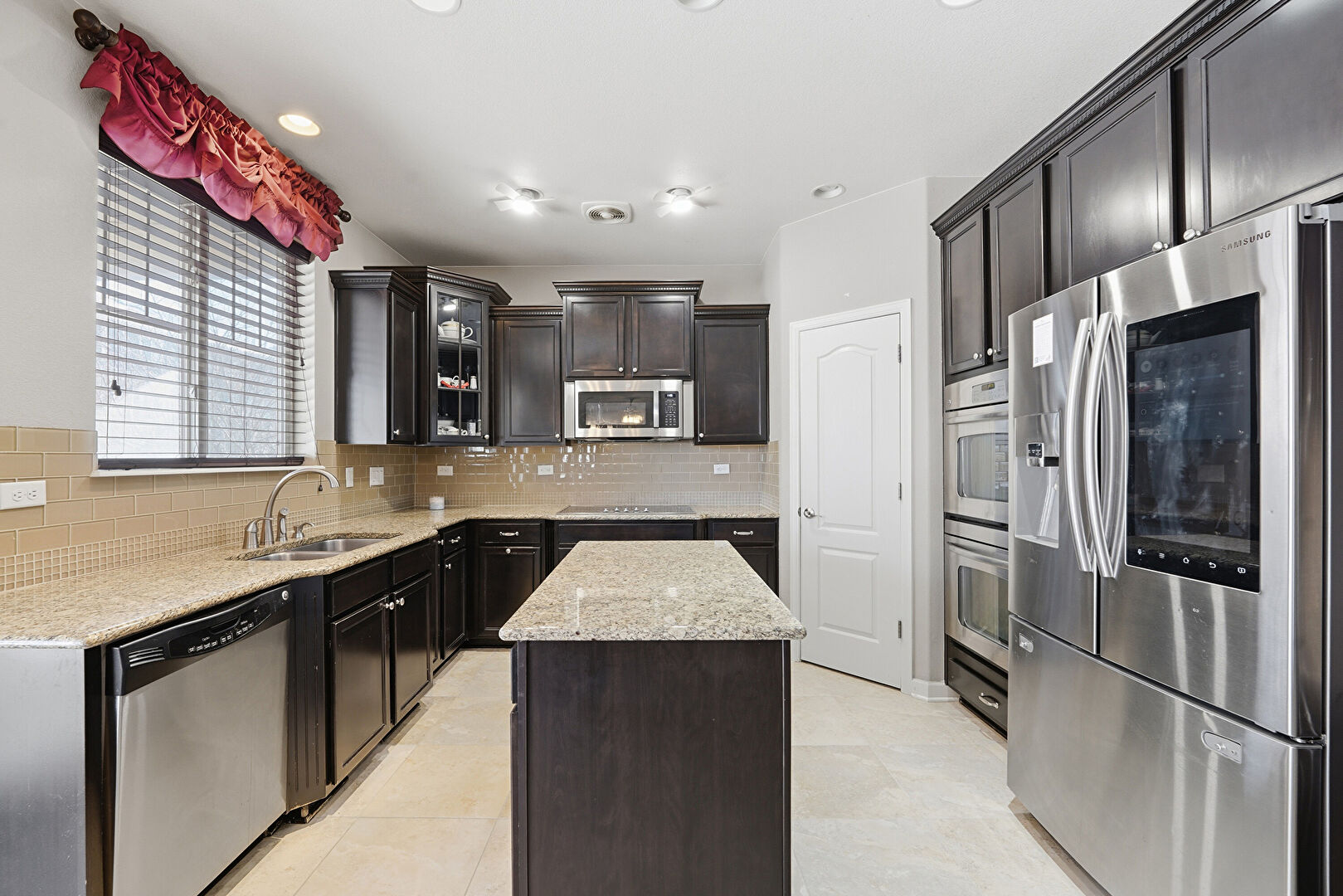Black Cabinets, Ceiling Fan, Crown Molding Cabinets, Dark Brown Cabinets, Double Oven, Drywall, Fireplace, Glass Insert Cabinets, Kitchen Island, Natural Light, Opens To Living Area, Pendant Lighting, Recessed Lighting, Shaker Cabinets, Stone Countertops, Tile Floor, U Shaped Kitchen, Ceiling Fan, Dark Brown Cabinets, Double Oven, Glass Insert Cabinets, Natural Light, Stone Countertops