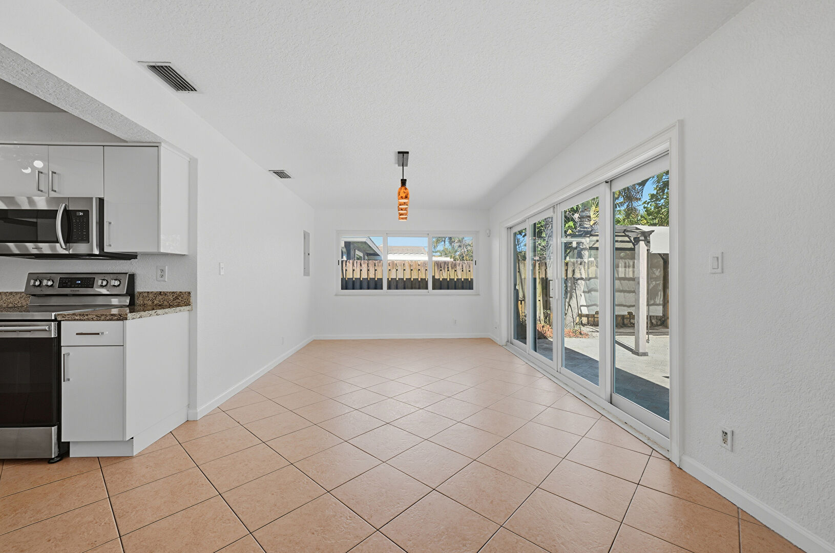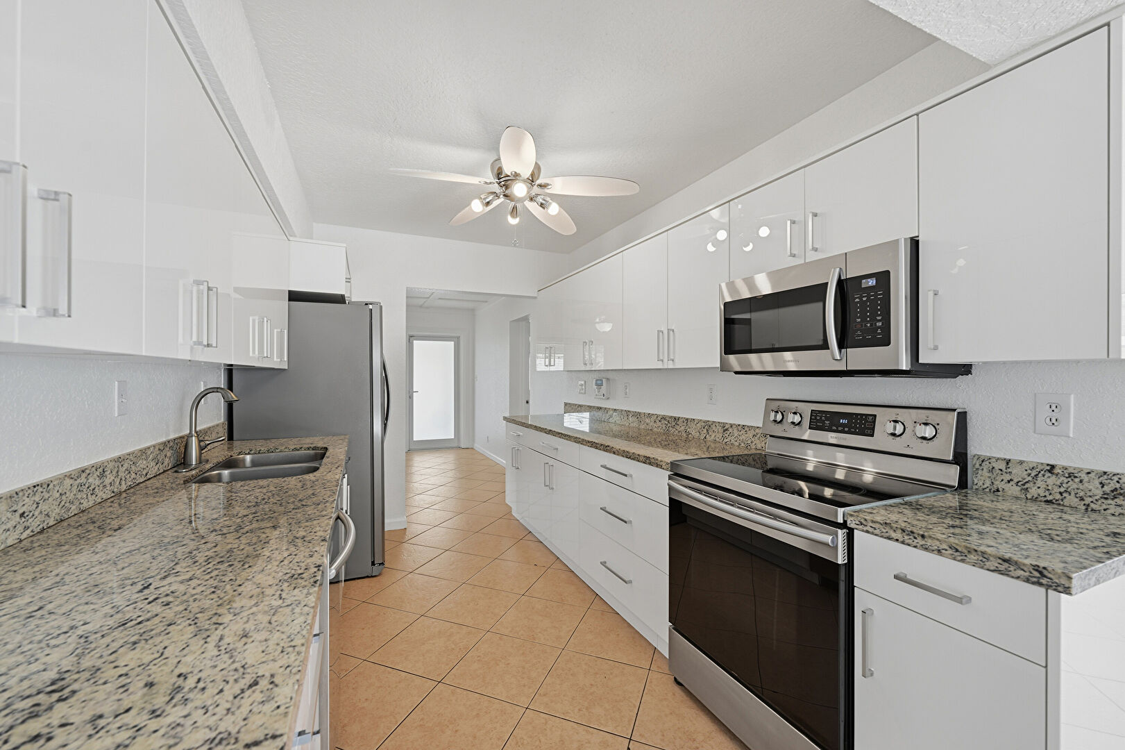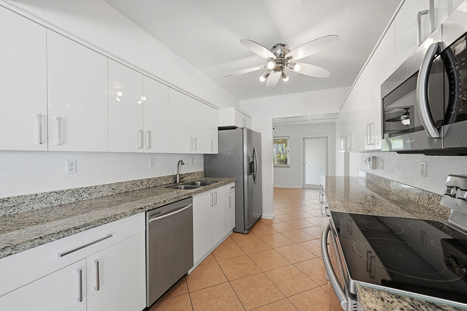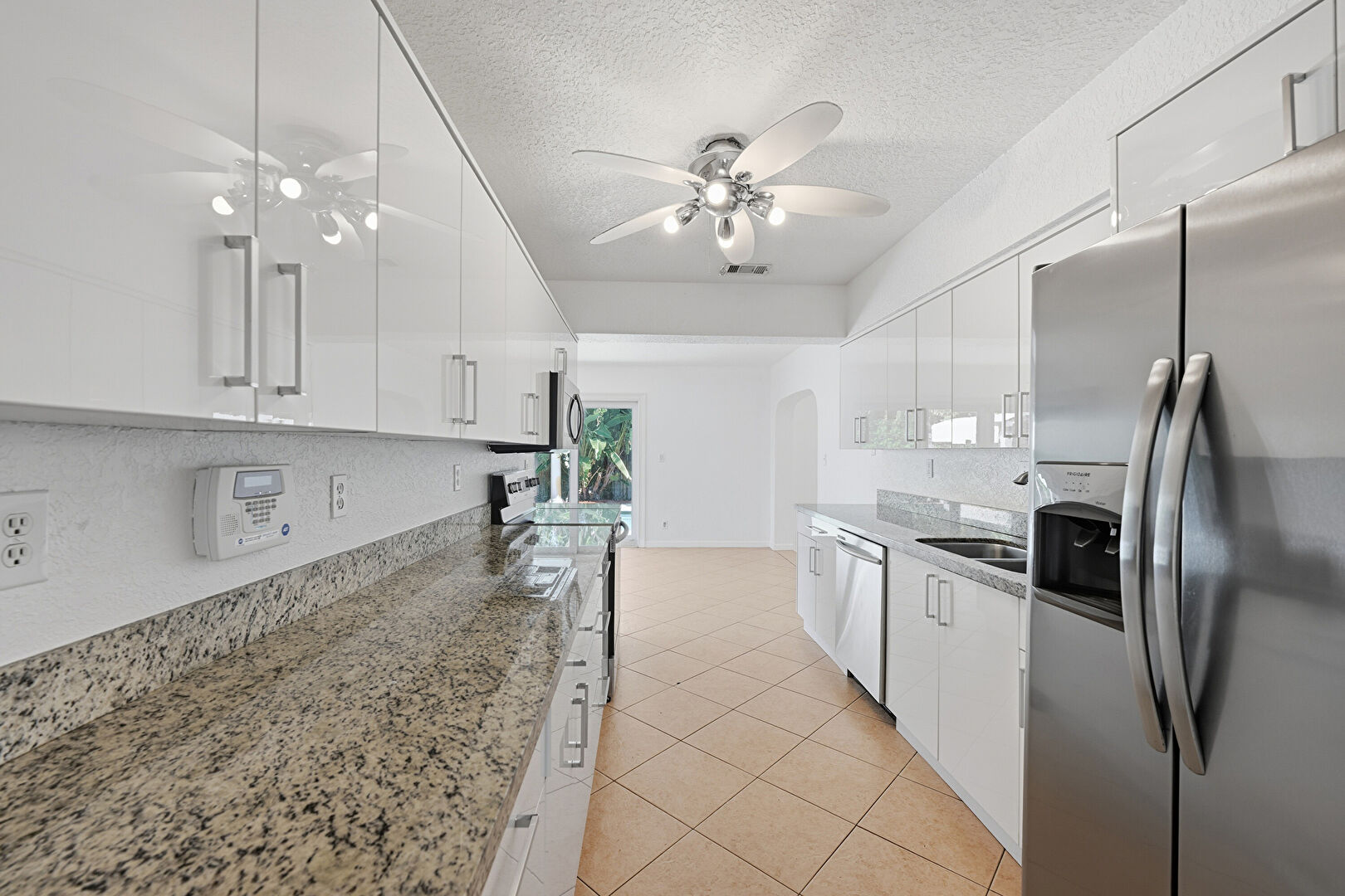 Arched Walkways, Baseboards Wall, Ceiling Fan, Drywall, Flat Panel Cabinets, Natural Light, Stone Countertops, Textured Ceiling, Tile Floor, Vent, Flat Panel Cabinets, Natural Light, Textured Ceiling