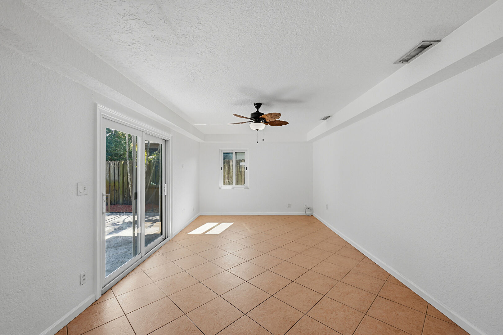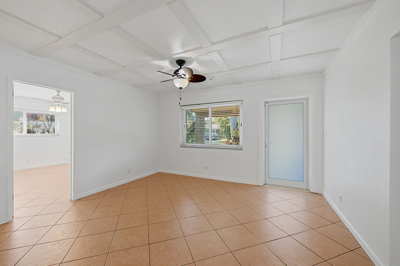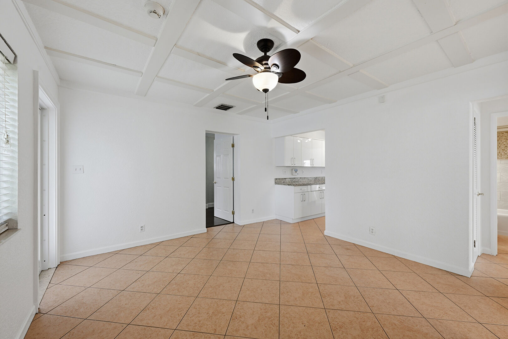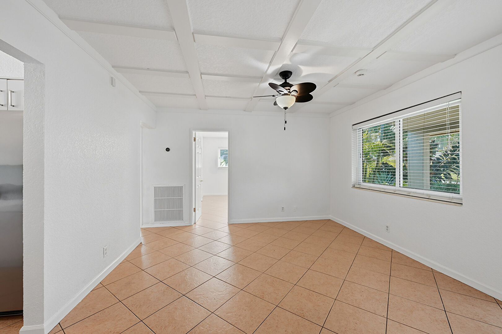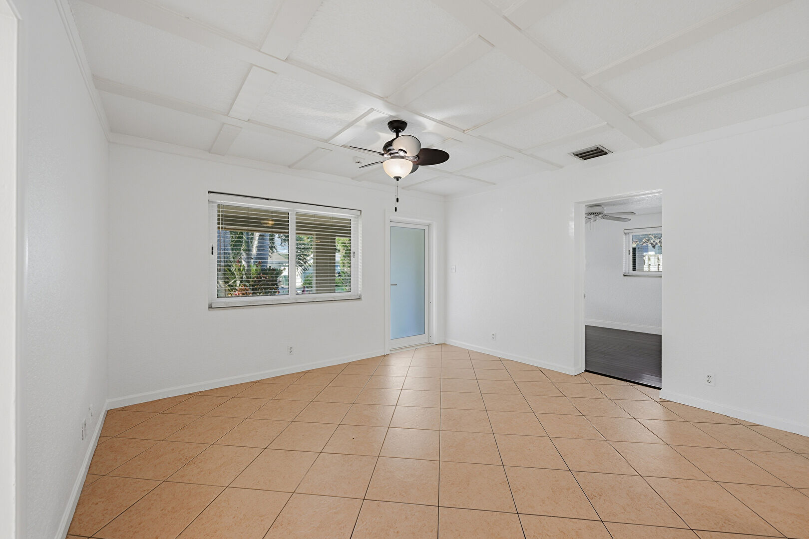Baseboards Wall, Beamed Ceiling, Ceiling Fan, Coffered Ceiling, Drywall, Natural Light, Tile Floor, Vent, Baseboards Wall, Ceiling Fan