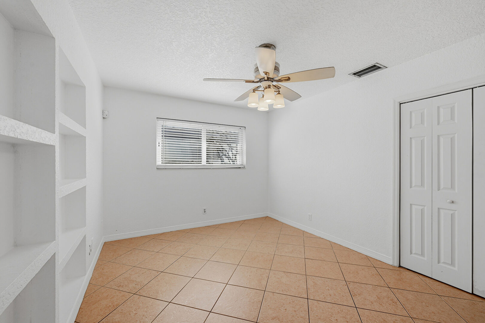 Baseboards Wall, Built In Shelves, Ceiling Fan, Closet, Drywall, Natural Light, Recessed Lighting, Textured Ceiling, Textured Wall, Tile Floor, Vent, Wood Finish Floor, Built In Shelves, Drywall, Natural Light, Textured Ceiling, Wood Finish Floor