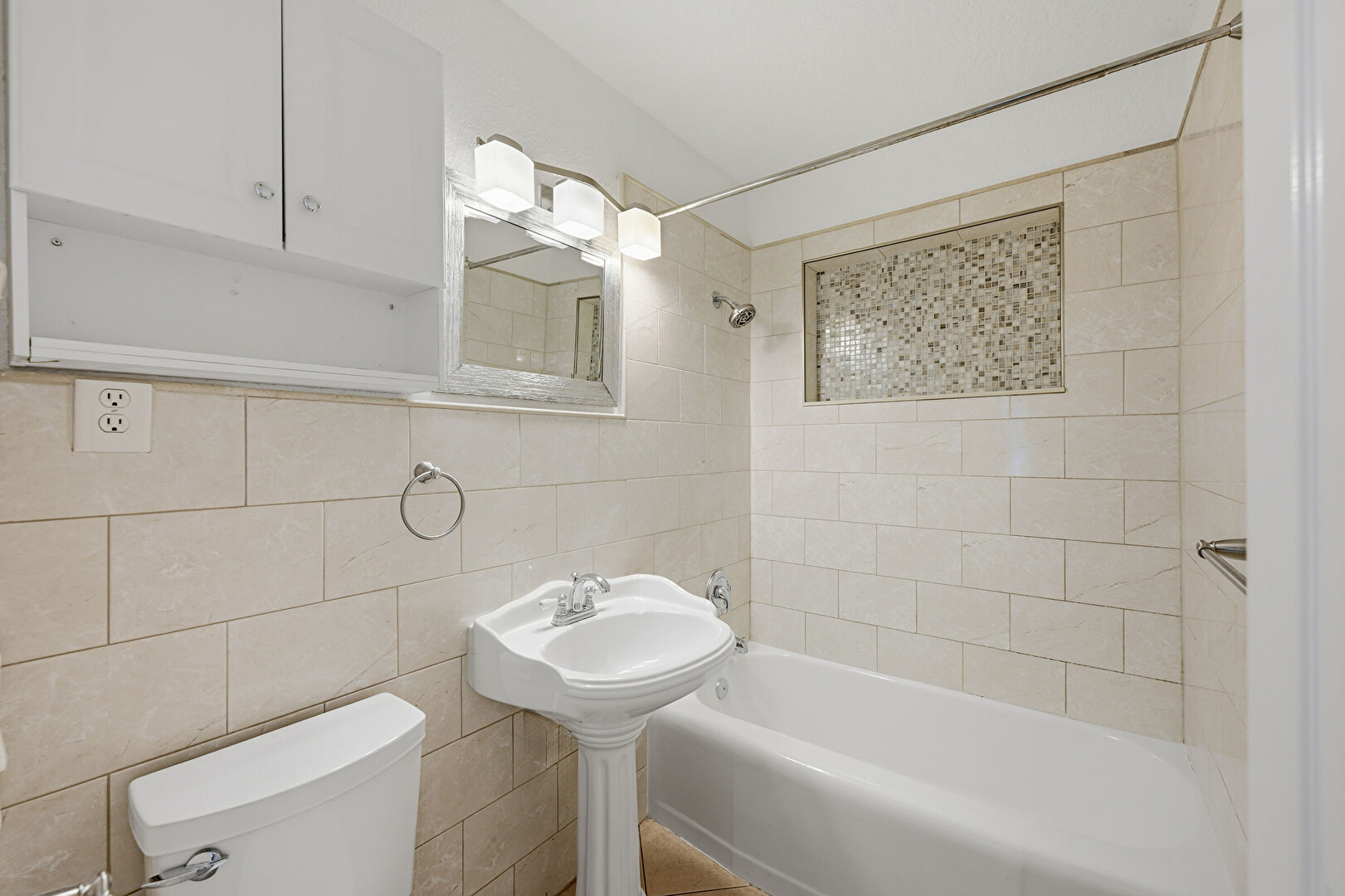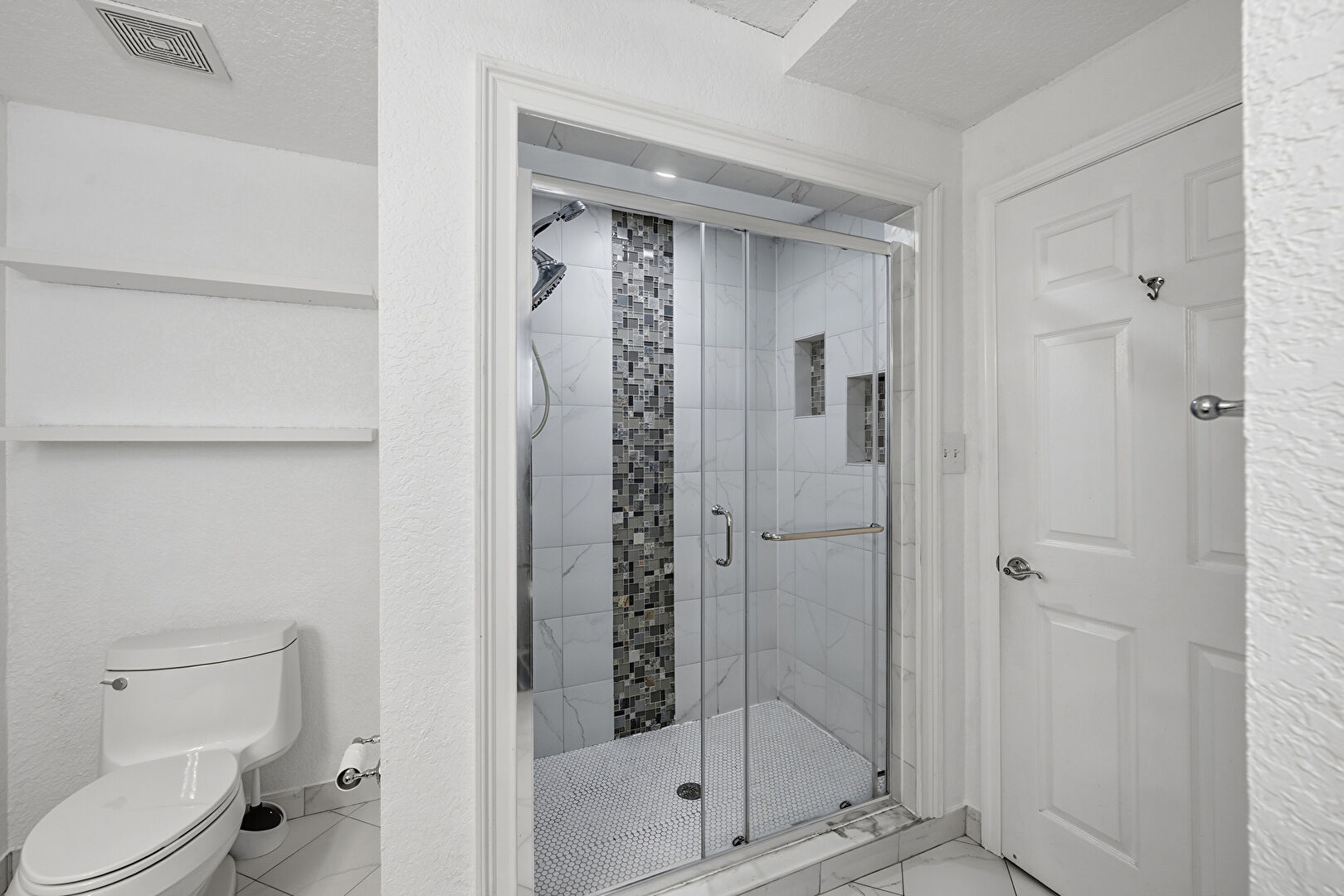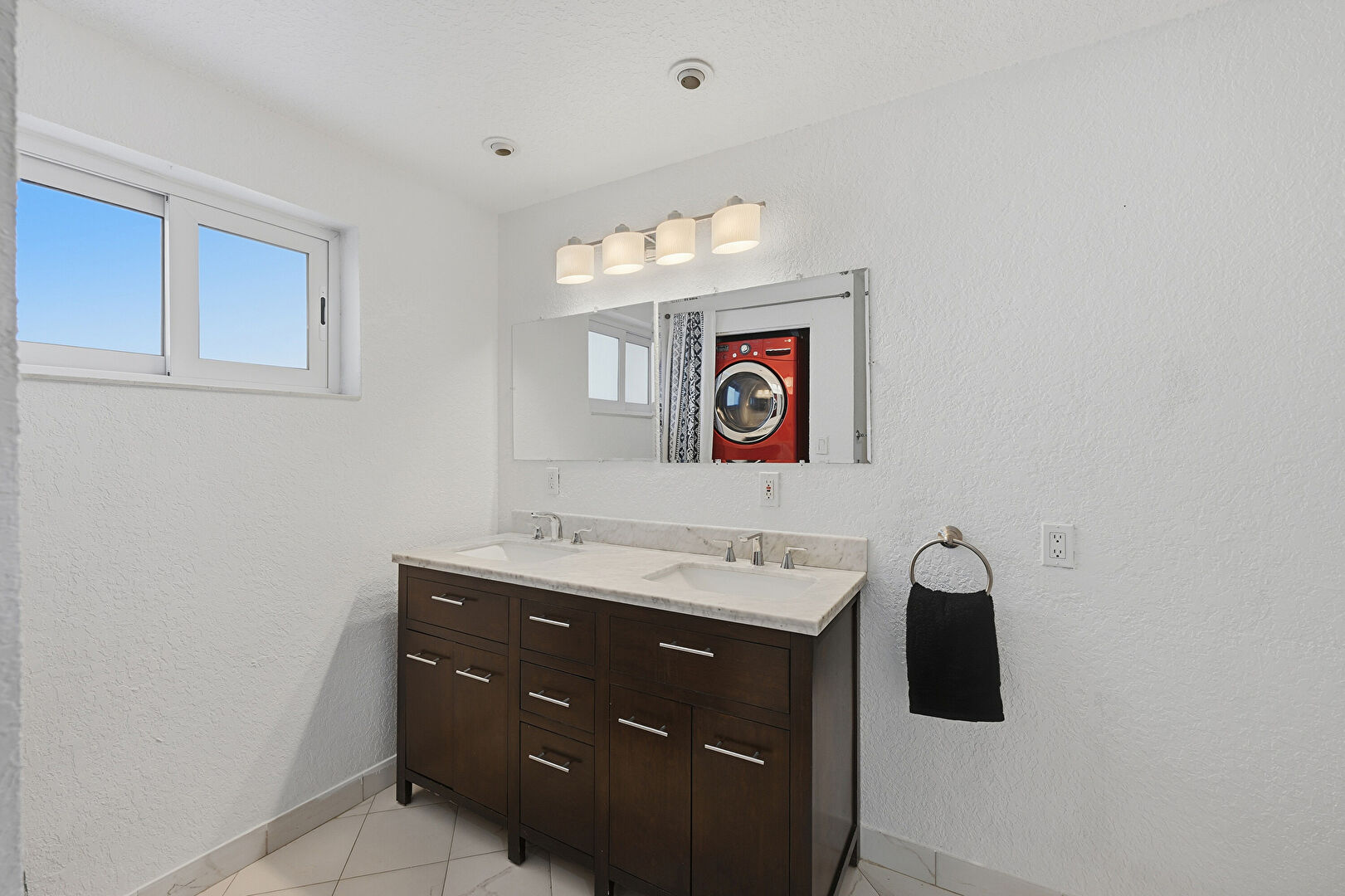 Baseboards Wall, Double Vanity, Full Bathroom, Marble Finish Floor, Natural Light, Textured Wall, Tile Wall, Vent, Combined Bath Shower, Textured Ceiling, Textured Wall