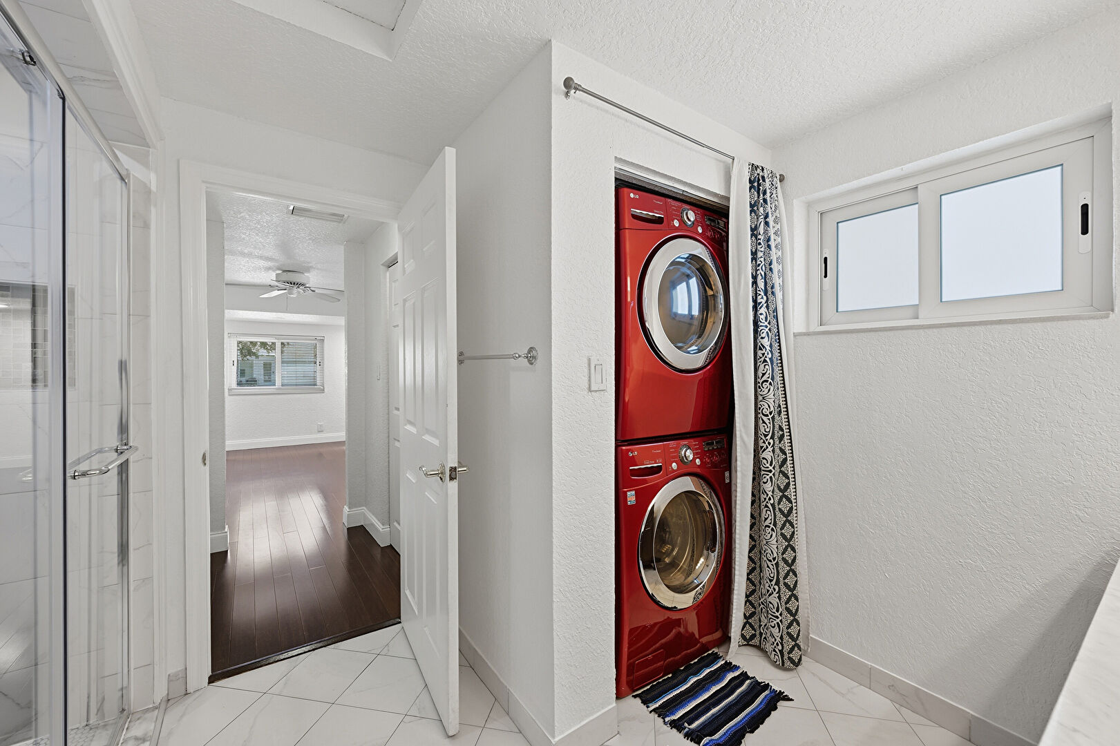 Baseboards Wall, Ceiling Fan, Laundry, Natural Light, Textured Ceiling, Textured Wall, Tile Floor