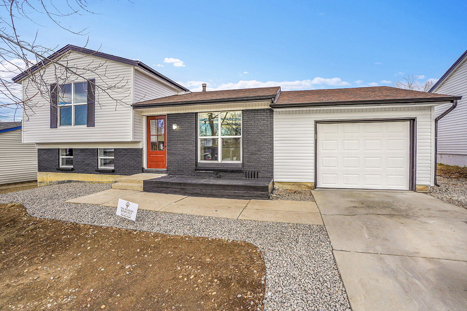 Brick Siding, Chimney, Concrete Foundation, Downspout, Driveway, Fence, Gutters, Horizontal Siding, Porch, Shingle Roof, Stoop, Downspout, Shingle Roof, Stoop