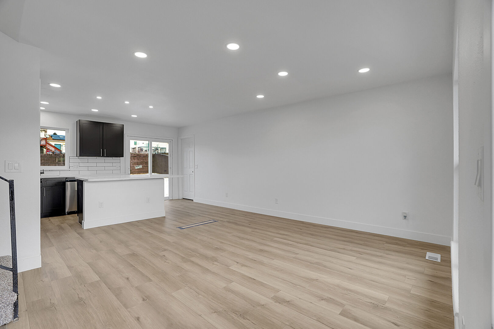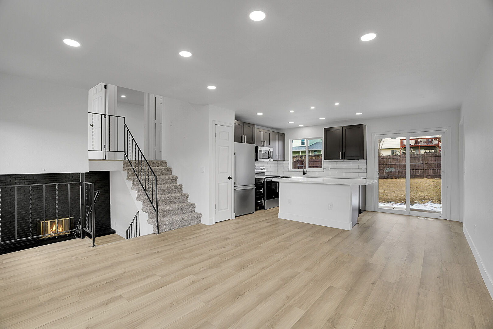Baseboards Wall, Drywall, Fireplace, Kitchen Bar, Kitchen Island, Natural Light, Opens To Living Area, Recessed Lighting, Shaker Cabinets, Stairs, Vent, Wood Finish Floor, L Shaped Kitchen, Natural Light, Wood Finish Floor