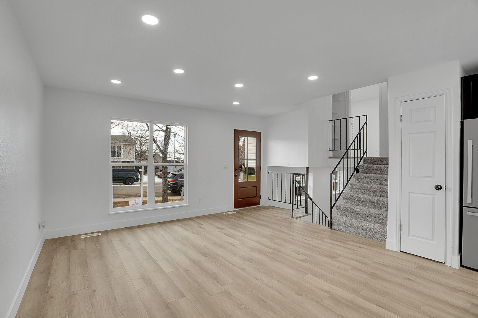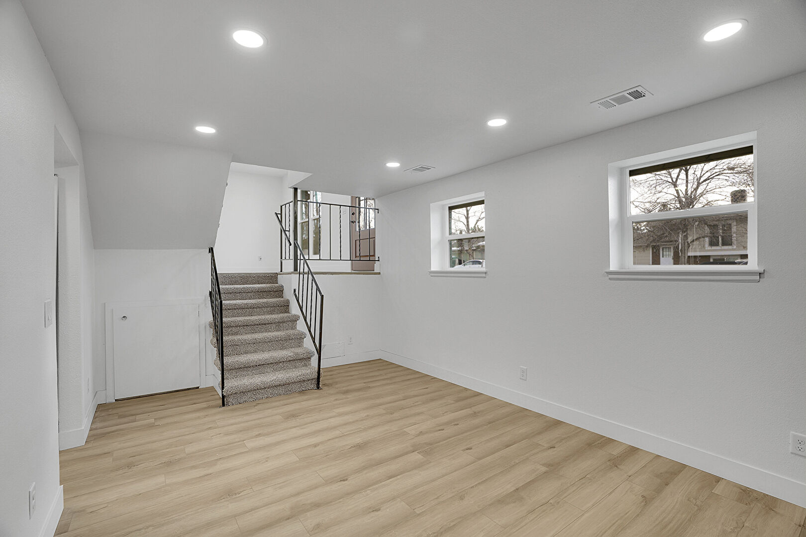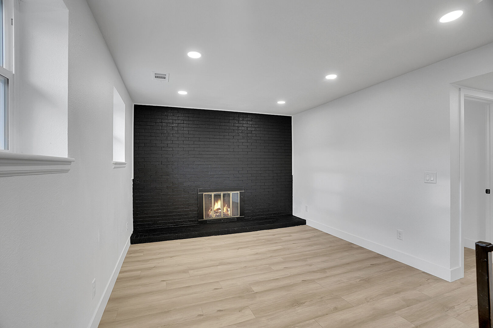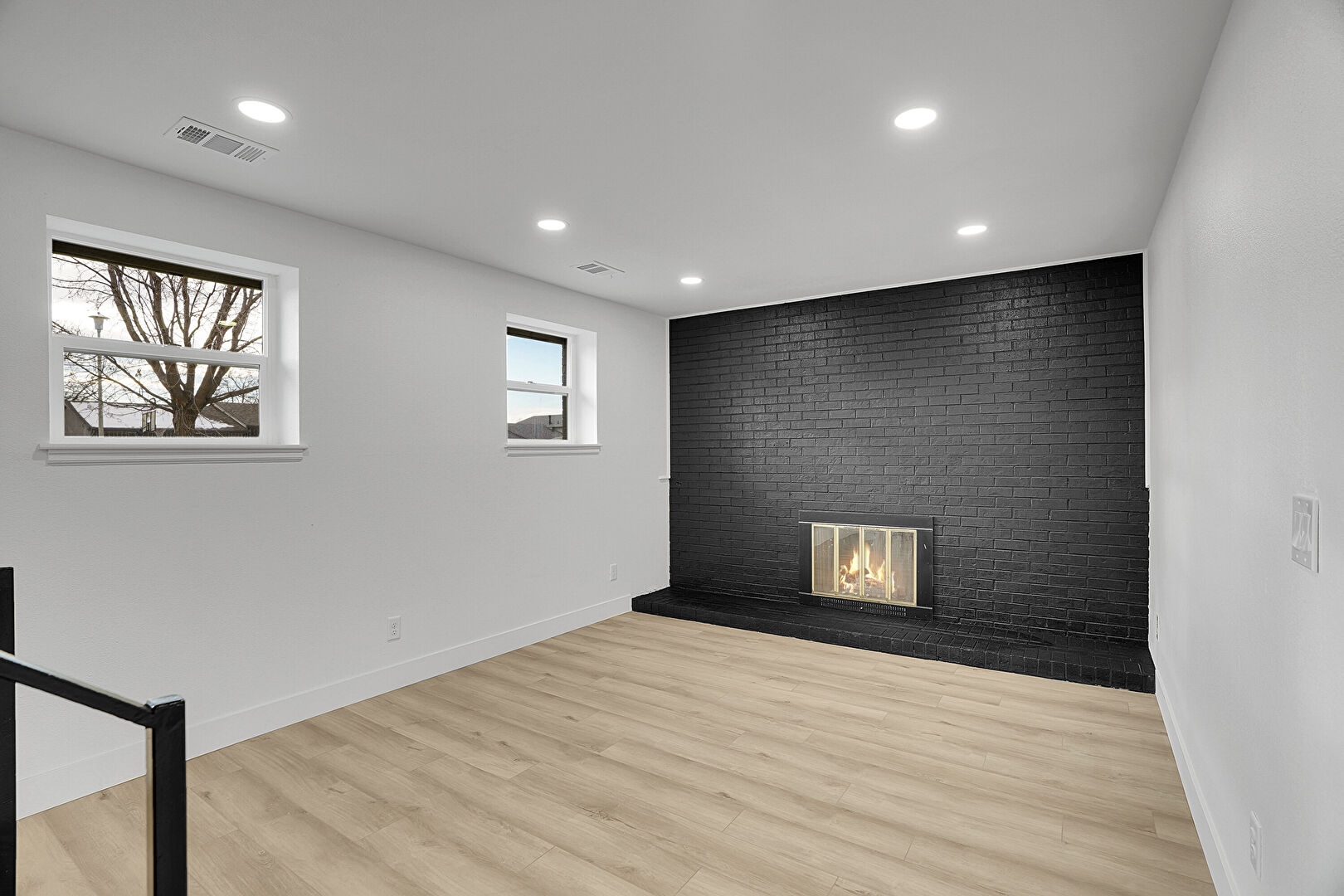 Accent Wall, Baseboards Wall, Brick Wall, Drywall, Fireplace, Natural Light, Recessed Lighting, Stairs, Vent, Wood Finish Floor, Brick Wall, Drywall