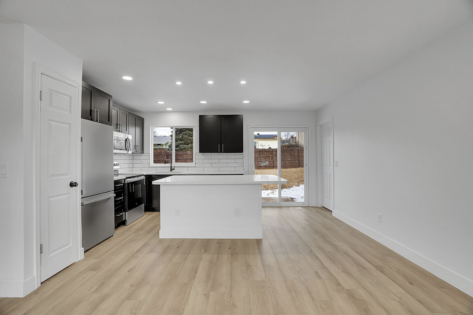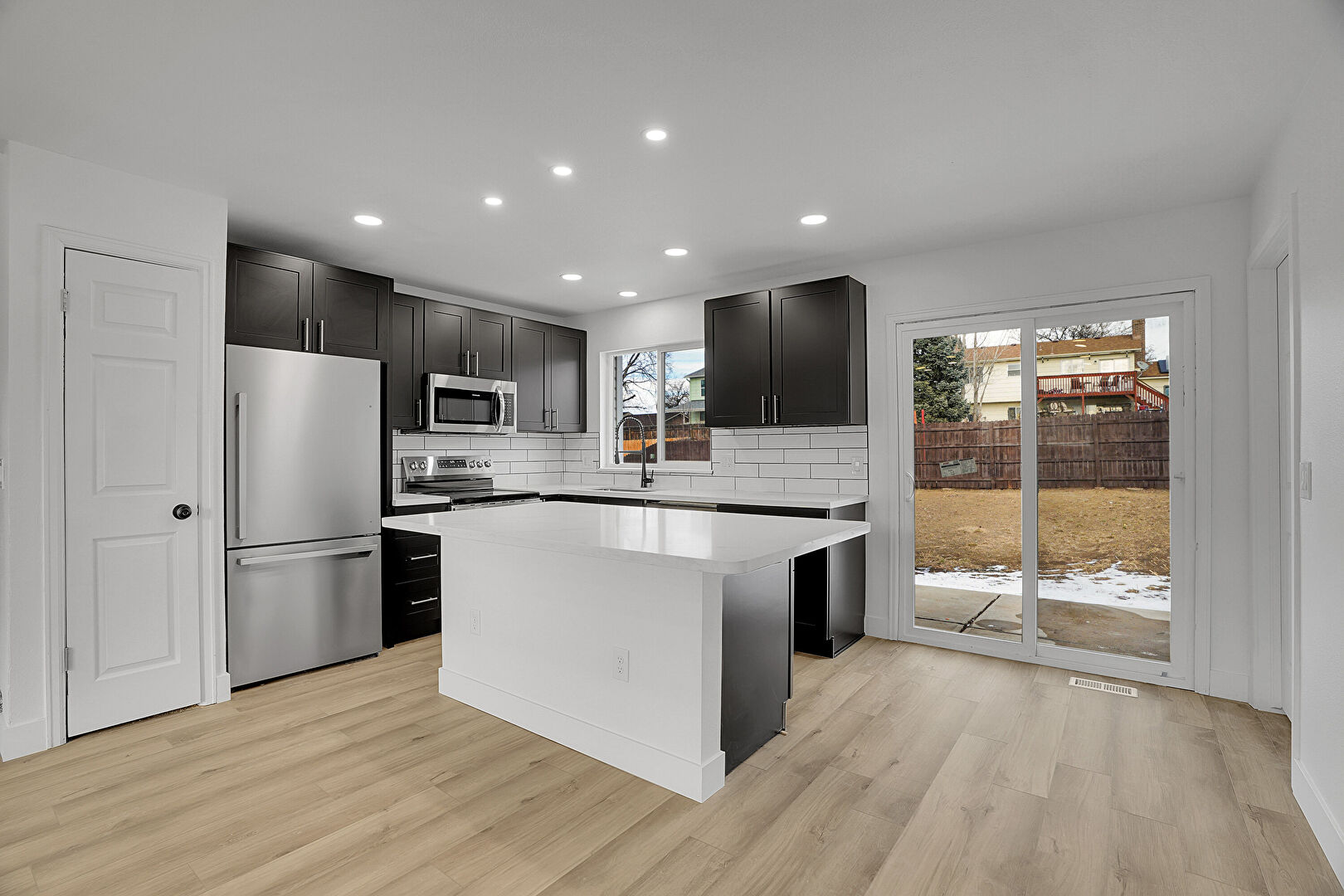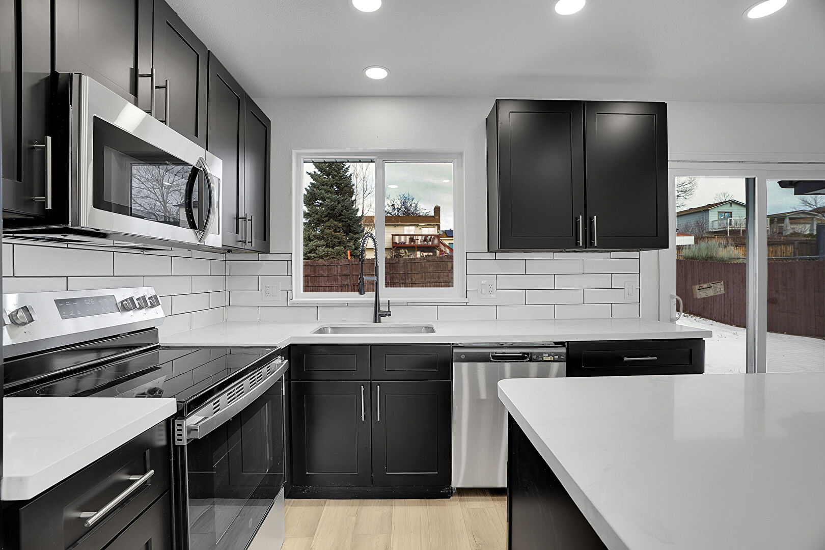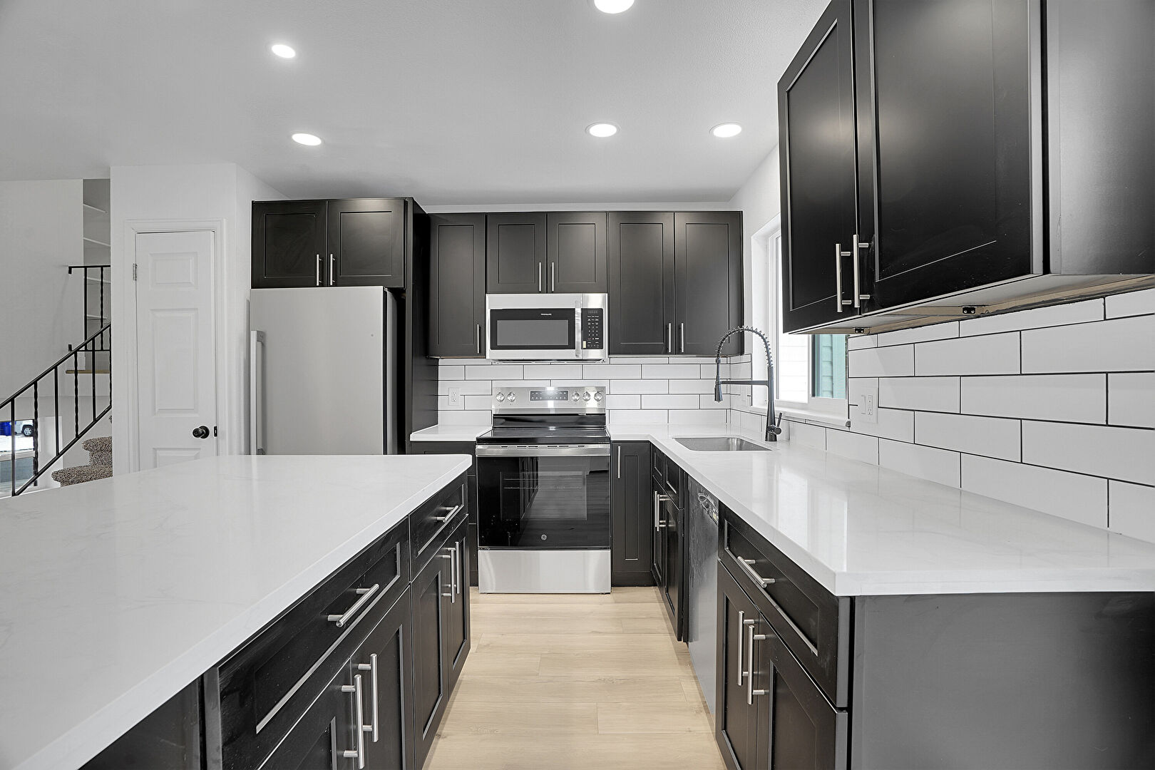 Baseboards Wall, Black Cabinets, Drywall, Kitchen Bar, Kitchen Island, L Shaped Kitchen, Natural Light, Recessed Lighting, Shaker Cabinets, Stone Countertops, Vent, Wood Finish Floor, L Shaped Kitchen, Natural Light, Recessed Lighting, Wood Finish Floor