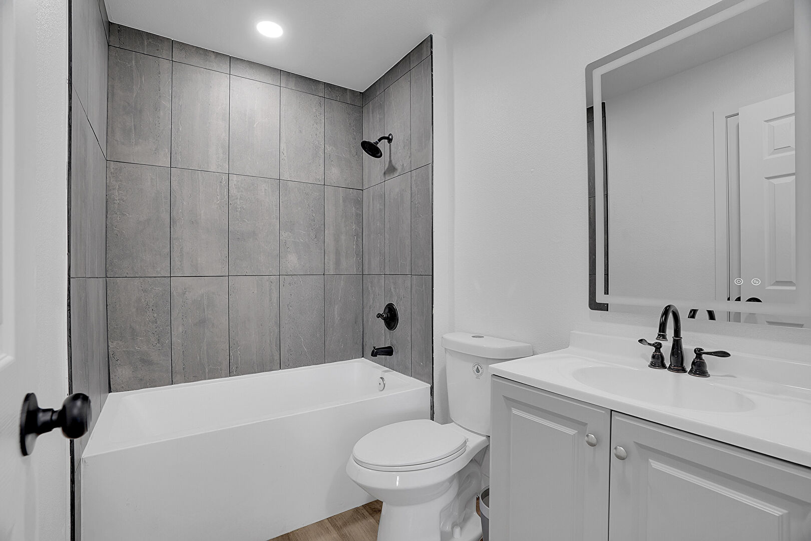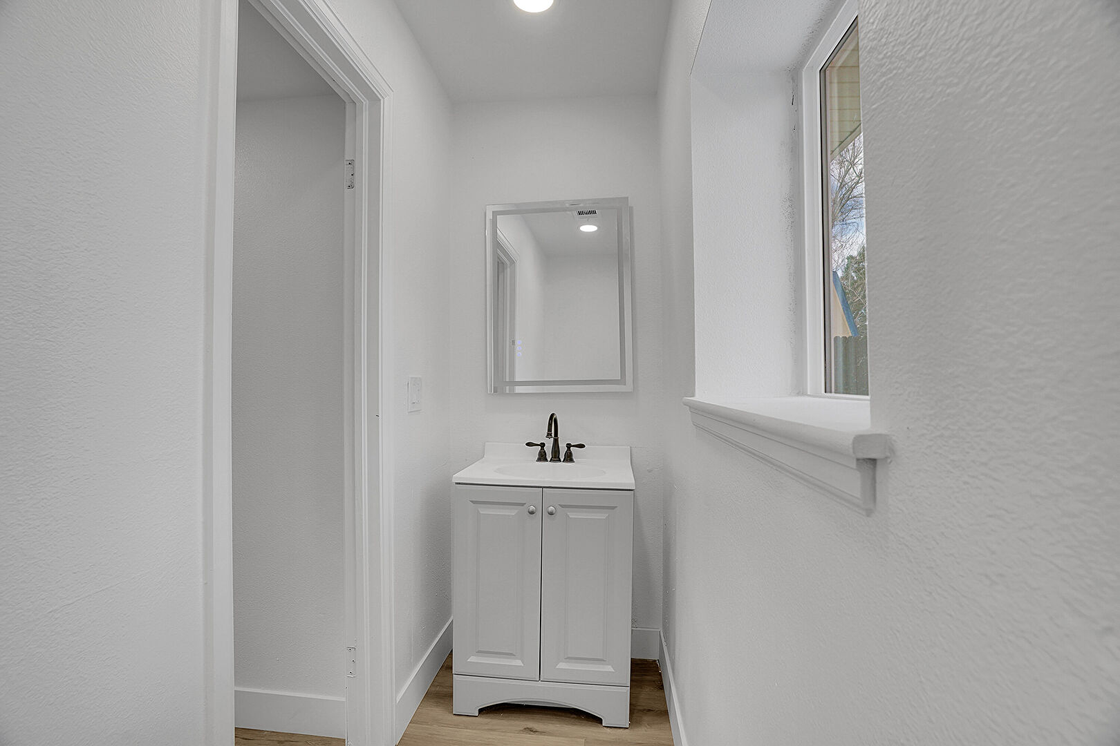 Baseboards Wall, Combined Bath Shower, Drywall, Full Bathroom, Half Bathroom, Natural Light, Recessed Lighting, Vanity, Wood Finish Floor, Recessed Lighting, Textured Wall