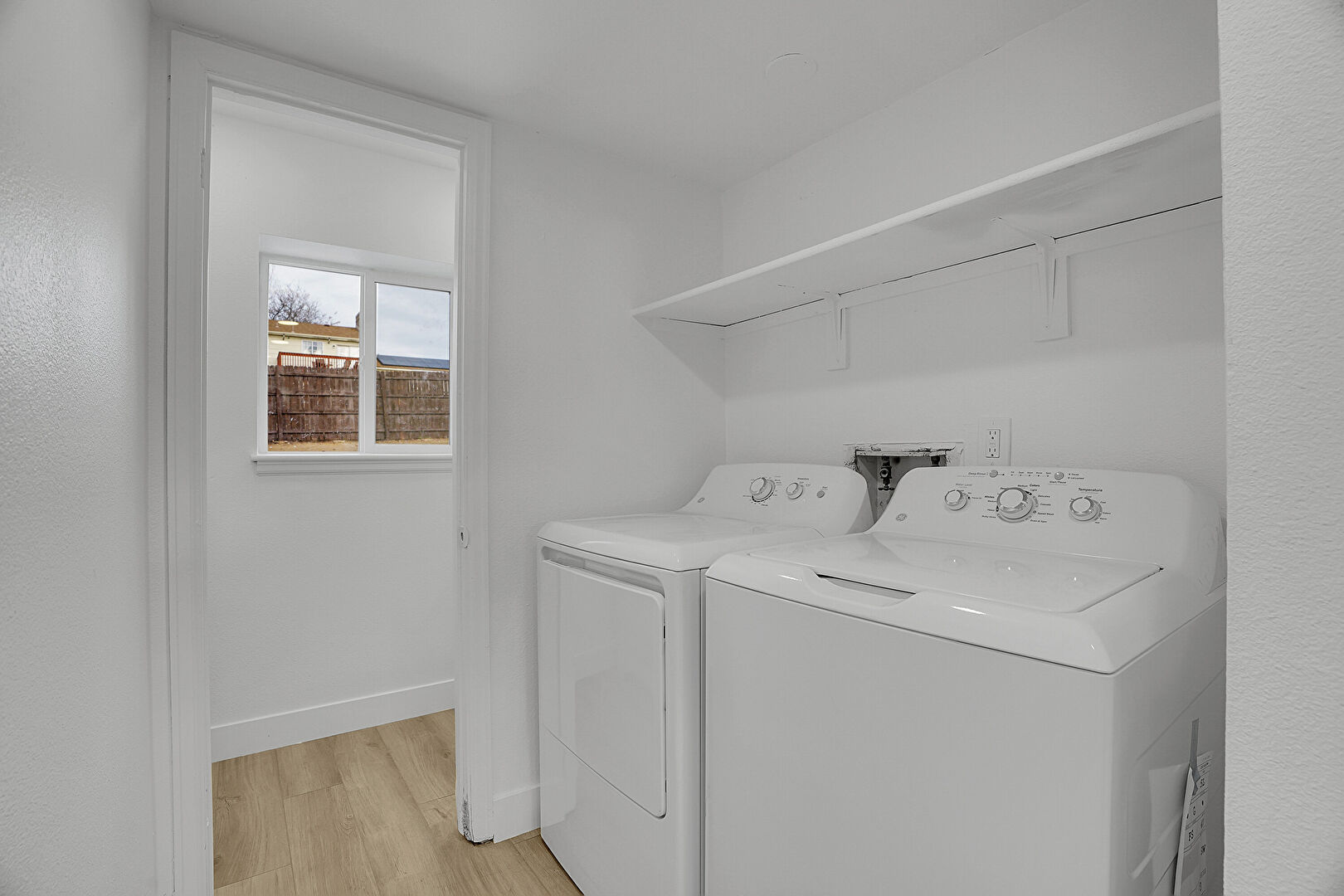 Baseboards Wall, Drywall, Laundry, Washer Hookup, Wood Finish Floor, Natural Light
