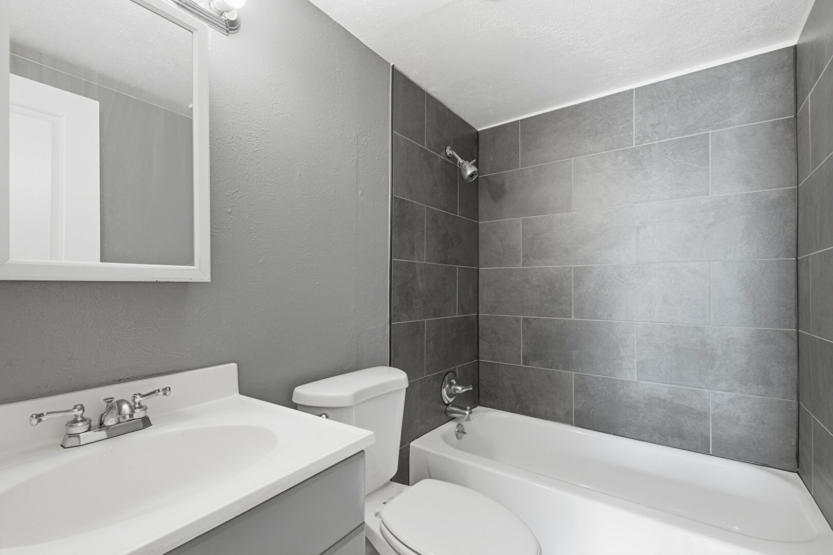 Full Bathroom, Textured Wall, Vanity, Combined Bath Shower