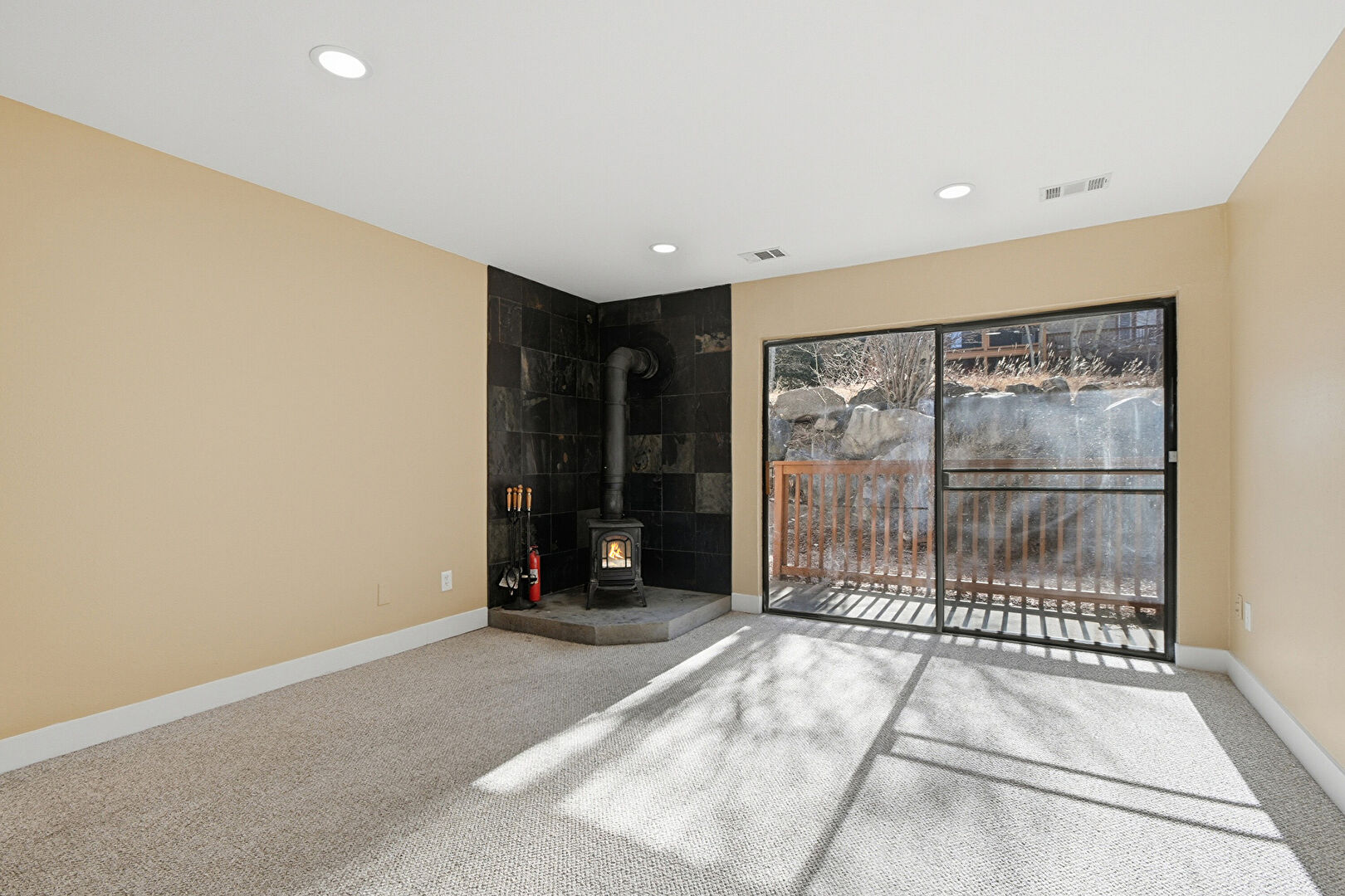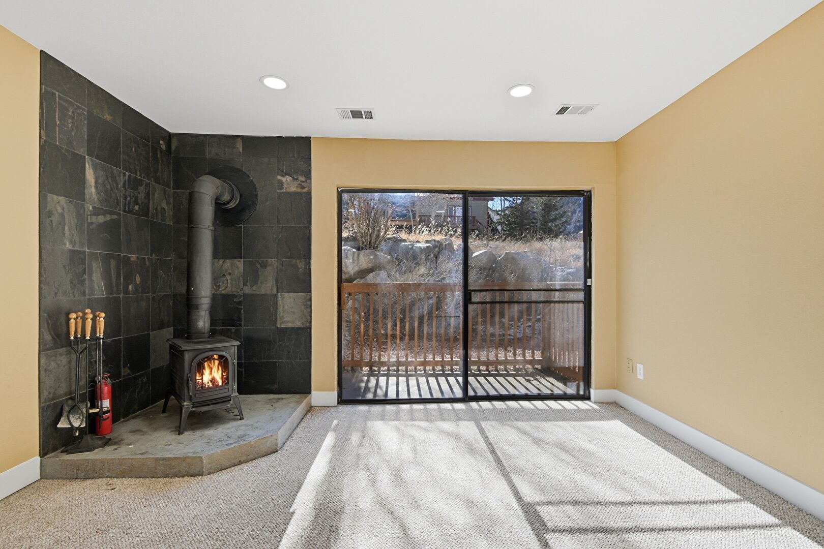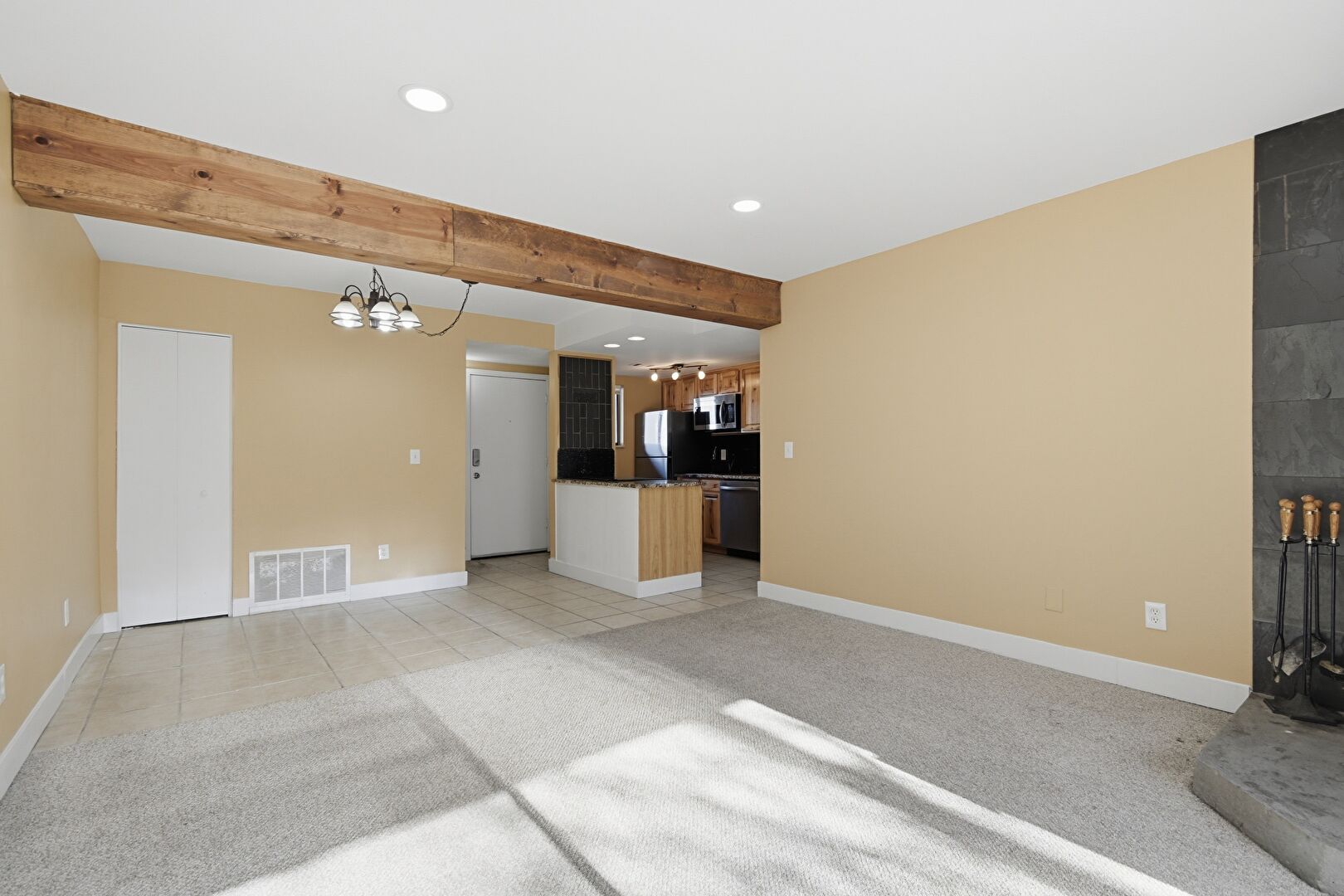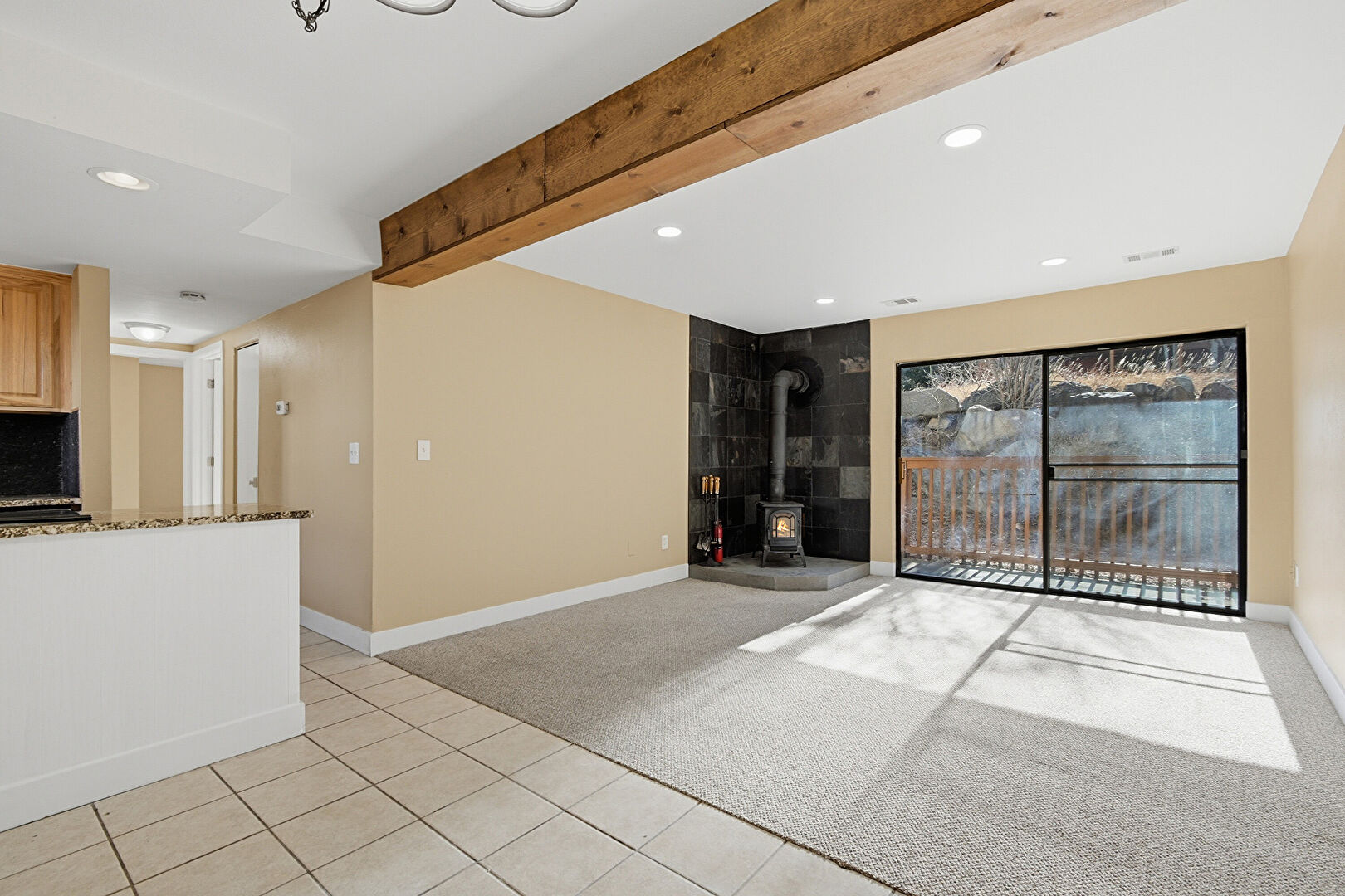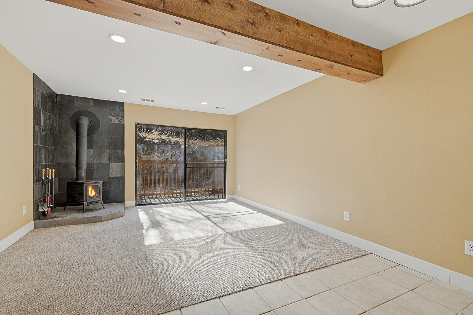 Baseboards Wall, Beamed Ceiling, Carpet, Drywall, Fire Extinguisher, Fireplace, Notable Chandelier, Recessed Lighting, Tile Floor, Vent, Wood Stove, Beamed Ceiling, Carpet, Natural Light, Vent, Wood Stove