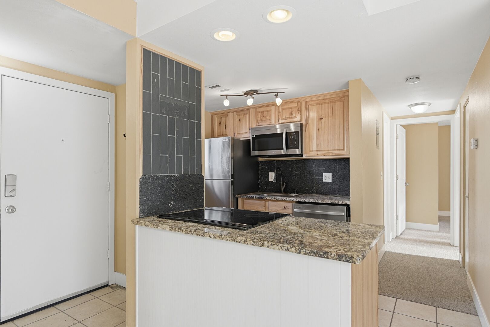Baseboards Wall, Beamed Ceiling, Carpet, Crown Molding Cabinets, Drywall, Galley Kitchen, Kitchen Peninsula, Medium Brown Cabinets, Natural Light, Notable Chandelier, Opens To Living Area, Pendant Lighting, Raised Cabinets, Recessed Lighting, Shaker Cabinets, Smoke Carbon Monoxide Detector, Stone Countertops, Tile Floor, Track Lighting, Vent, Carpet, Drywall, Natural Light, Stone Countertops