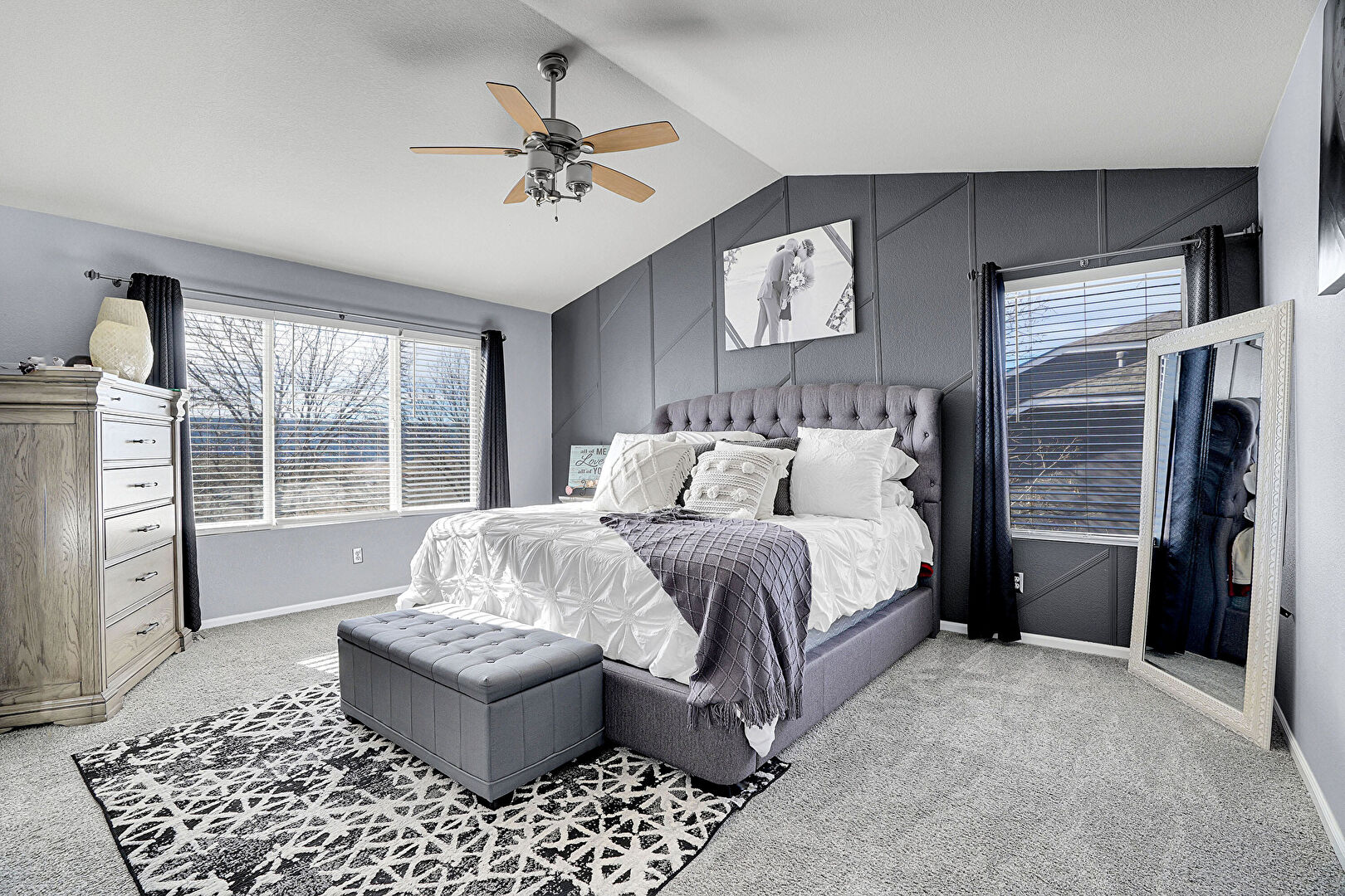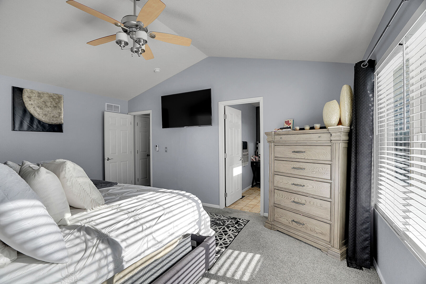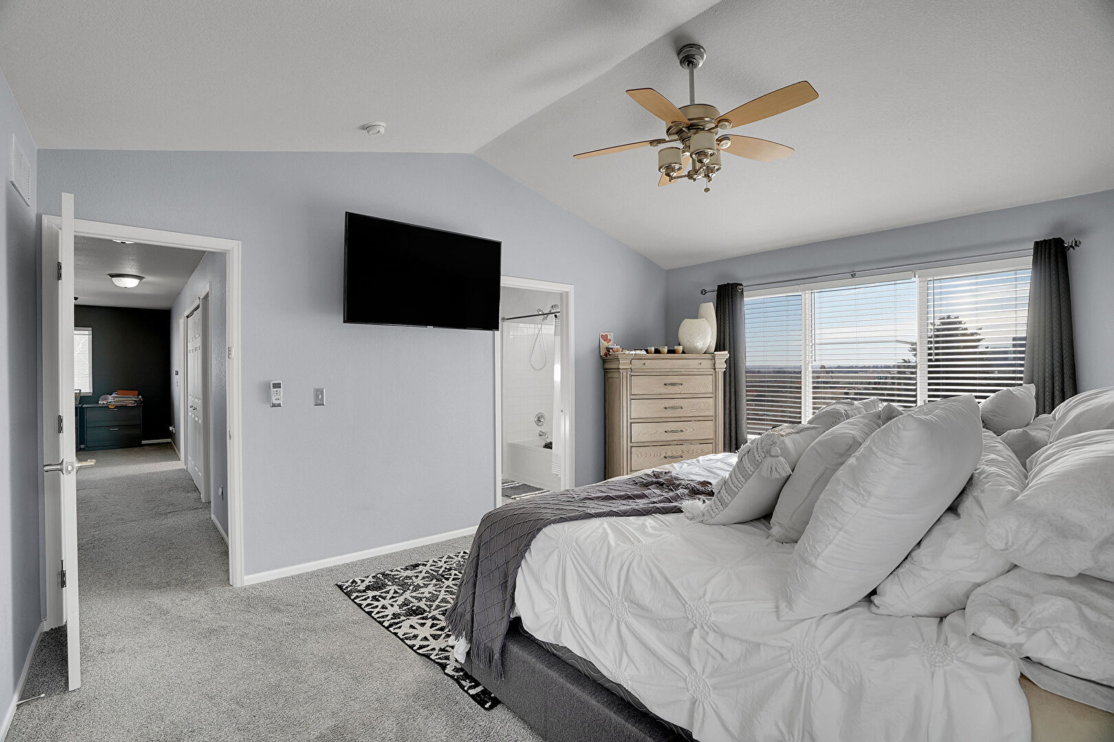 Baseboards Wall, Carpet, Cathedral Ceiling, Ceiling Fan, Drywall, Ensuite Bathroom, Natural Light, Vaulted Ceiling, Accent Wall, Cathedral Ceiling, Vent