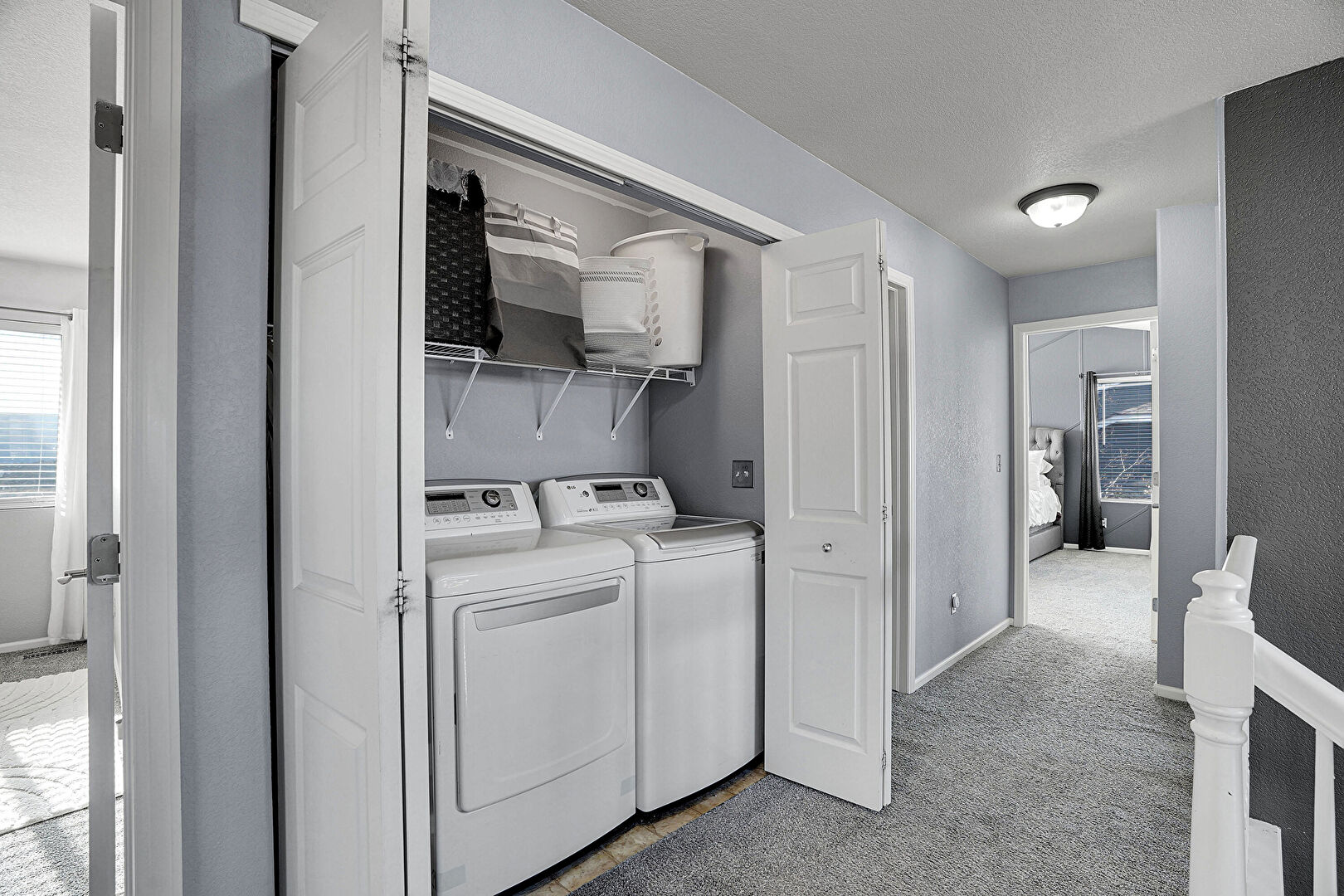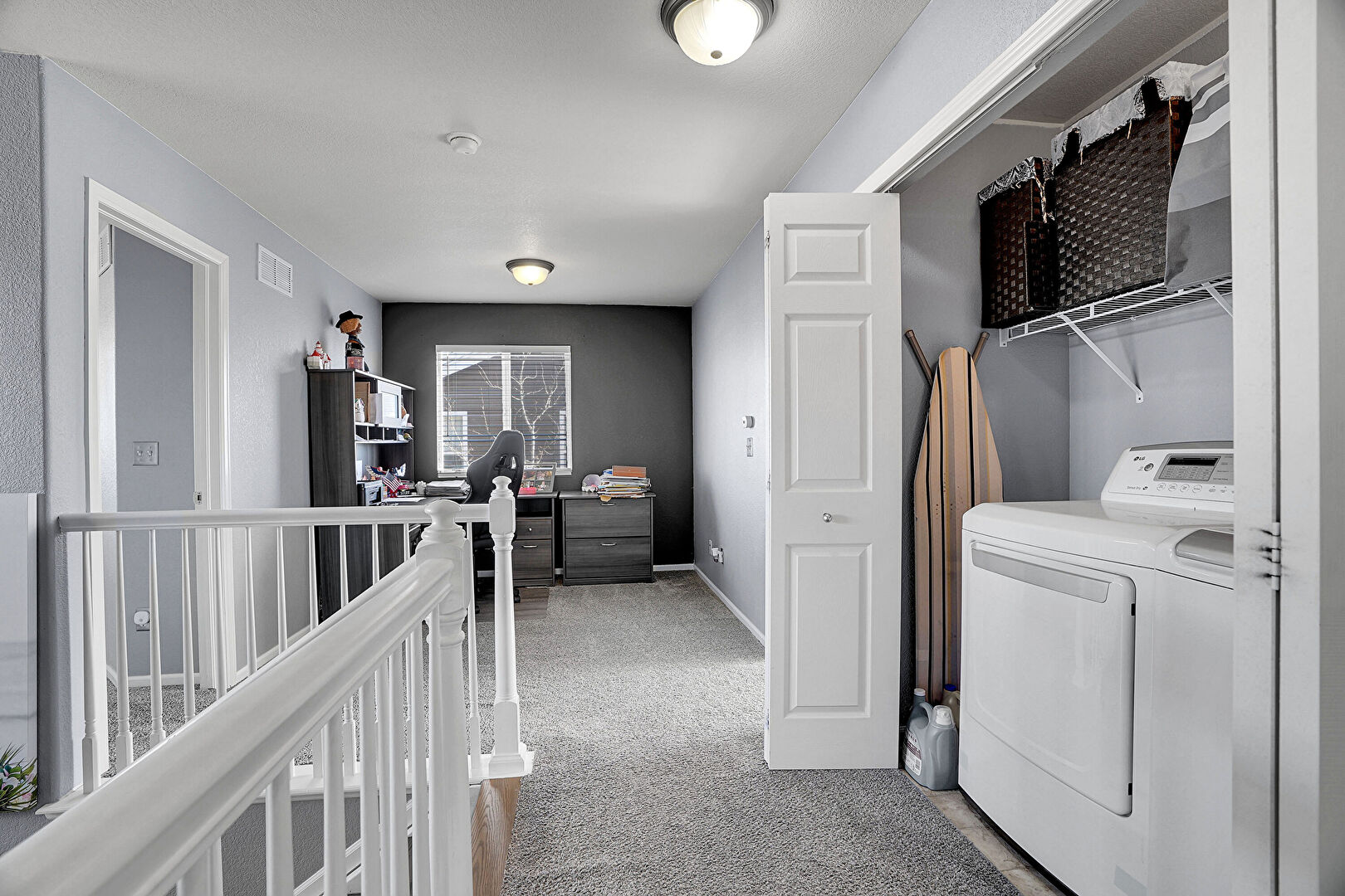 Baseboards Wall, Carpet, Drywall, Laundry, Natural Light, Smoke Carbon Monoxide Detector, Textured Ceiling, Textured Wall, Vent, Carpet, Office Area