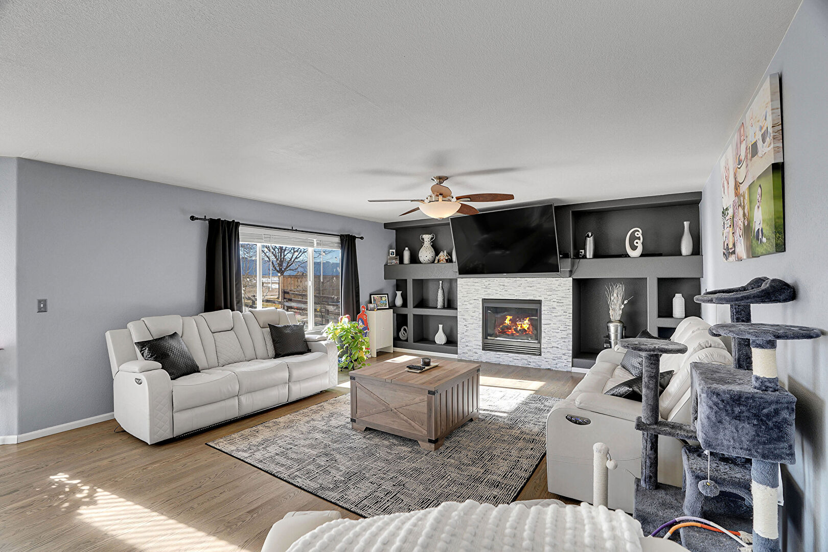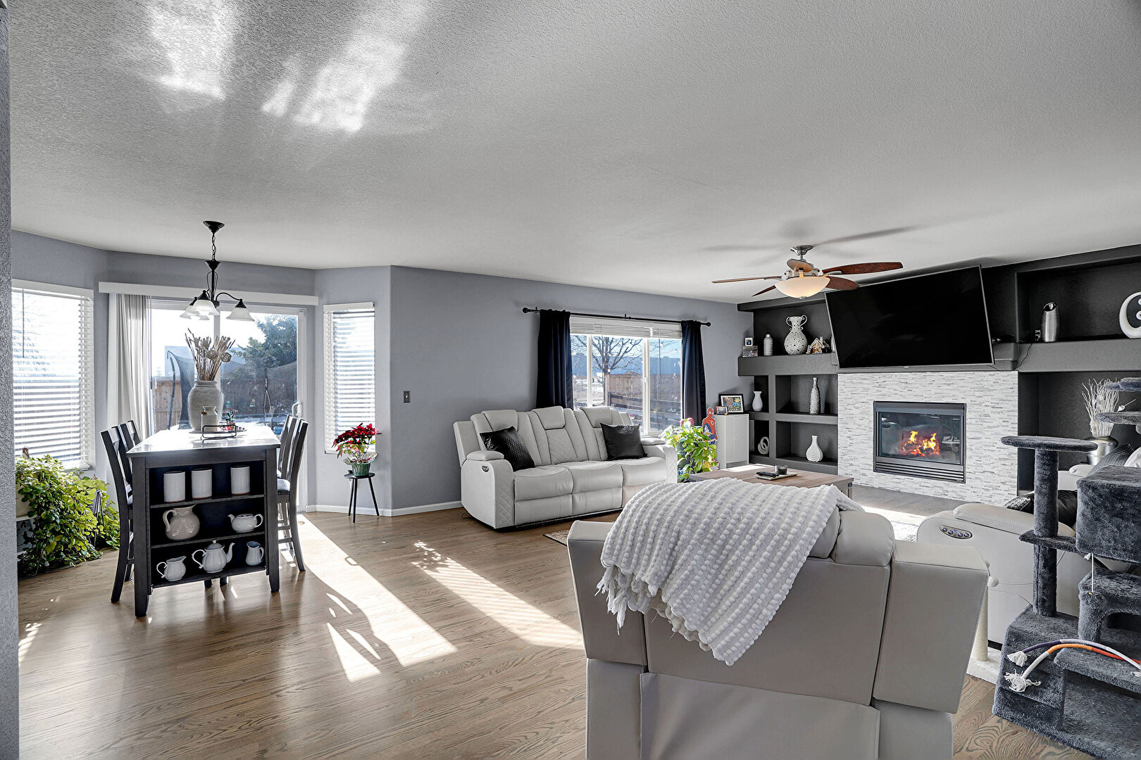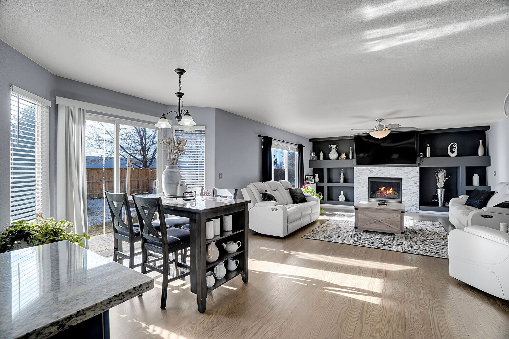 Baseboards Wall, Built In Shelves, Ceiling Fan, Drywall, Fireplace, L Shaped Kitchen, Natural Light, Notable Chandelier, Textured Ceiling, Vent, Wood Finish Floor, Ceiling Fan, Drywall, L Shaped Kitchen, Natural Light, Notable Chandelier