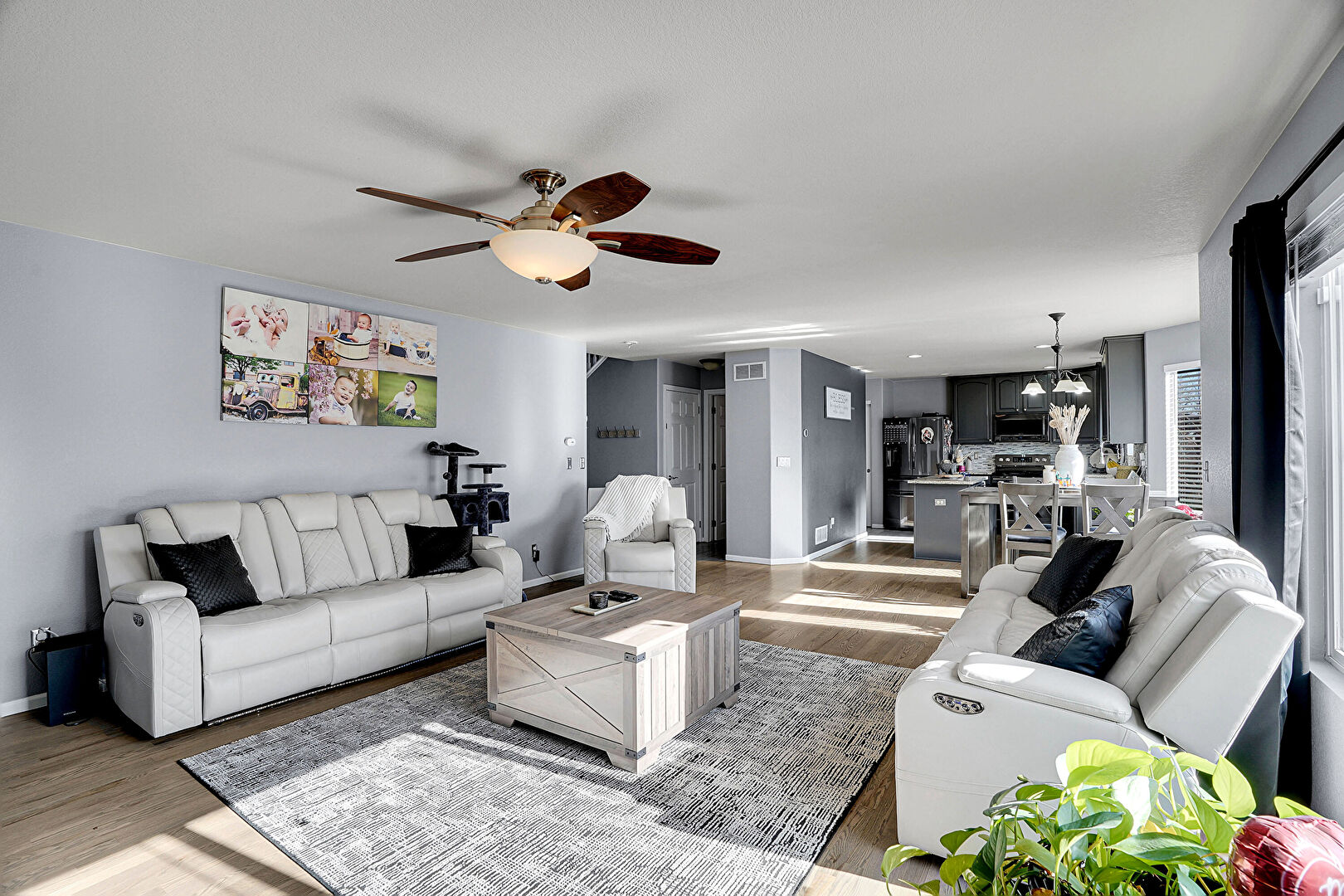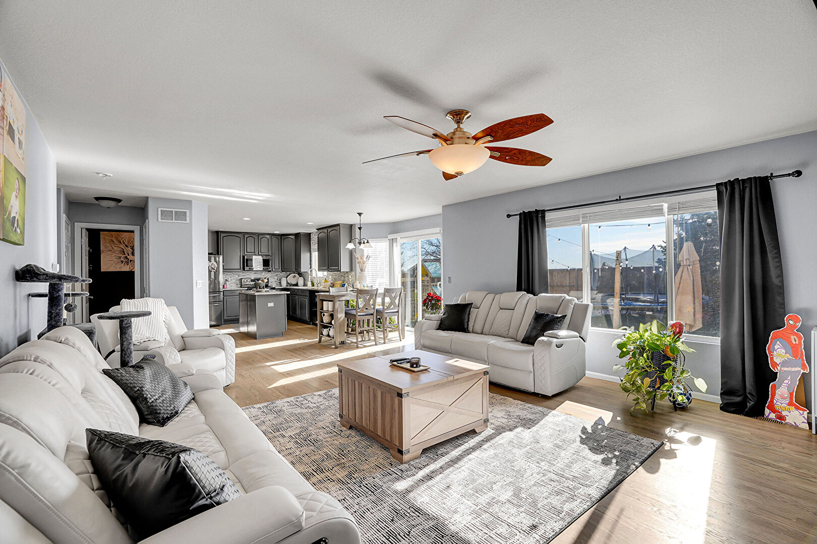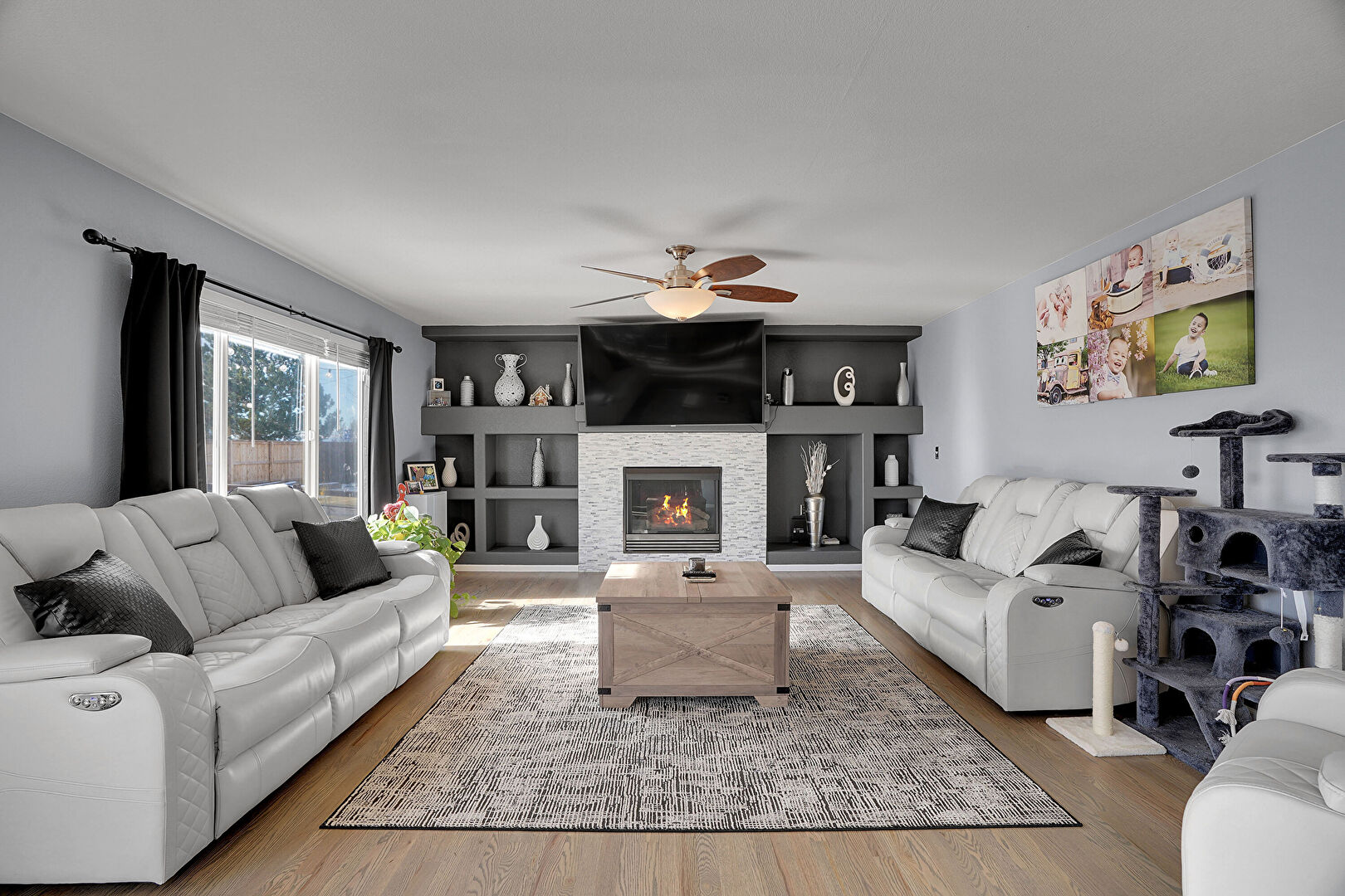 Baseboards Wall, Built In Shelves, Ceiling Fan, Drywall, Fireplace, L Shaped Kitchen, Natural Light, Notable Chandelier, Textured Ceiling, Vent, Wood Finish Floor, Ceiling Fan, Drywall, L Shaped Kitchen, Natural Light, Notable Chandelier