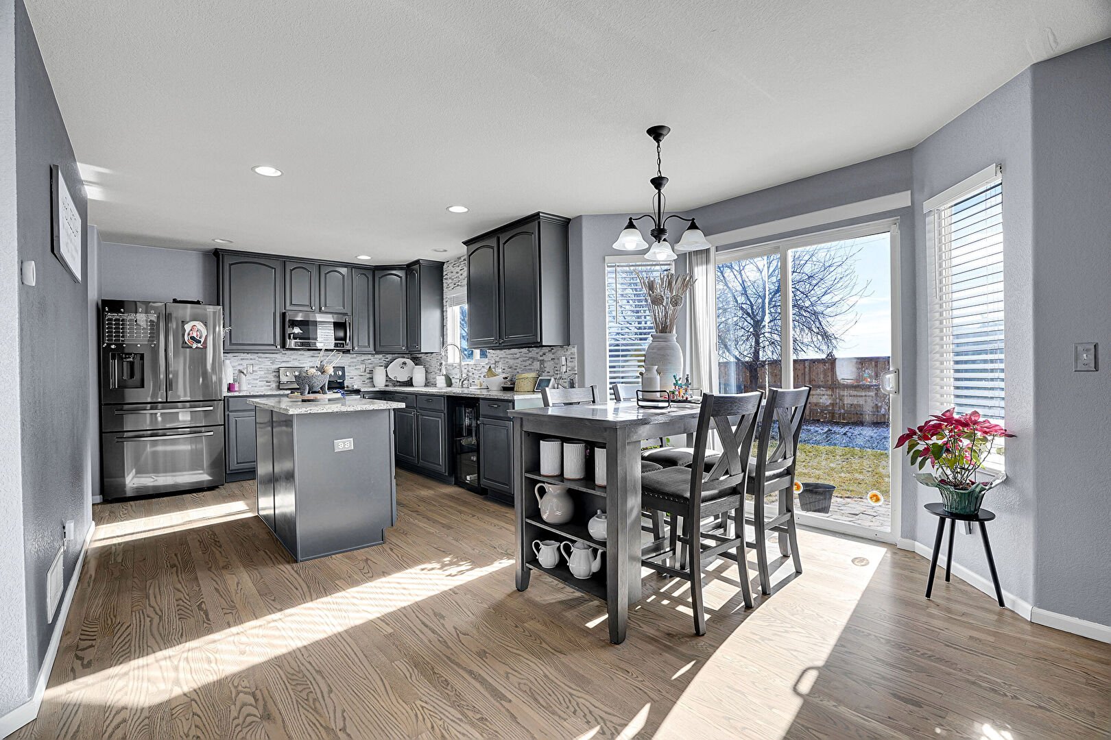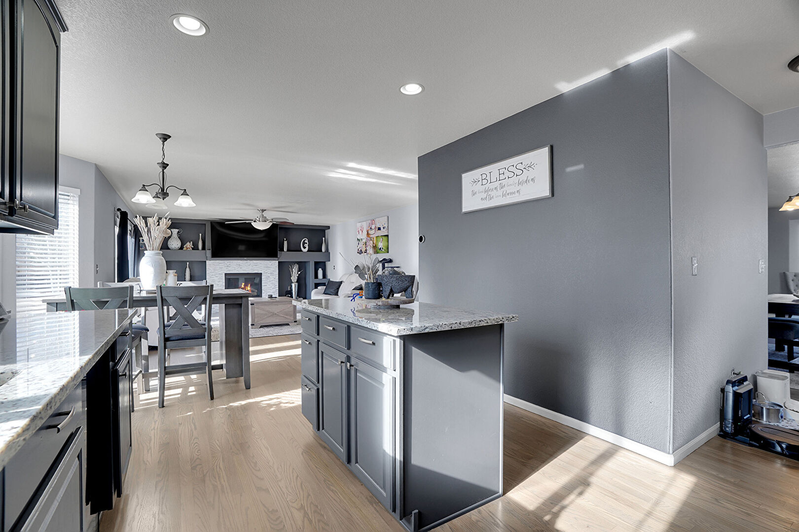 Arched Cabinets, Baseboards Wall, Built In Shelves, Ceiling Fan, Drywall, Fireplace, Gray Cabinets, Kitchen Island, L Shaped Kitchen, Natural Light, Notable Chandelier, Pendant Lighting, Raised Cabinets, Stone Countertops, Textured Ceiling, Textured Wall, Vent, Wood Finish Floor, Built In Shelves, Natural Light, Recessed Lighting