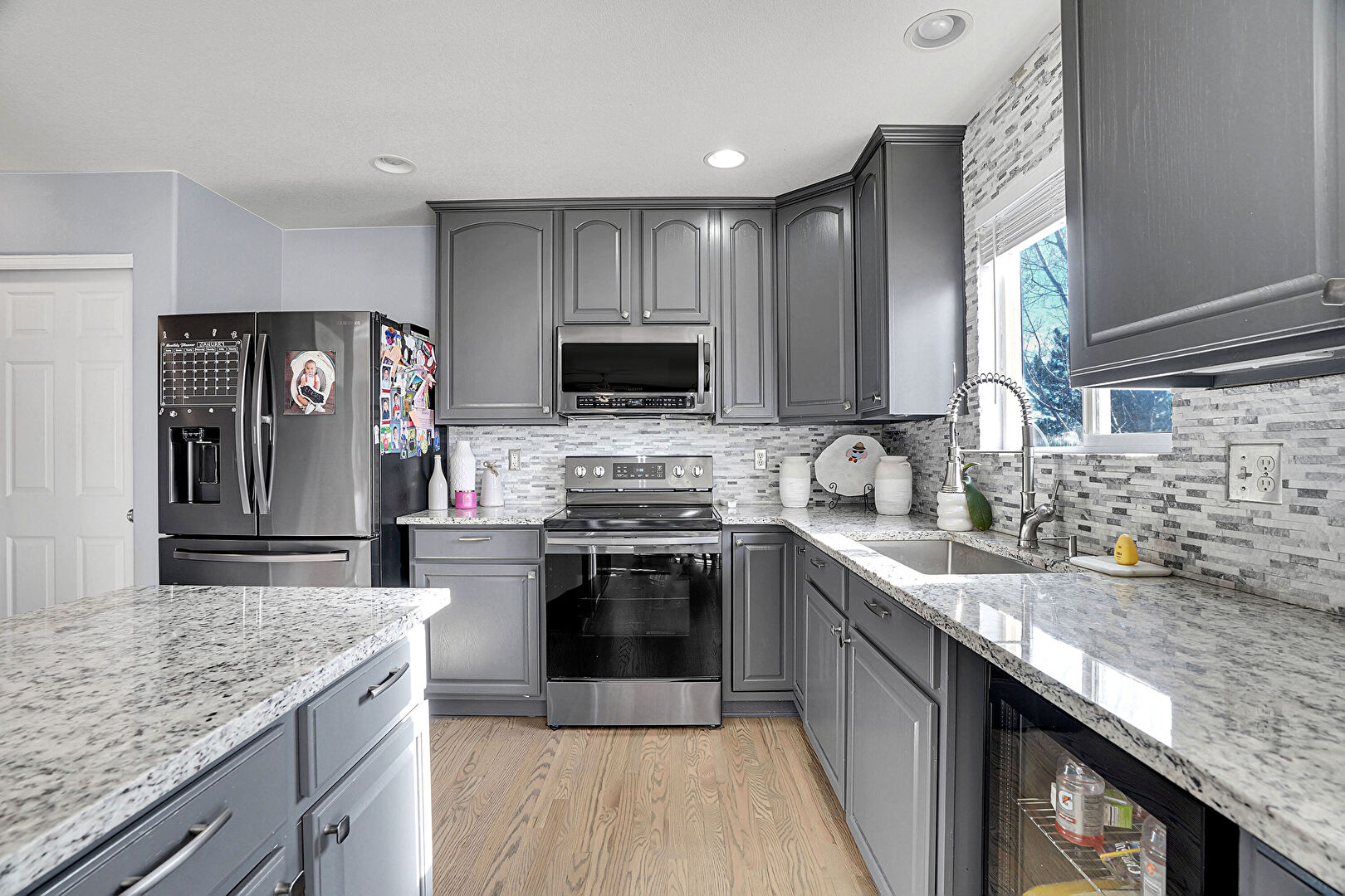 Arched Cabinets, Baseboards Wall, Ceiling Fan, Crown Molding Cabinets, Drywall, Fireplace, Gray Cabinets, Kitchen Island, L Shaped Kitchen, Natural Light, Notable Chandelier, Opens To Living Area, Pendant Lighting, Raised Cabinets, Recessed Lighting, Stone Countertops, Textured Ceiling, Textured Wall, Wine Cooler, Wood Finish Floor, Arched Cabinets, Baseboards Wall, Gray Cabinets
