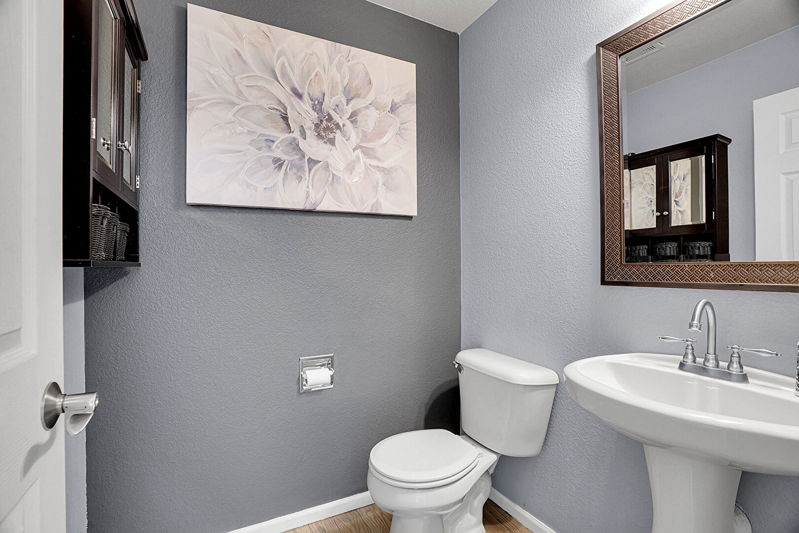 Combined Bath Shower, Full Bathroom, Half Bathroom, Textured Wall, Tile Floor, Vanity, Vent, Wood Finish Floor, Baseboards Wall