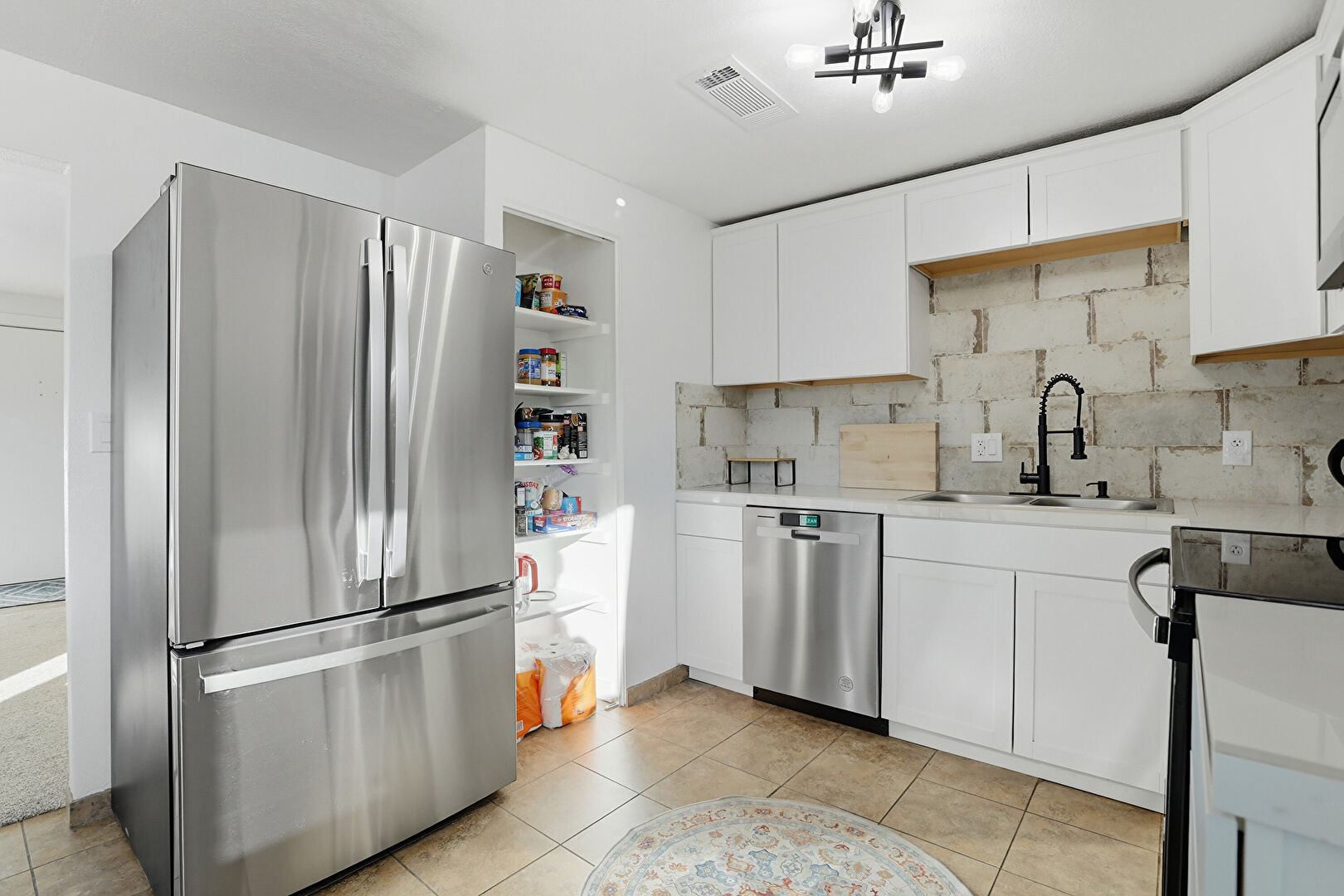 Drywall, Open Shelves, Shaker Cabinets, Stone Countertops, Tile Floor, Shaker Cabinets, Vent