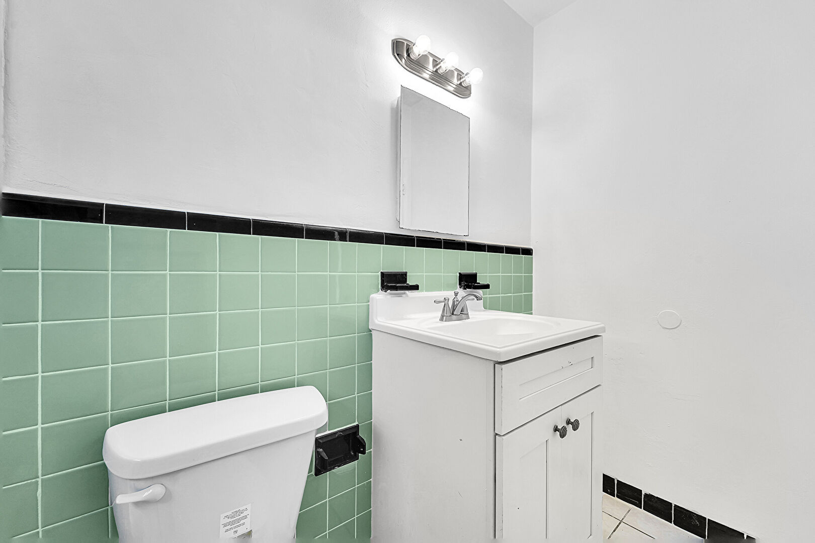 Baseboards Wall, Combined Bath Shower, Drywall, Full Bathroom, Half Bathroom, Natural Light, Tile Floor, Tile Wall, Vanity, Wainscot Wall, Tile Floor, Wainscot Wall