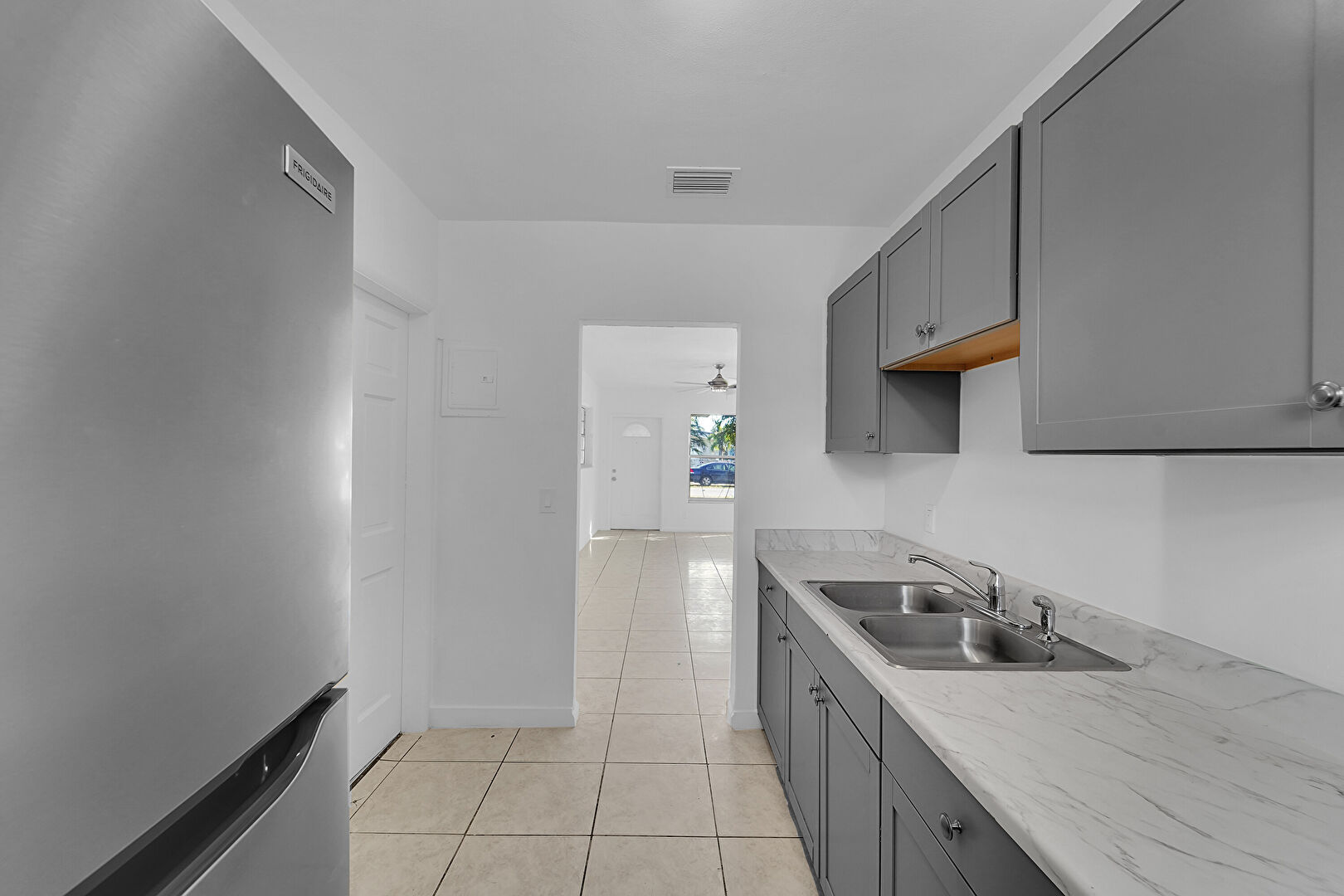 Baseboards Wall, Ceiling Fan, Drywall, Gray Cabinets, Natural Light, Shaker Cabinets, Tile Floor, Vent, Drywall, Gray Cabinets, Tile Floor