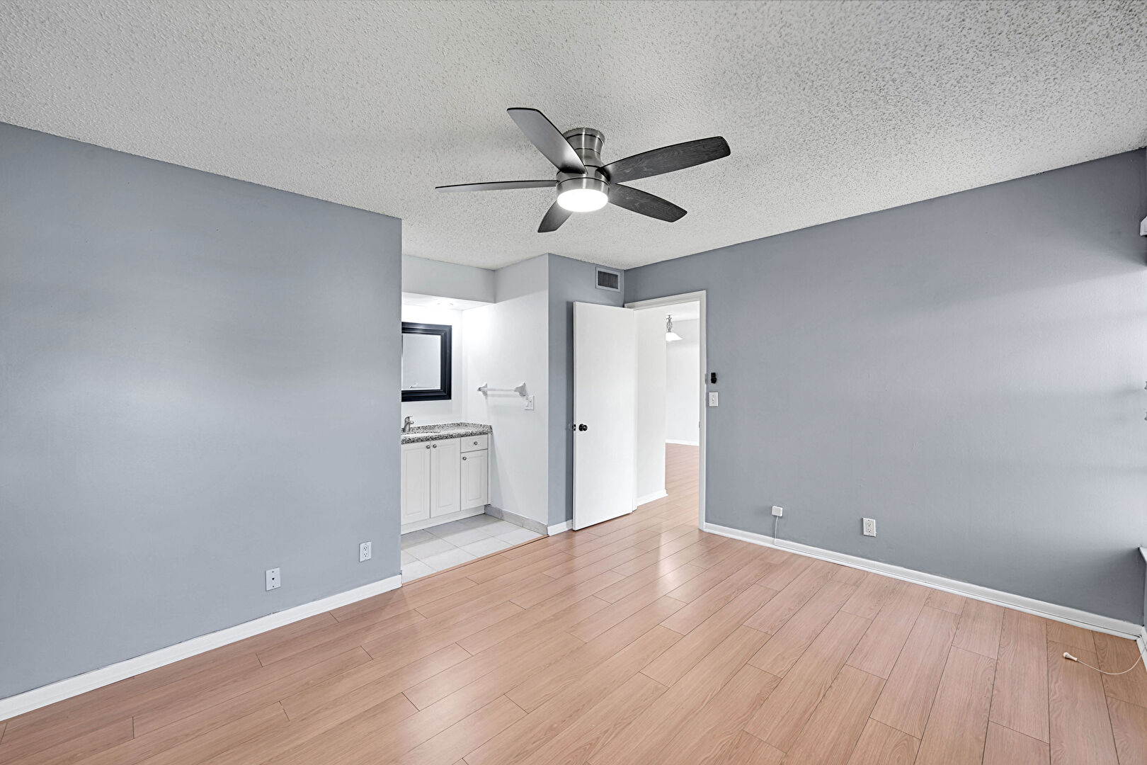Baseboards Wall, Ceiling Fan, Drywall, Natural Light, Textured Ceiling, Vent, Wood Finish Floor, Ensuite Bathroom, Wood Finish Floor
