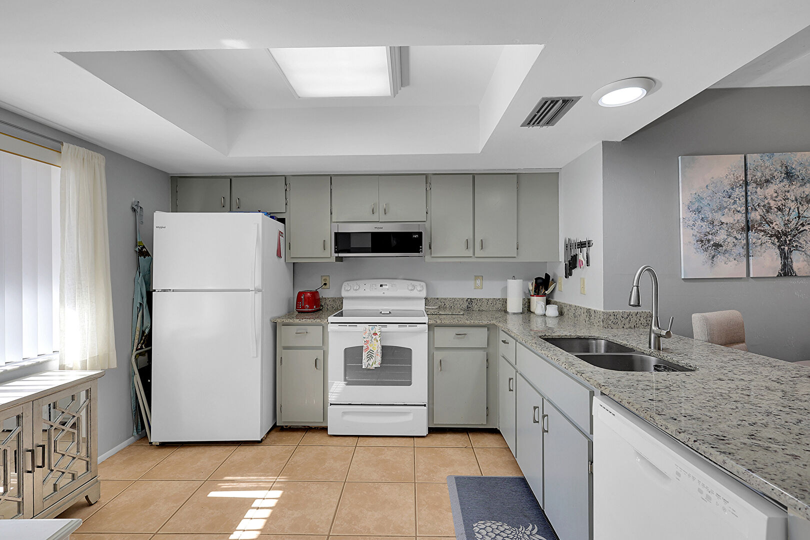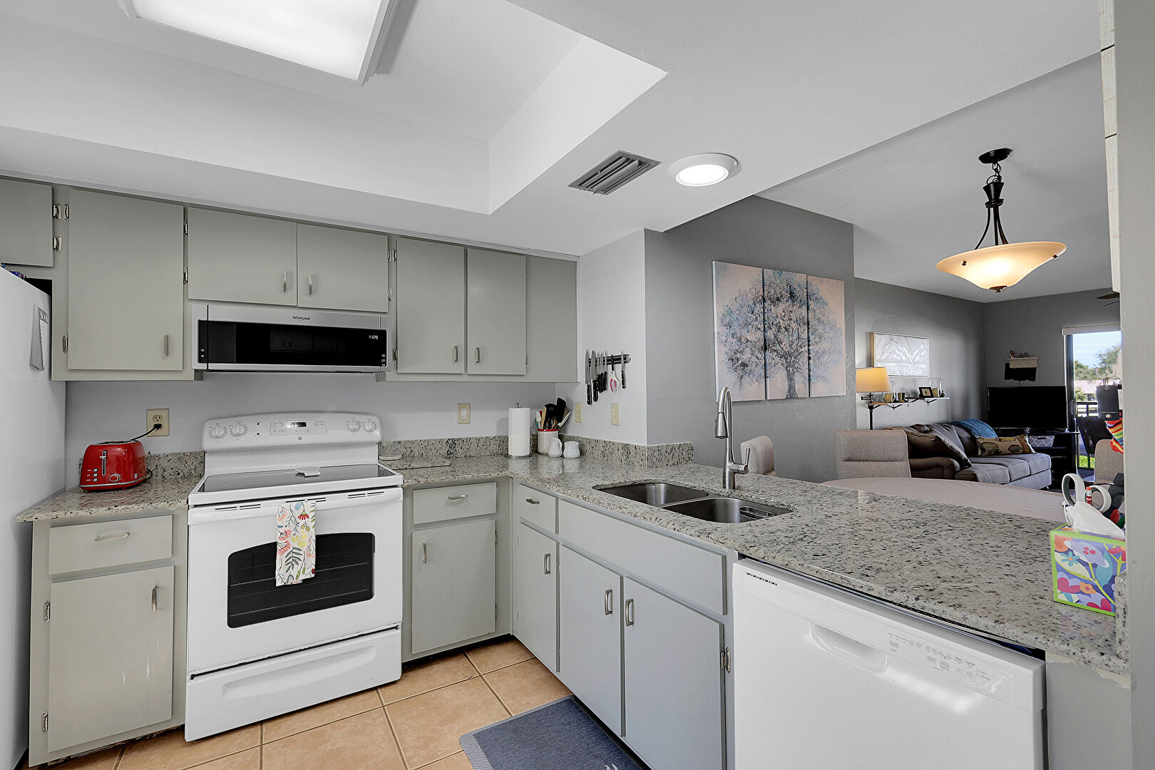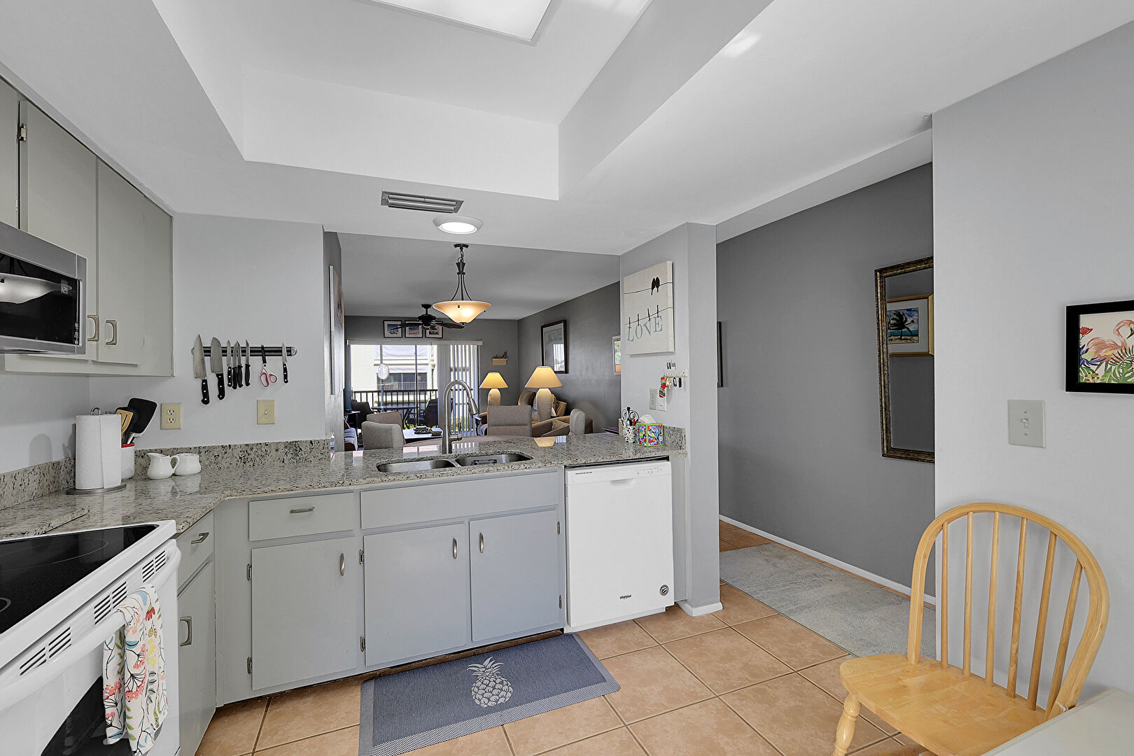 Baseboards Wall, Carpet, Drywall, Gray Cabinets, Kitchen Peninsula, Natural Light, Opens To Living Area, Pass Through Window, Pendant Lighting, Recessed Lighting, Stone Countertops, Tile Floor, Tray Ceiling, Vent, Visible Hinge Cabinets, Kitchen Peninsula, Opens To Living Area, Stone Countertops