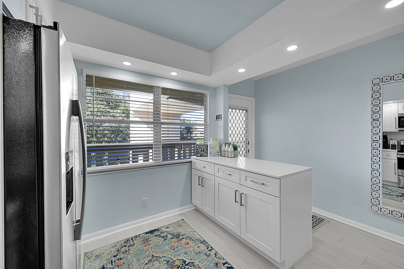 Baseboards Wall, Drywall, Kitchen Bar, Kitchen Peninsula, Natural Light, Opens To Living Area, Pendant Lighting, Recessed Lighting, Shaker Cabinets, Stone Countertops, Vent, Vinyl Floor, Wood Finish Floor, Drywall, Kitchen Peninsula, Opens To Living Area, Shaker Cabinets, U Shaped Kitchen, Wood Finish Floor