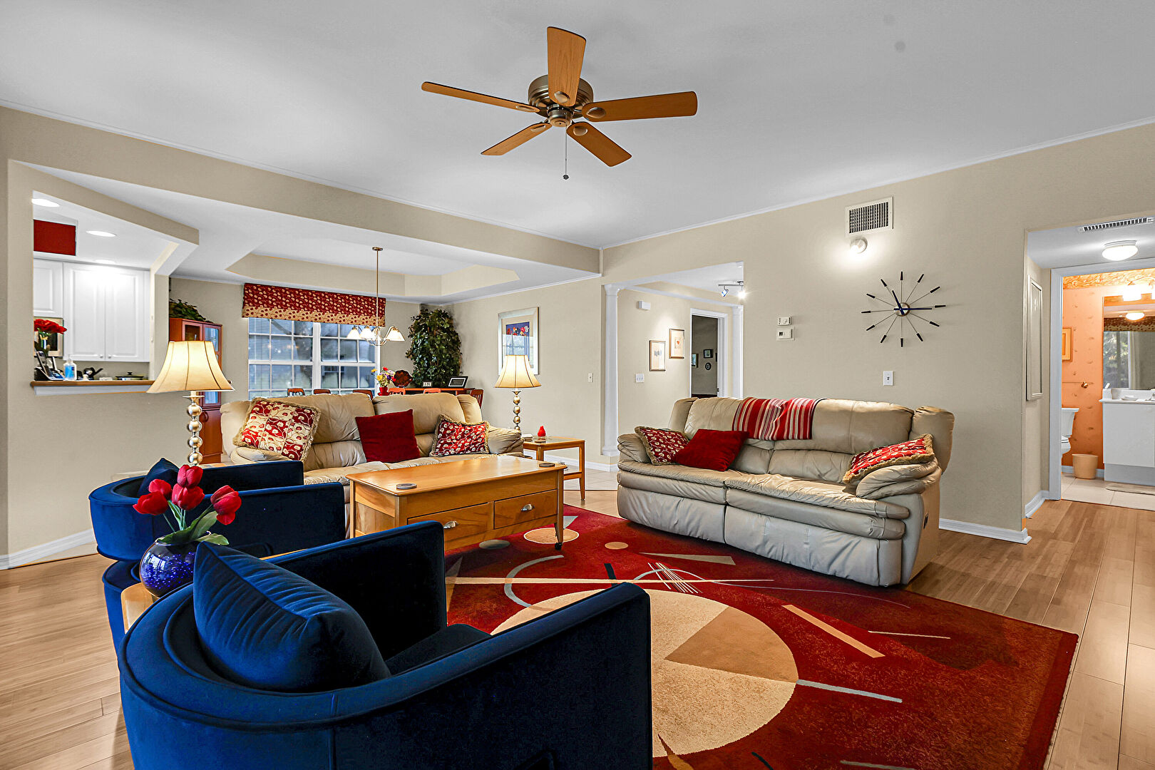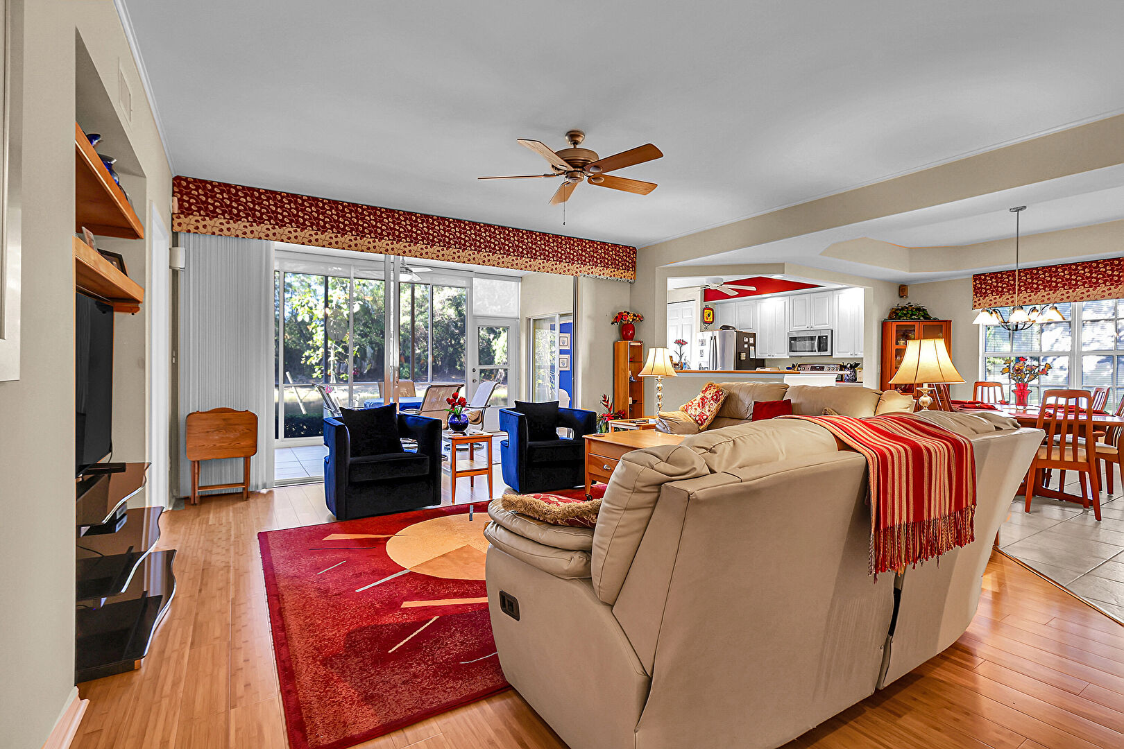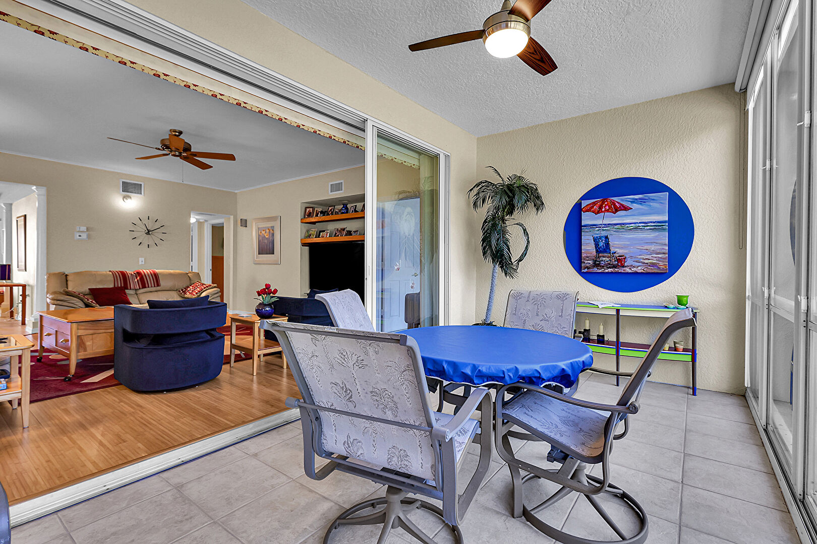 Ceiling Fan, Drywall, Natural Light, Sunroom, Textured Ceiling, Tile Floor, Vent, Outdoor Dining Area, Vent, Wood Finish Floor