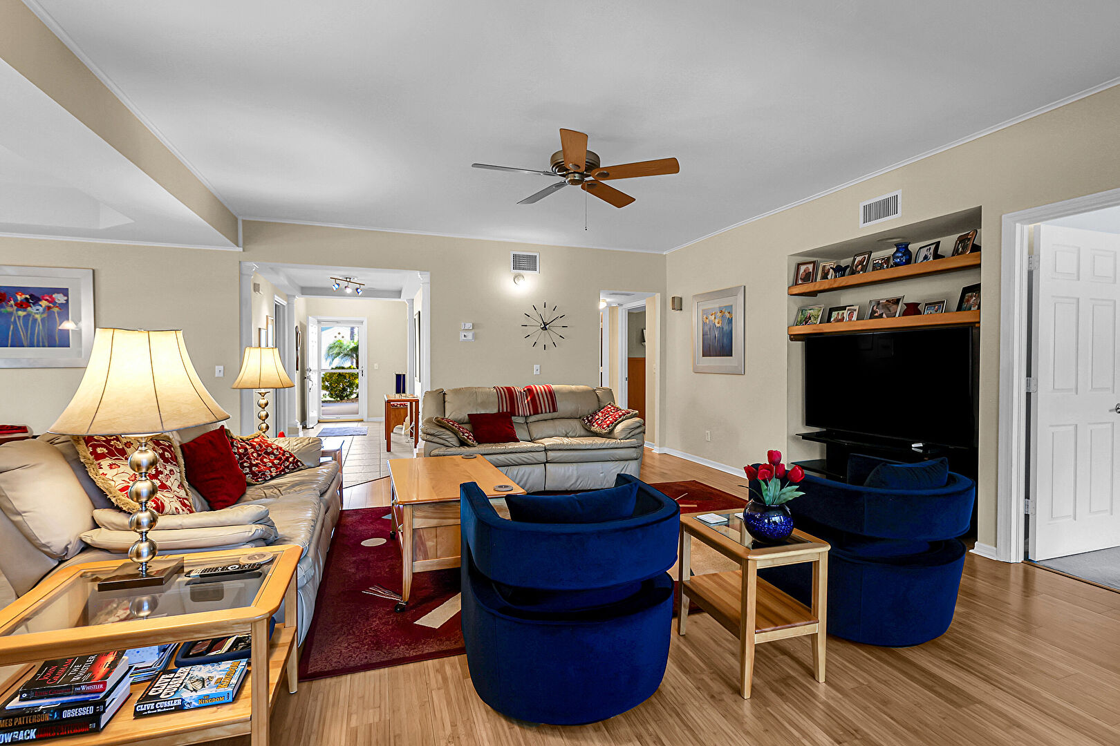 Baseboards Wall, Built In Shelves, Ceiling Fan, Crown Molding, Drywall, Natural Light, Sunroom, Tile Floor, Tray Ceiling, Vent, Wood Finish Floor, Baseboards Wall, Ceiling Fan, Crown Molding, Drywall, Notable Chandelier