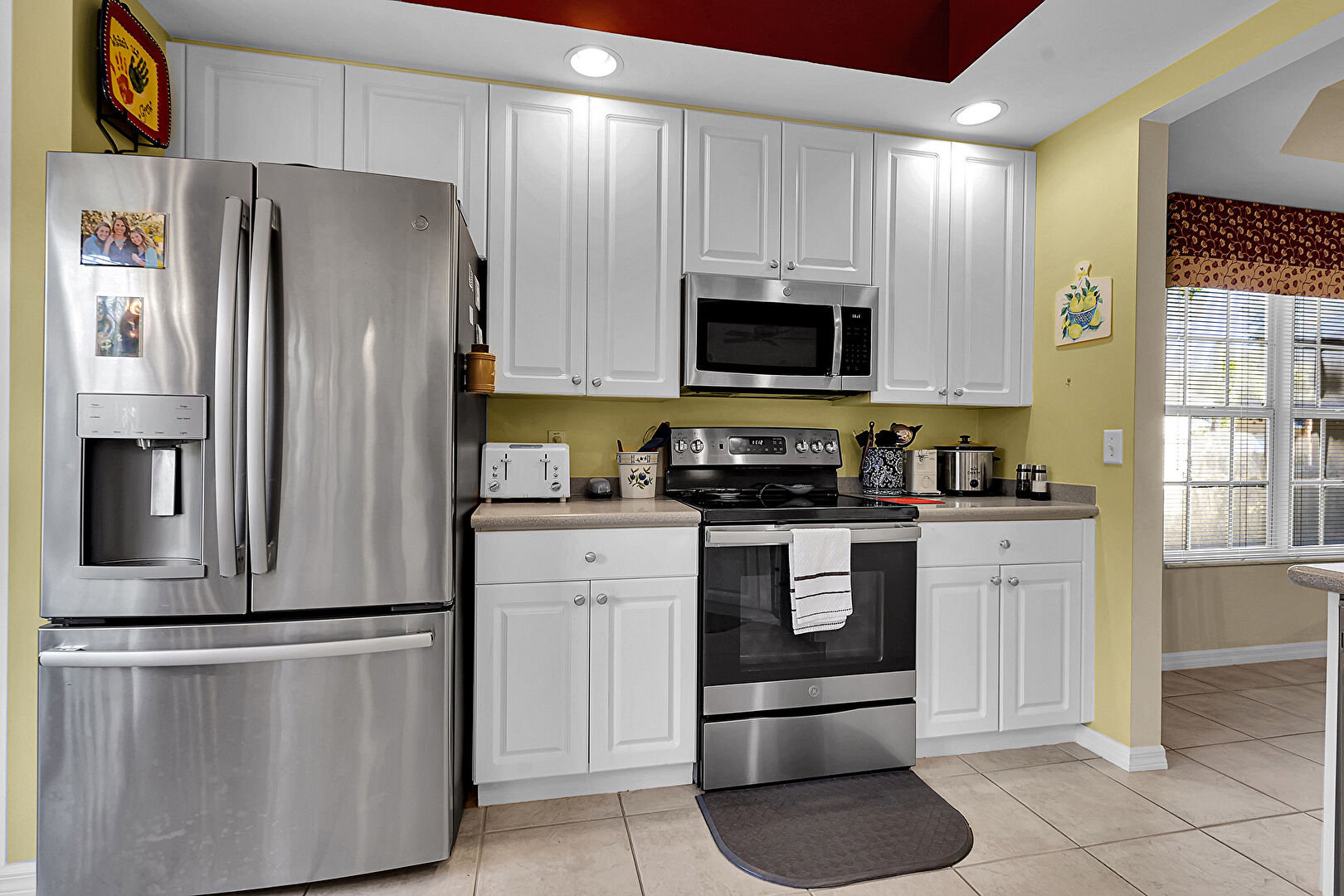 Baseboards Wall, Ceiling Fan, Drywall, Kitchen Peninsula, Natural Light, Notable Chandelier, Pendant Lighting, Raised Cabinets, Recessed Lighting, Stone Countertops, Tile Floor, Tray Ceiling, Vent, Drywall, Raised Cabinets, Toaster, Tray Ceiling