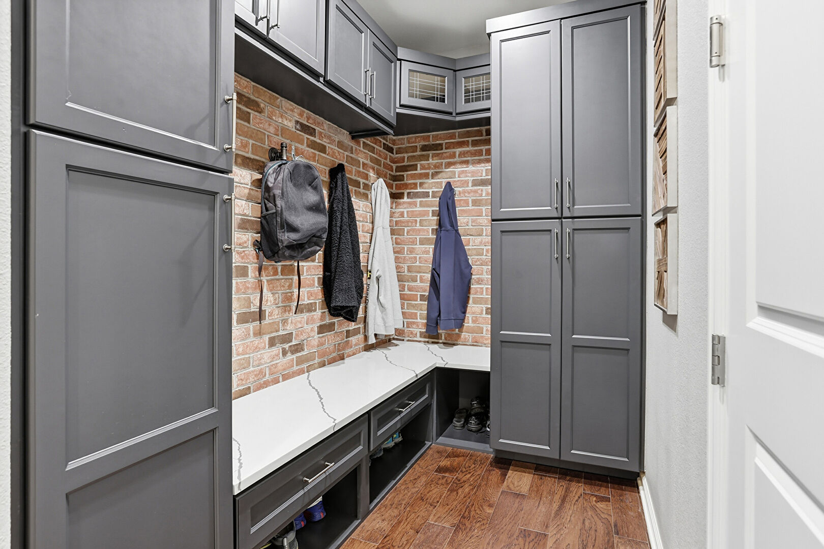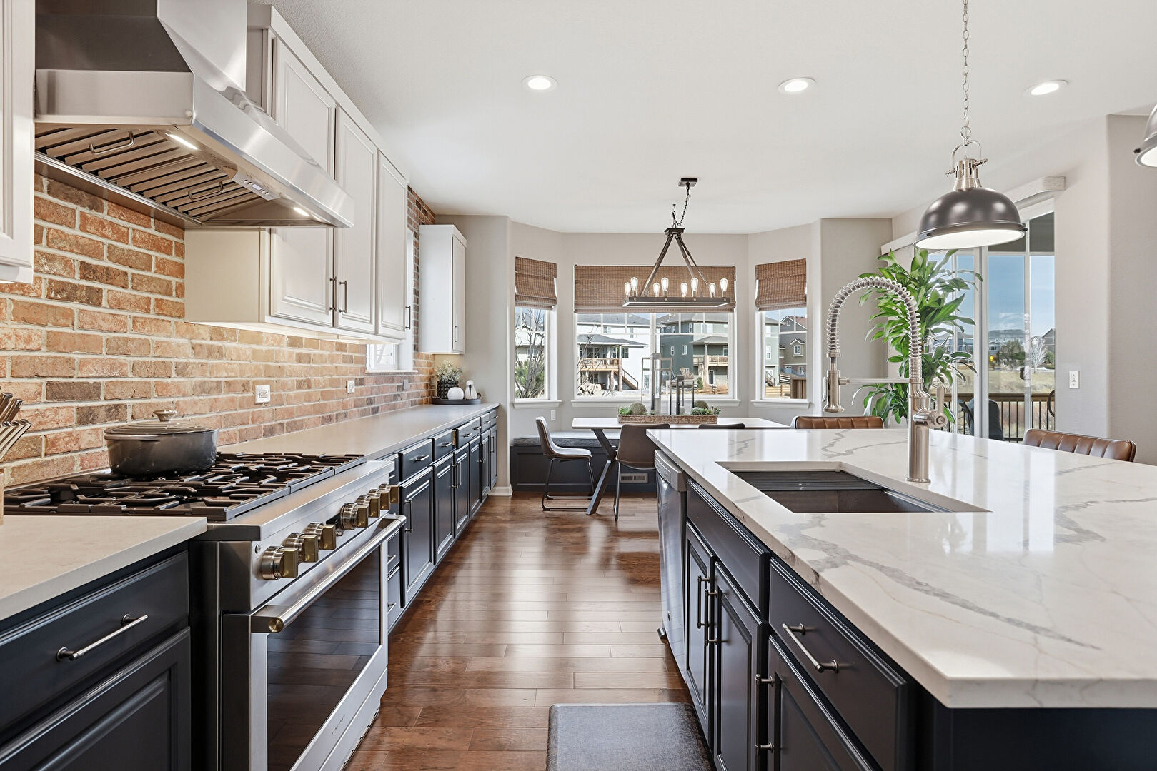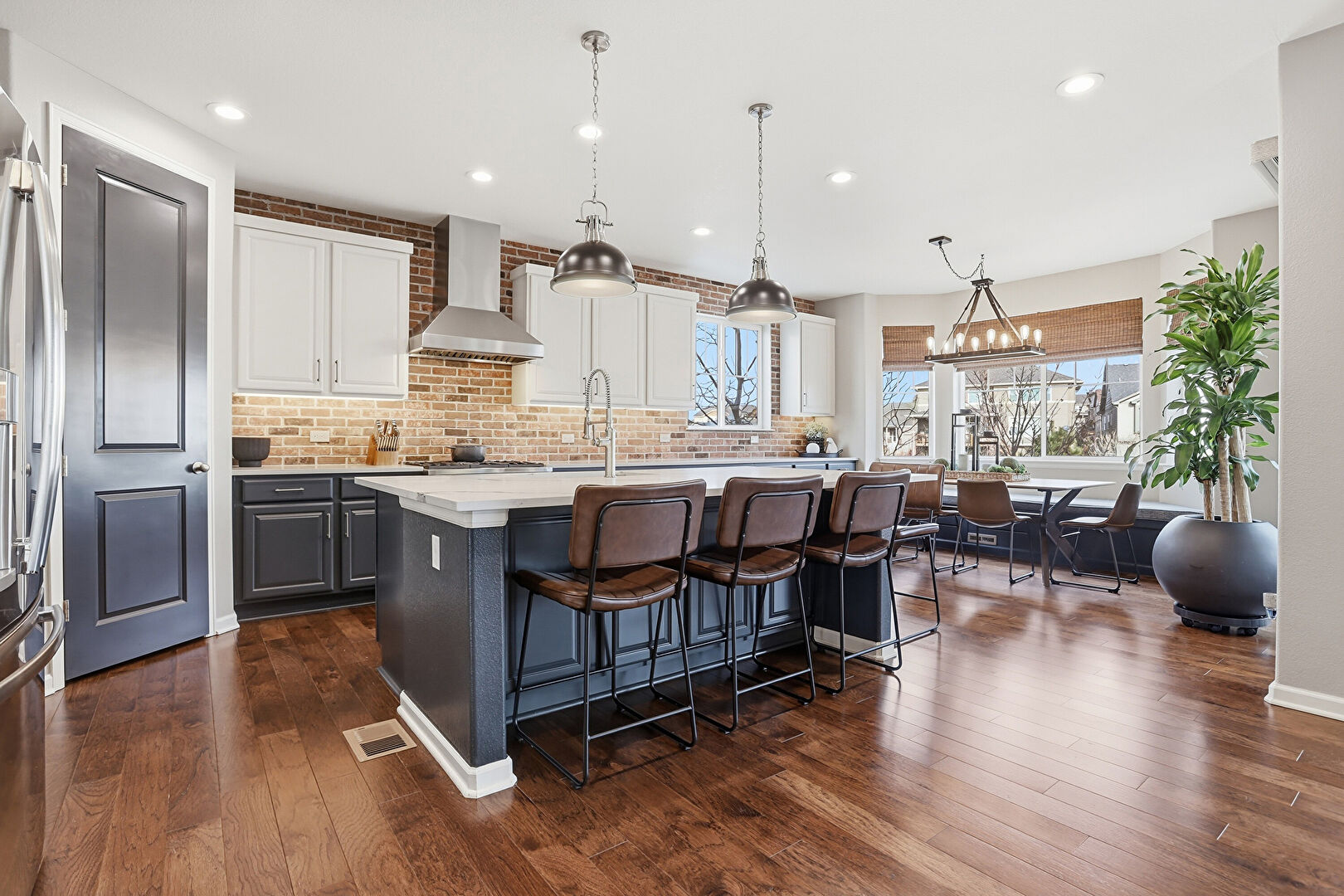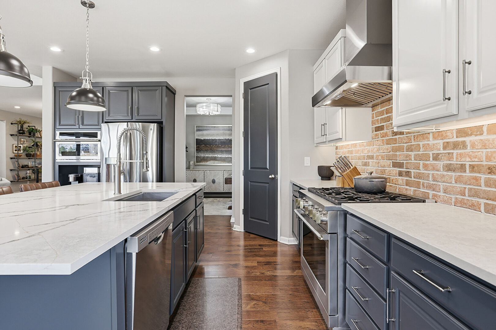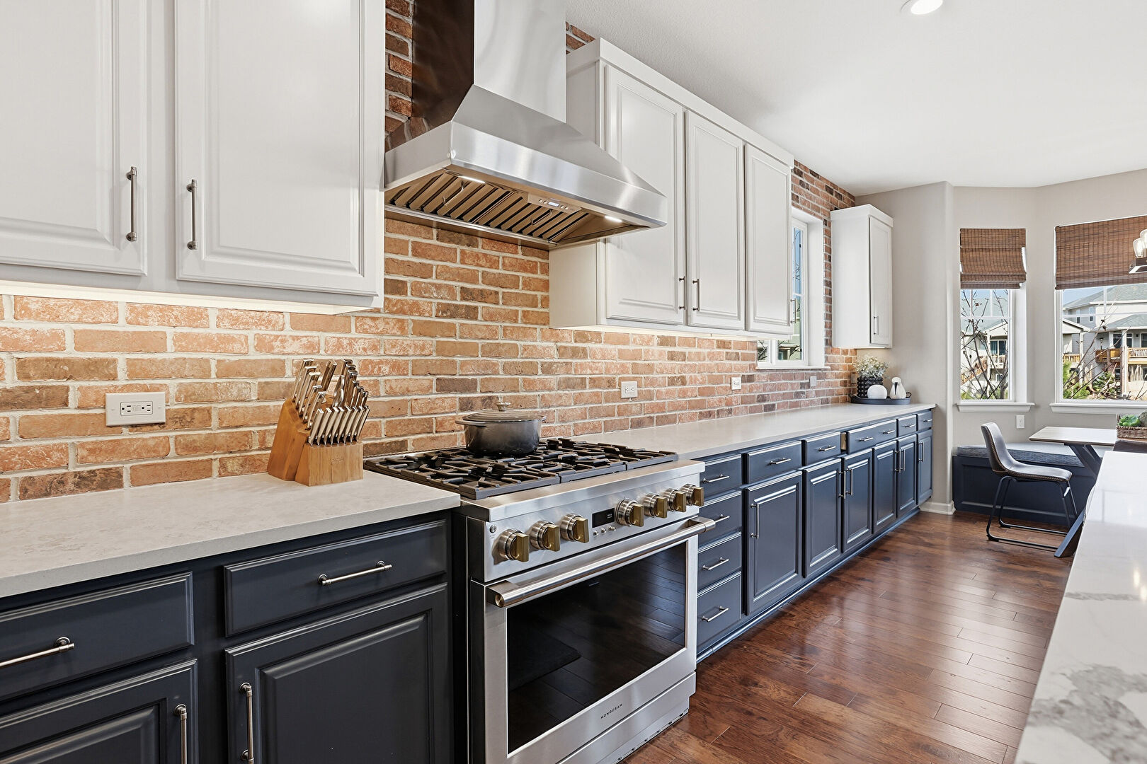 Baseboards Wall, Black Cabinets, Blue Cabinets, Brick Wall, Double Oven, Drywall, Fireplace, Gray Cabinets, Kitchen Bar, Kitchen Island, L Shaped Kitchen, Natural Light, Notable Chandelier, Opens To Living Area, Pendant Lighting, Raised Cabinets, Recessed Lighting, Shaker Cabinets, Stone Countertops, Tray Ceiling, Vent, Wood Finish Floor, Baseboards Wall, Drywall, Kitchen Island, Notable Chandelier, Stone Countertops, Wood Finish Floor