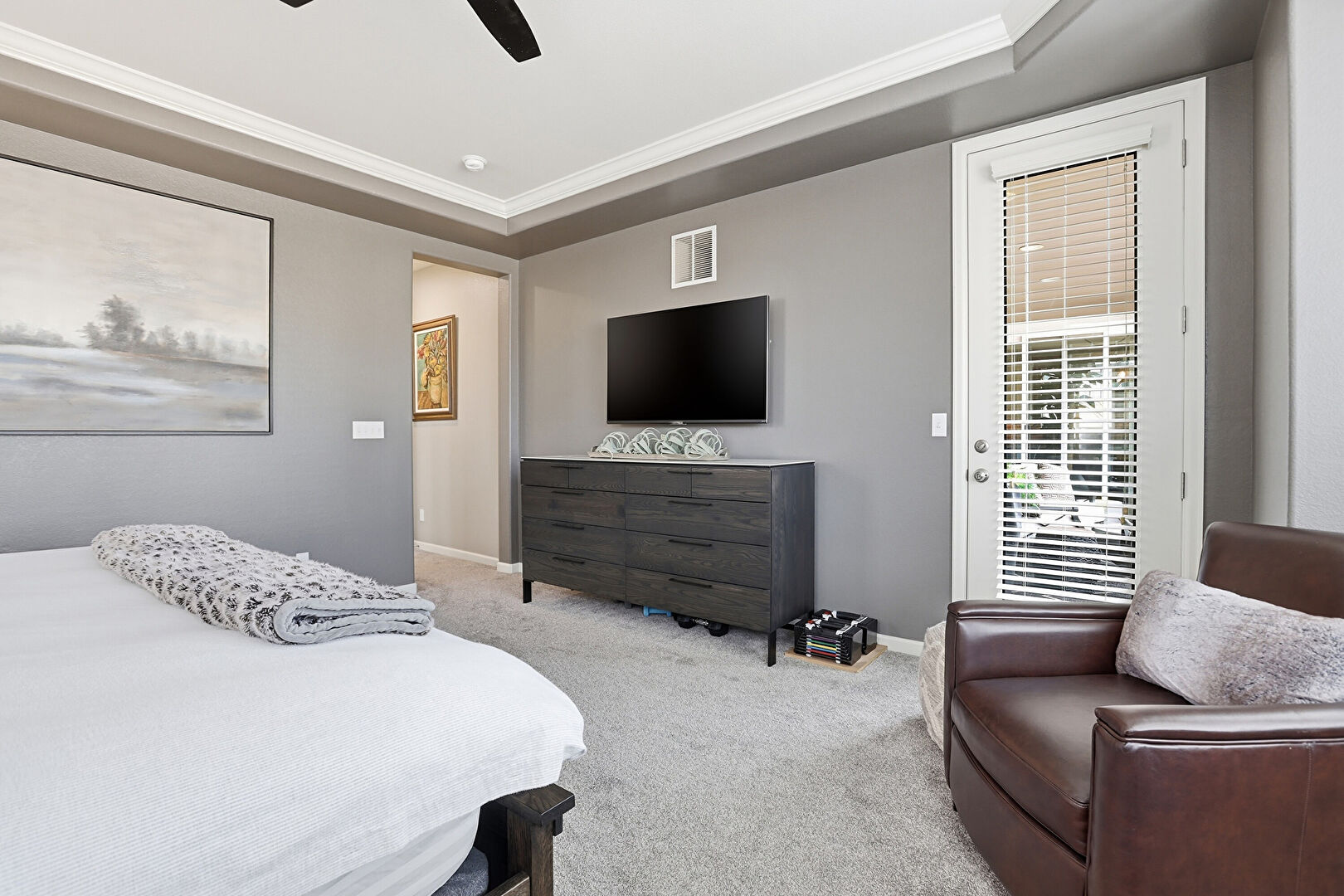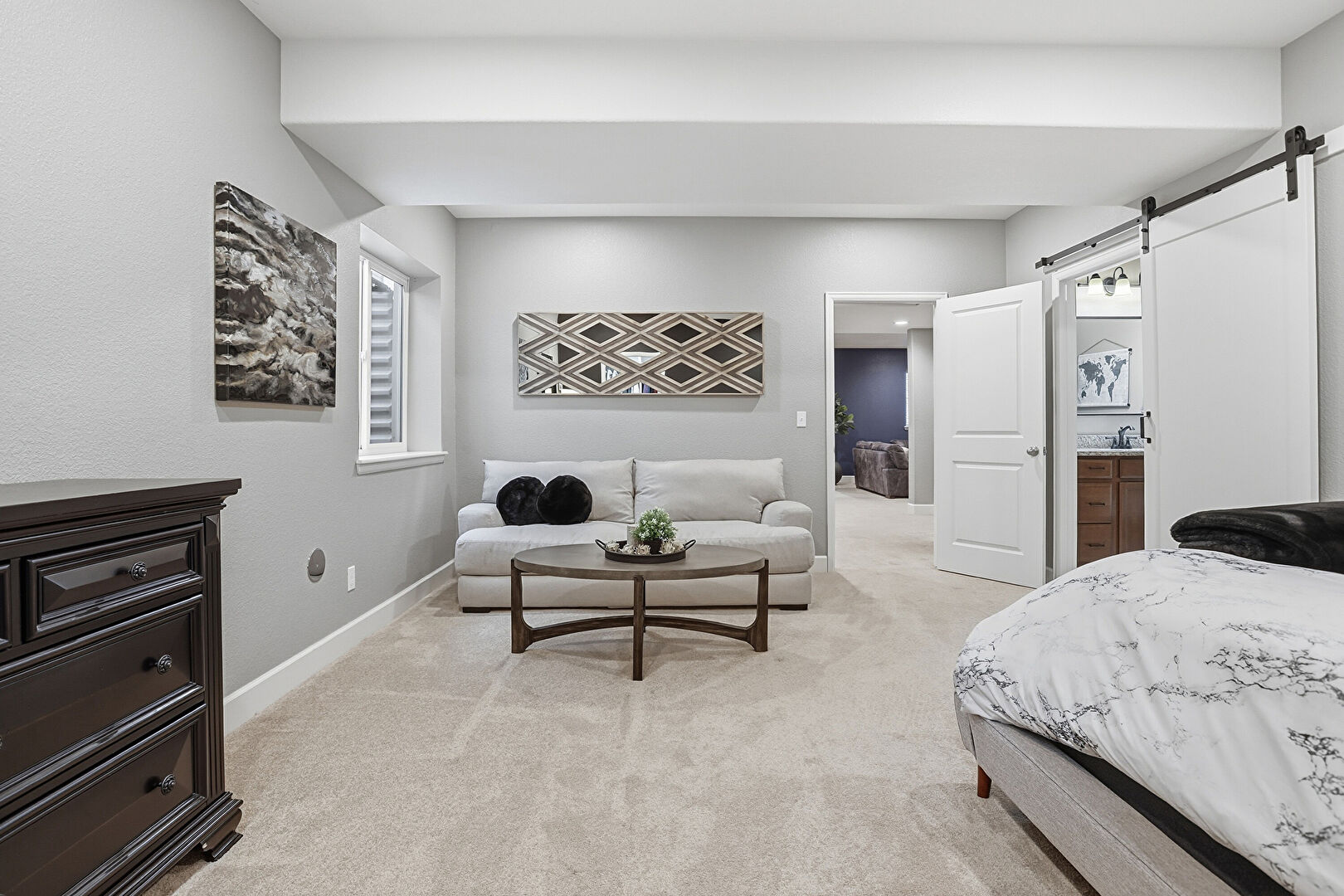Barn Door, Baseboards Wall, Beamed Ceiling, Carpet, Ceiling Fan, Crown Molding, Drywall, Ensuite Bathroom, Natural Light, Notable Chandelier, Recessed Lighting, Textured Wall, Tray Ceiling, Vent, Accent Wall, Access To Exterior, Baseboards Wall, Ceiling Fan, Office Area, Recessed Lighting
