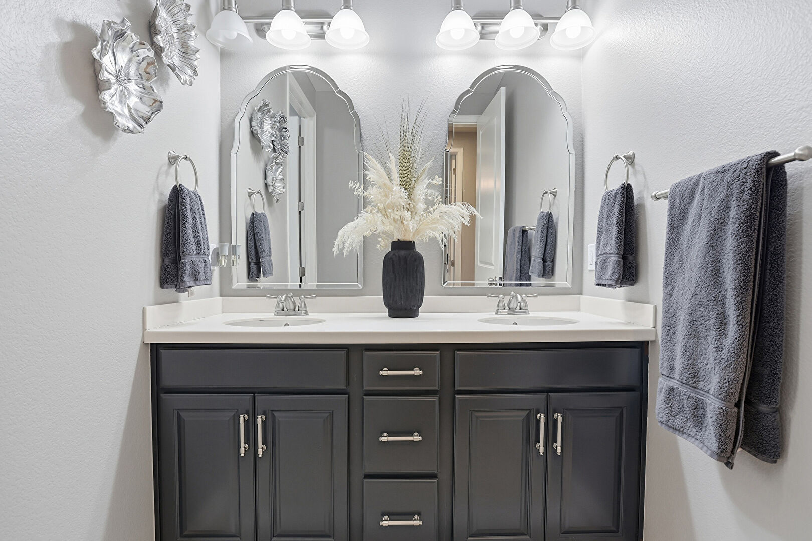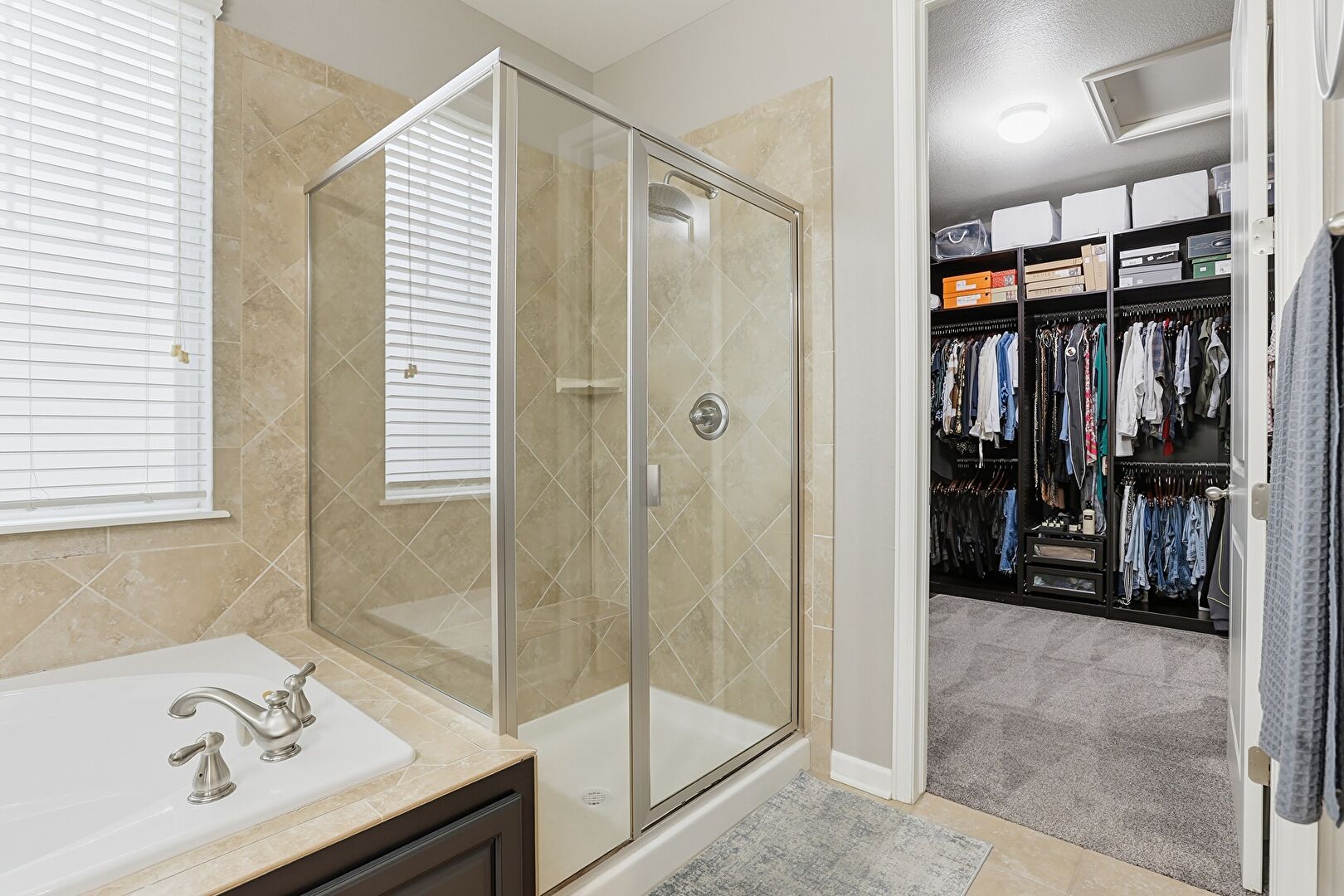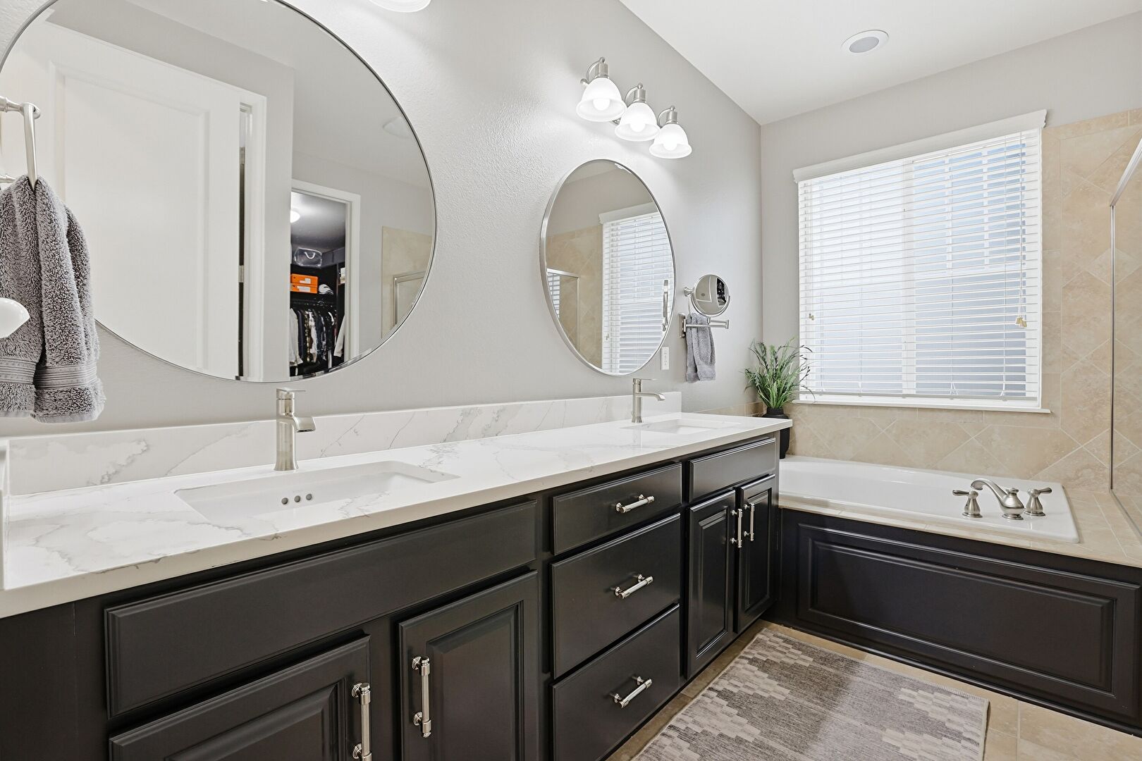 Baseboards Wall, Carpet, Double Vanity, Drywall, Ensuite Bathroom, Full Bathroom, Natural Light, Textured Wall, Tile Floor, Vanity, Walk In Closet, Baseboards Wall, Double Vanity, Drywall, Full Bathroom, Recessed Lighting, Vanity