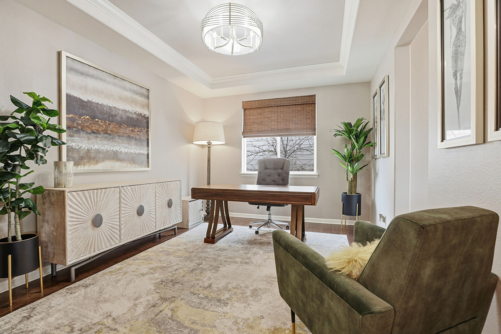 Baseboards Wall, Crown Molding, Drywall, Natural Light, Office Area, Tray Ceiling, Wood Finish Floor, Baseboards Wall, Notable Chandelier