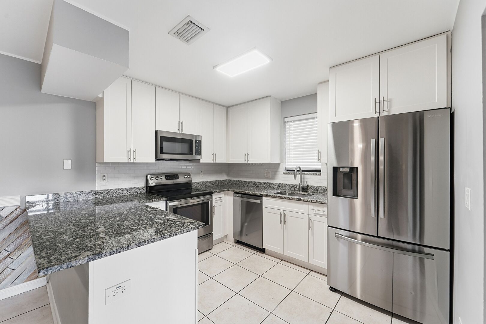 Drywall, Kitchen Bar, Kitchen Peninsula, Laundry, Shaker Cabinets, Stone Countertops, Tile Floor, U Shaped Kitchen, Vent, Wainscot Wall, Baseboards Wall, Natural Light, Tile Floor