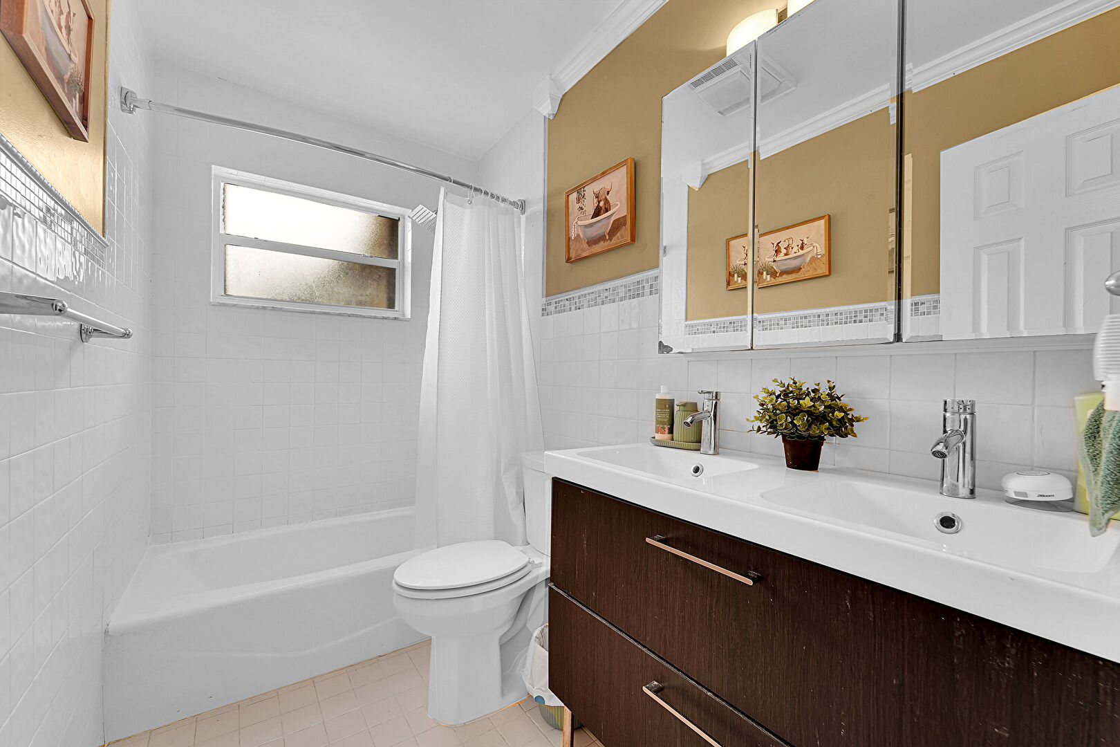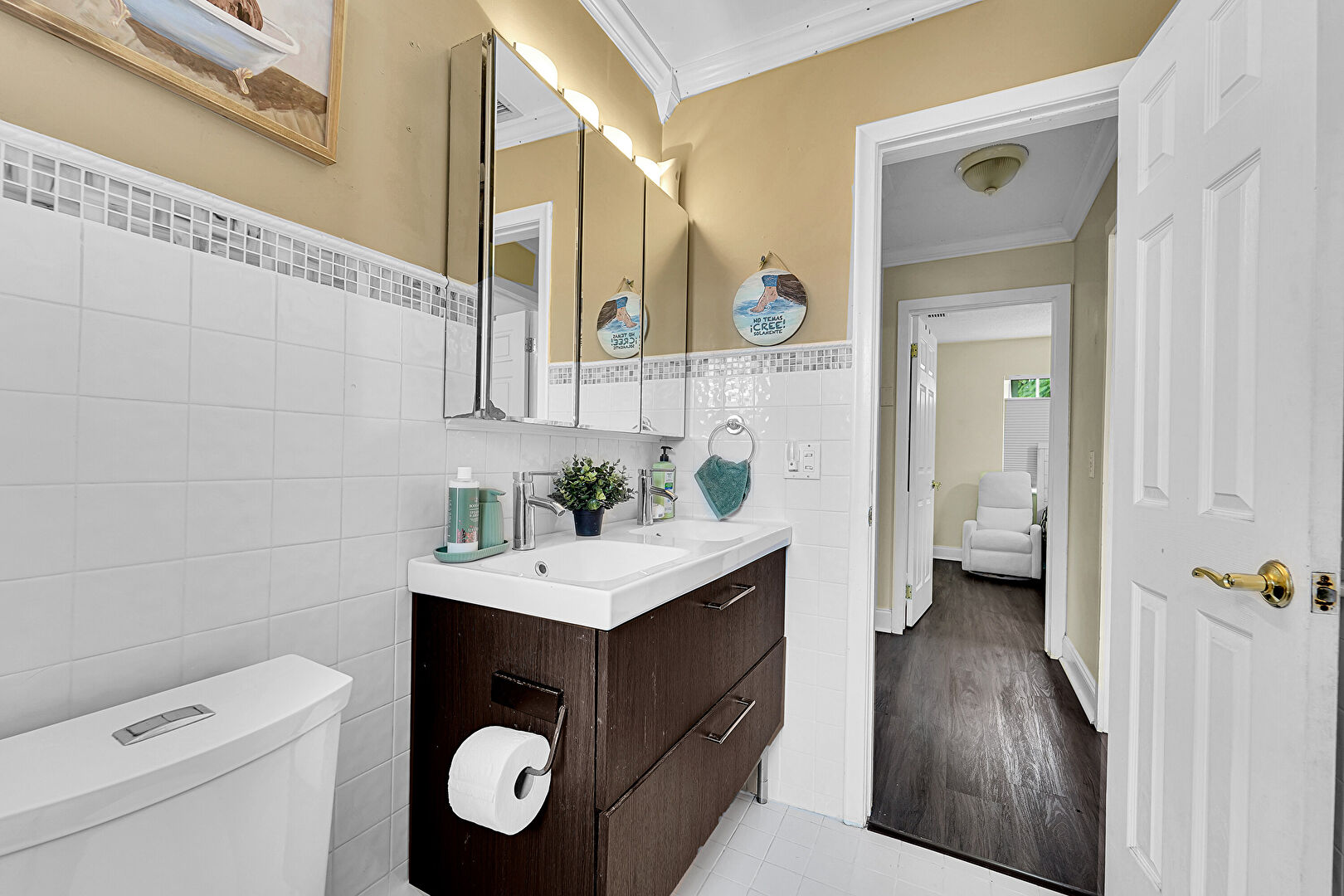 Baseboards Wall, Crown Molding, Double Vanity, Drywall, Full Bathroom, Half Bathroom, Natural Light, Tile Wall, Vanity, Vent, Vinyl Floor, Wainscot Wall, Wood Finish Floor, Combined Bath Shower, Tile Floor